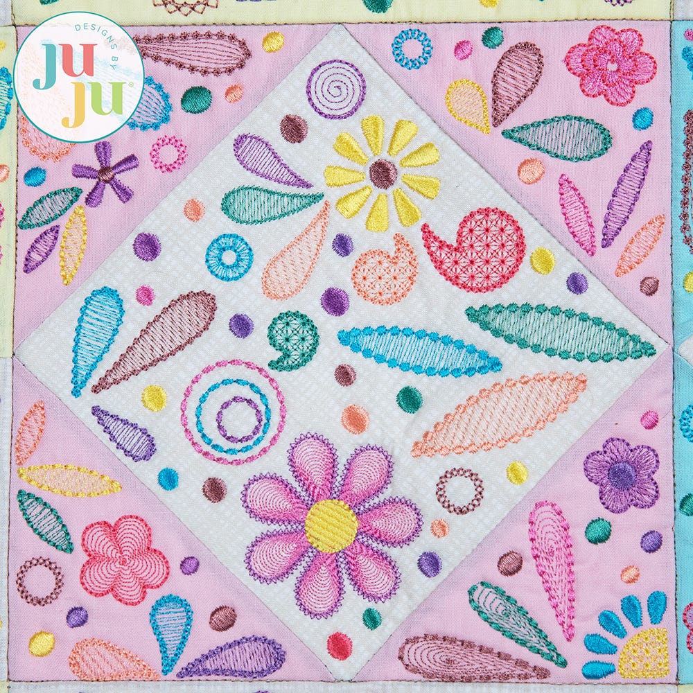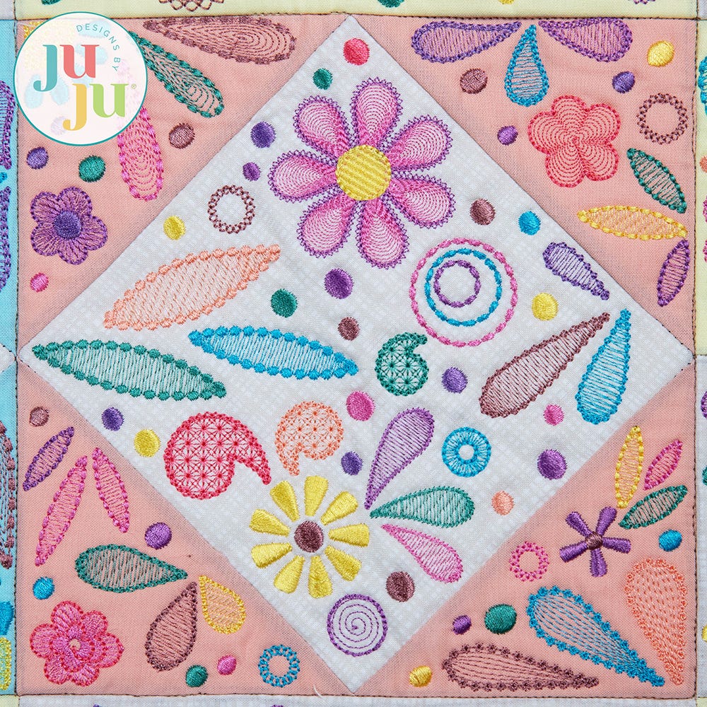 The finished project as pictured is made of six main "diamond in a square" blocks with rectangular and square sashing and border blocks. Due to the airy nature of the fills, we recommend light, tone-on-tone fabrics for the background so the delicate embroidered details pop.