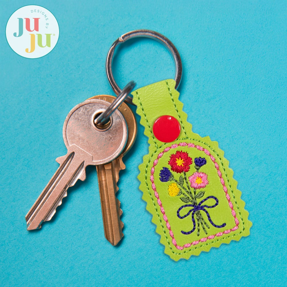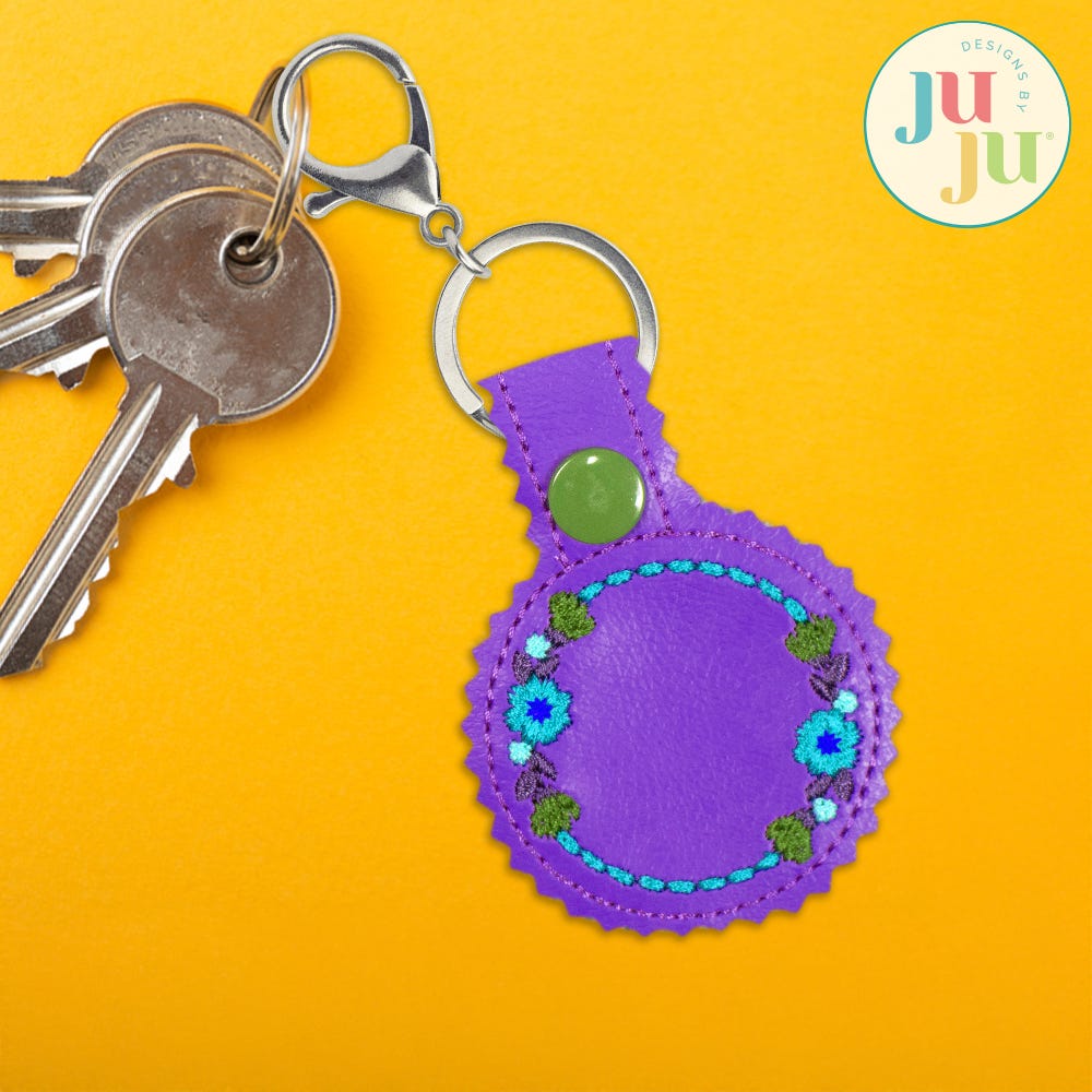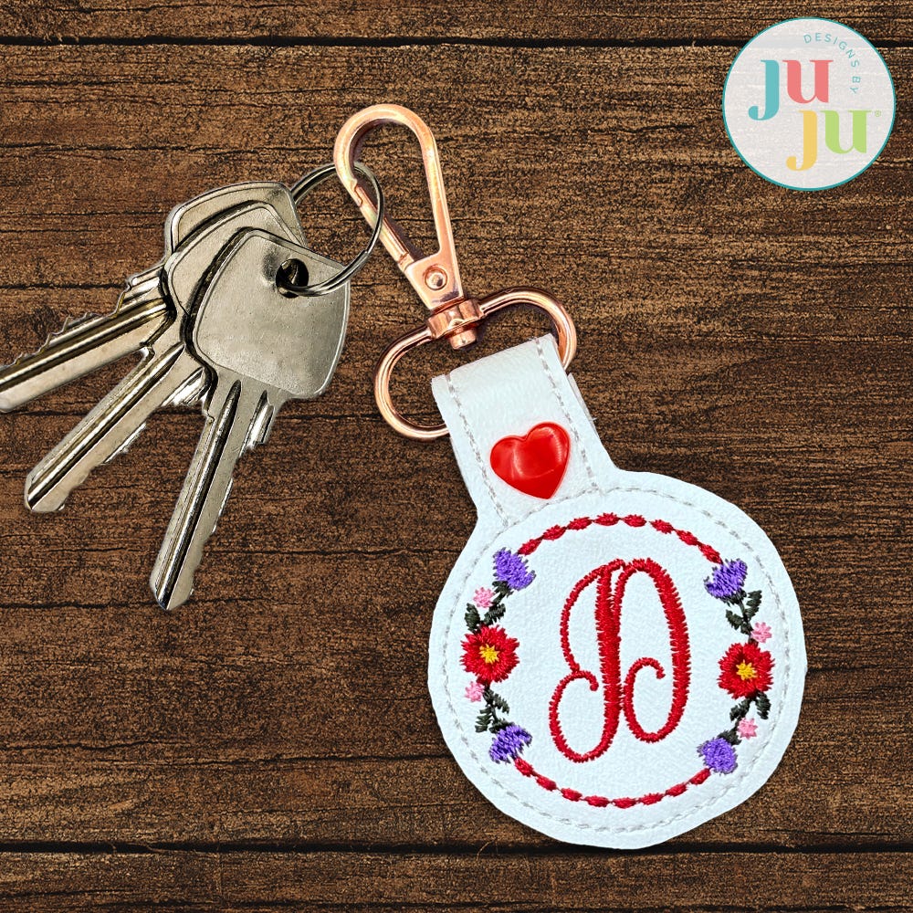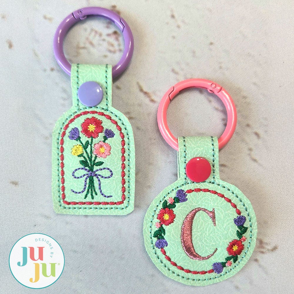 Personalize and keep track of your keys with our beautiful Floral Key Fobs! This set includes two designs; the arched key fob features a beautiful bouquet, while the round key fob has an open floral wreath, ideal for adding an initial with the font of your choice. These coordinate perfectly with our Floral Zipper Bag and other Heirloom Garden designs.