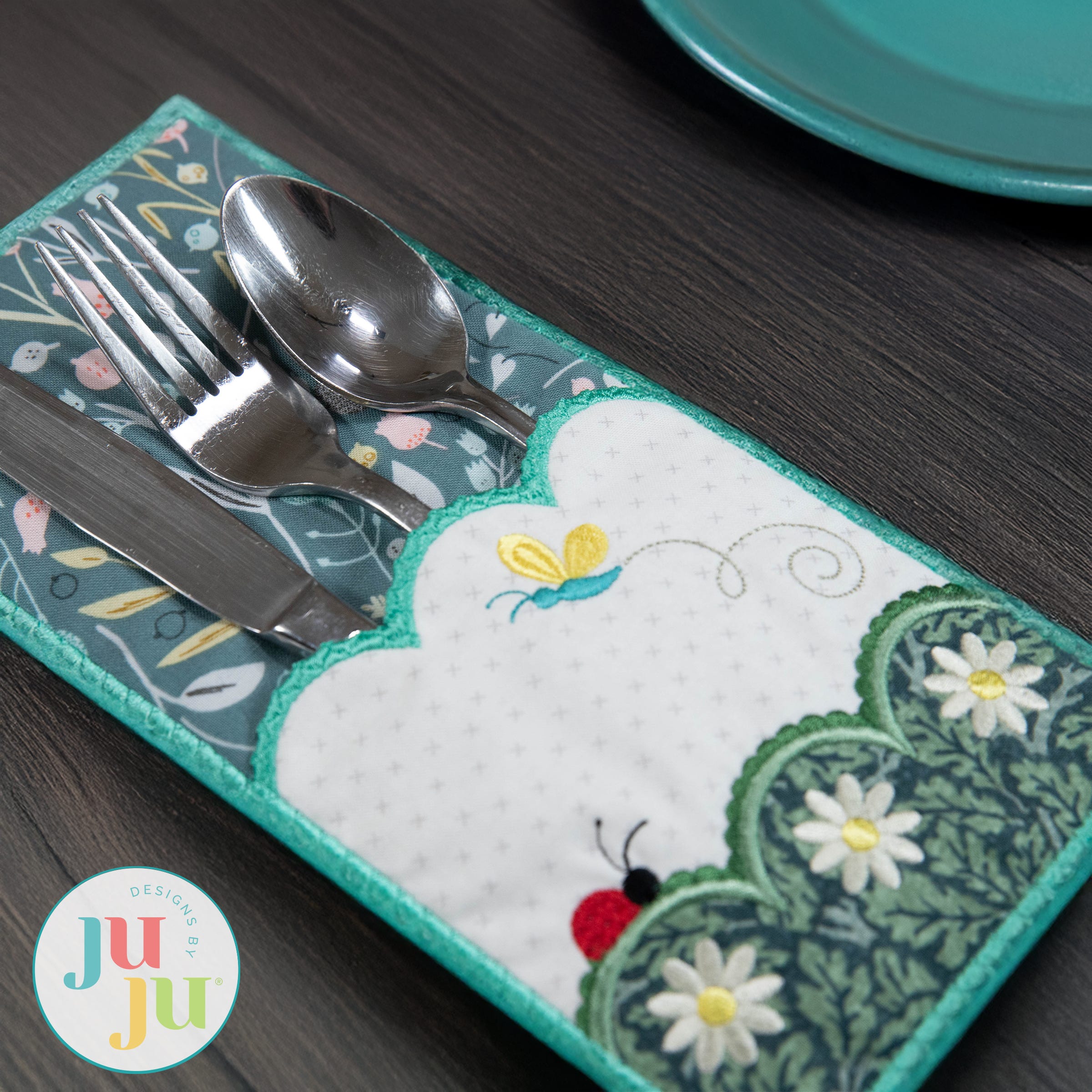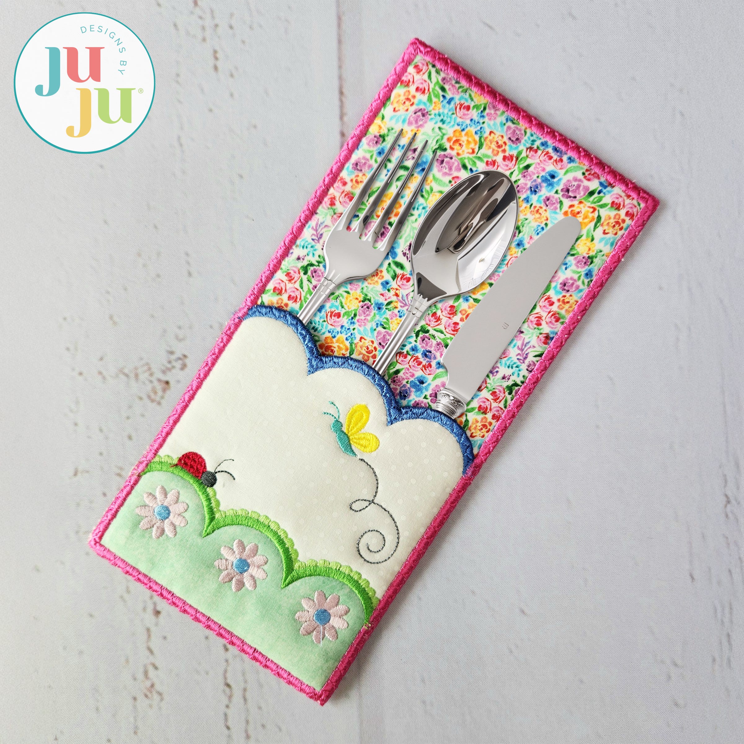 Keep your dining table elegant and silverware organized with a beautifully embroidered utensil holder! Featuring intricate stitched details, it adds both charm and functionality to your table setting. Our Flowers and Ladybug Utensil Holder is designed to coordinate with our Modular Watering Can in-the-hoop project series.
