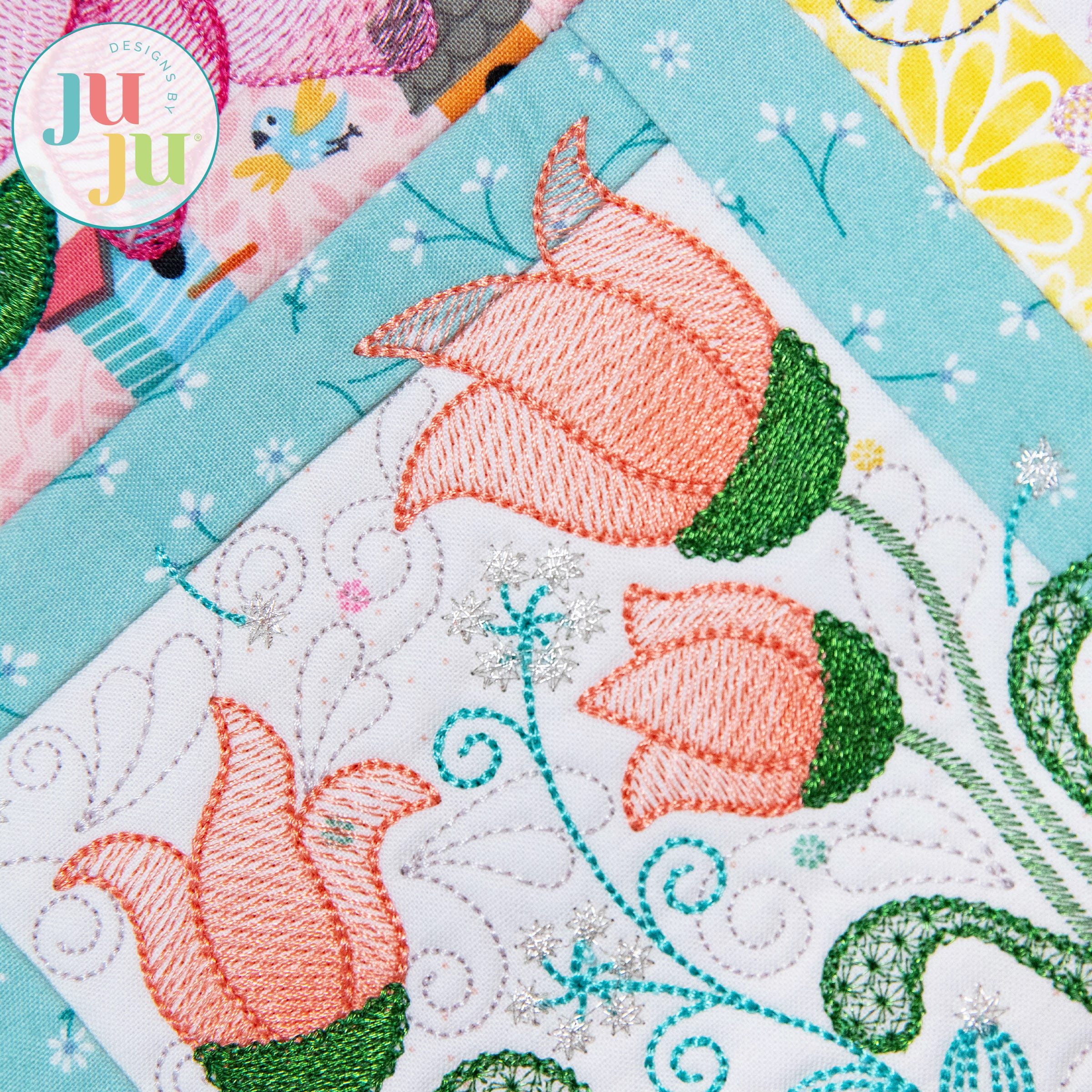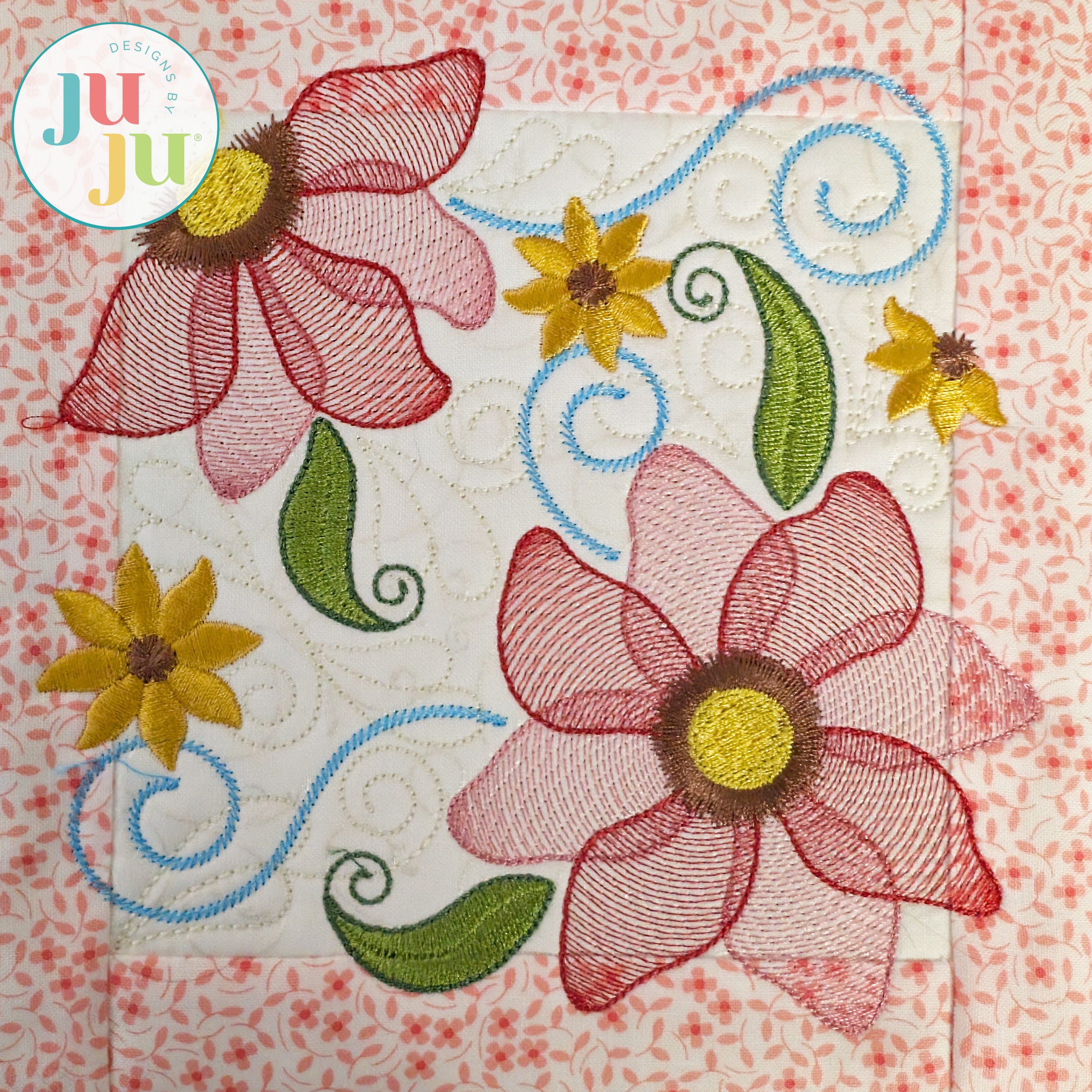 The floral designs feature a mix of sketch and motif fills; therefore we highly recommend using a light solid or tone-on-tone print for the background fabric of the block, allowing the design details to pop!