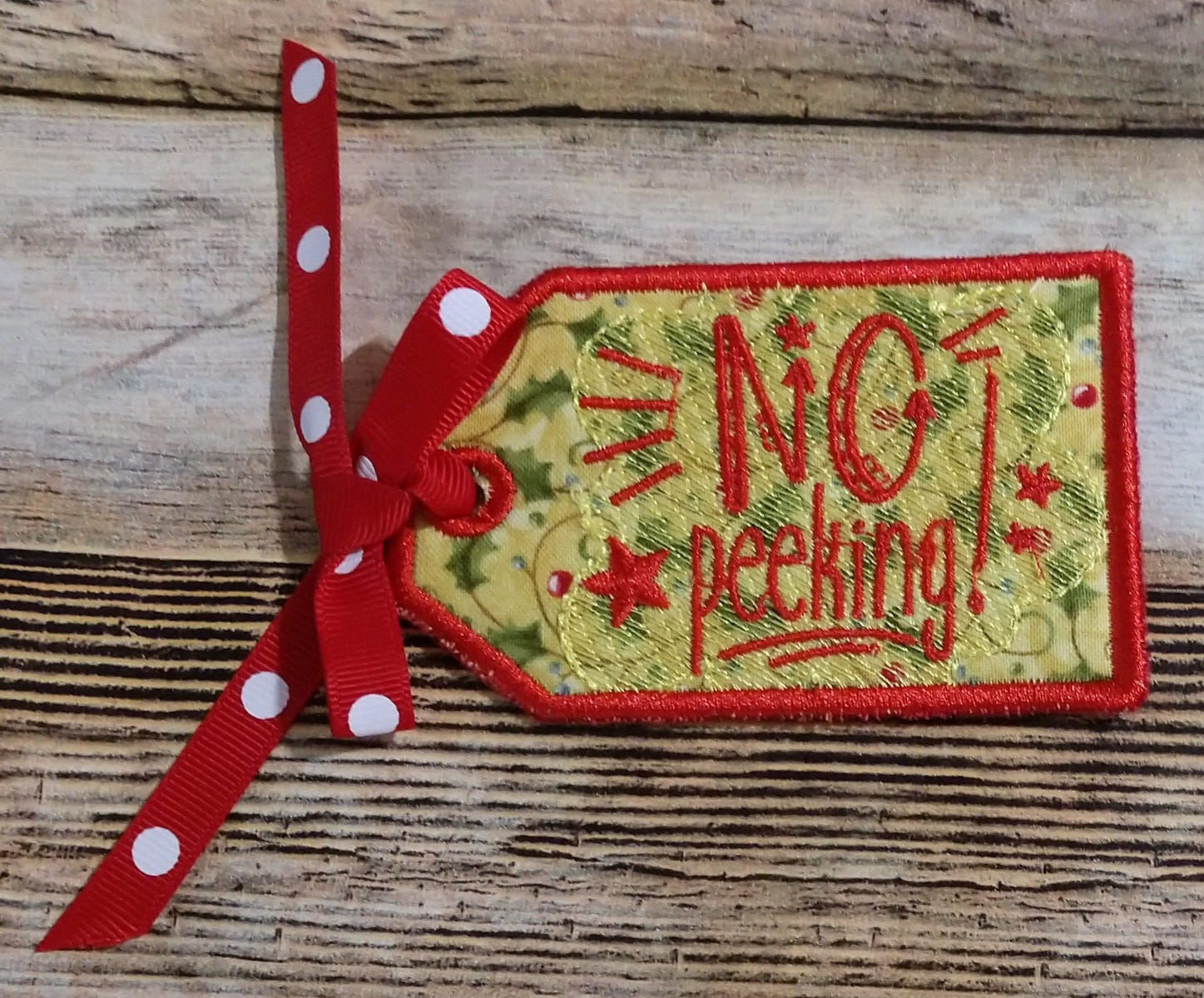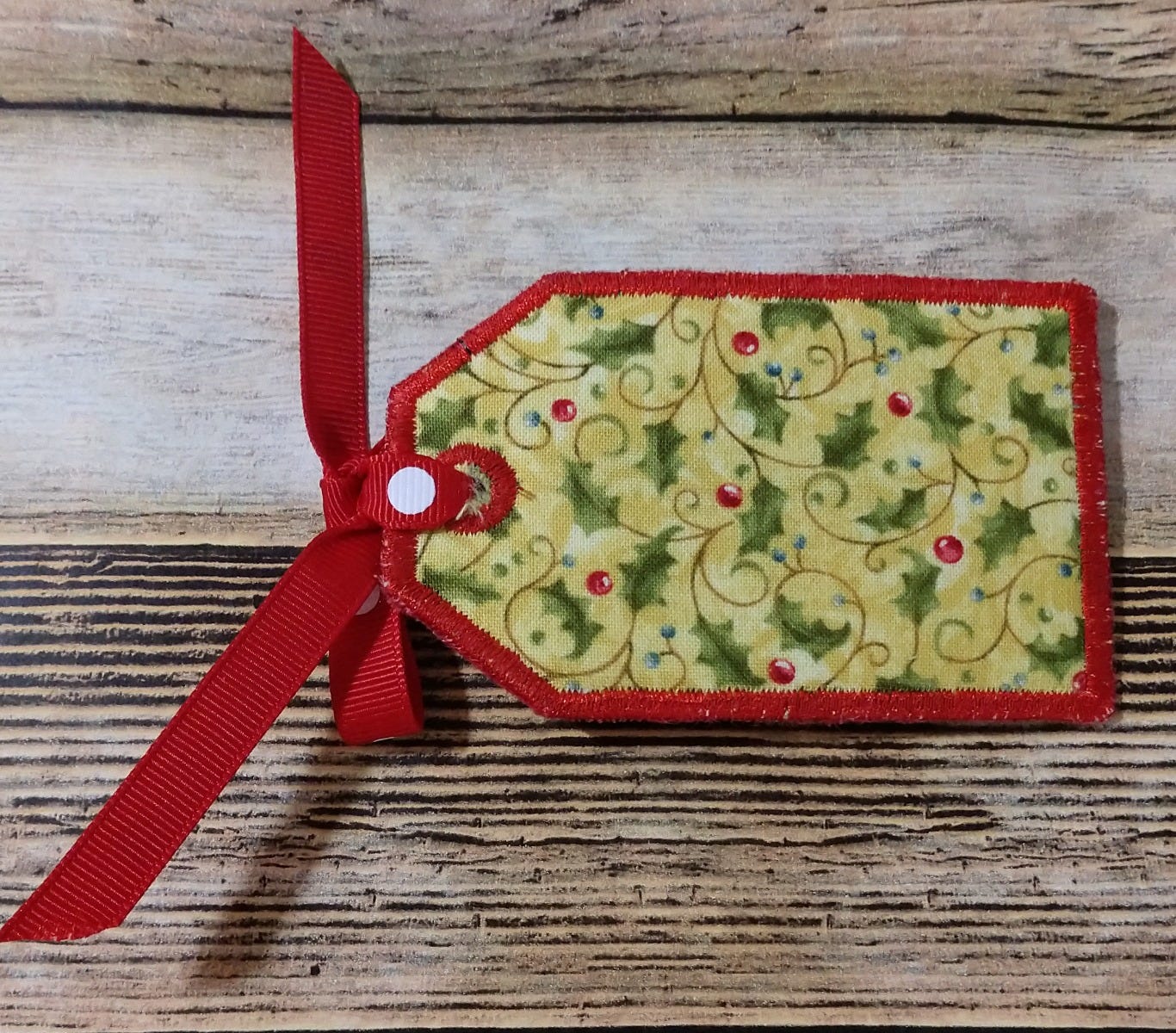 The tags can be made a few different ways including a front and back with decorative cut edge, front and back with clean satin stitch edge, and an optional tag with a pocket on the back to add a gift card. Complete instructions included.