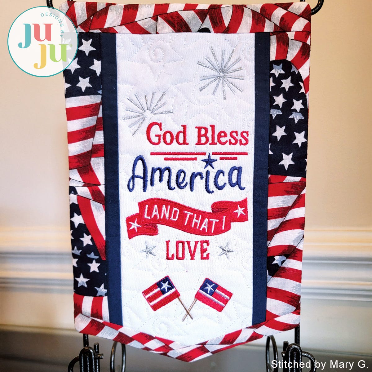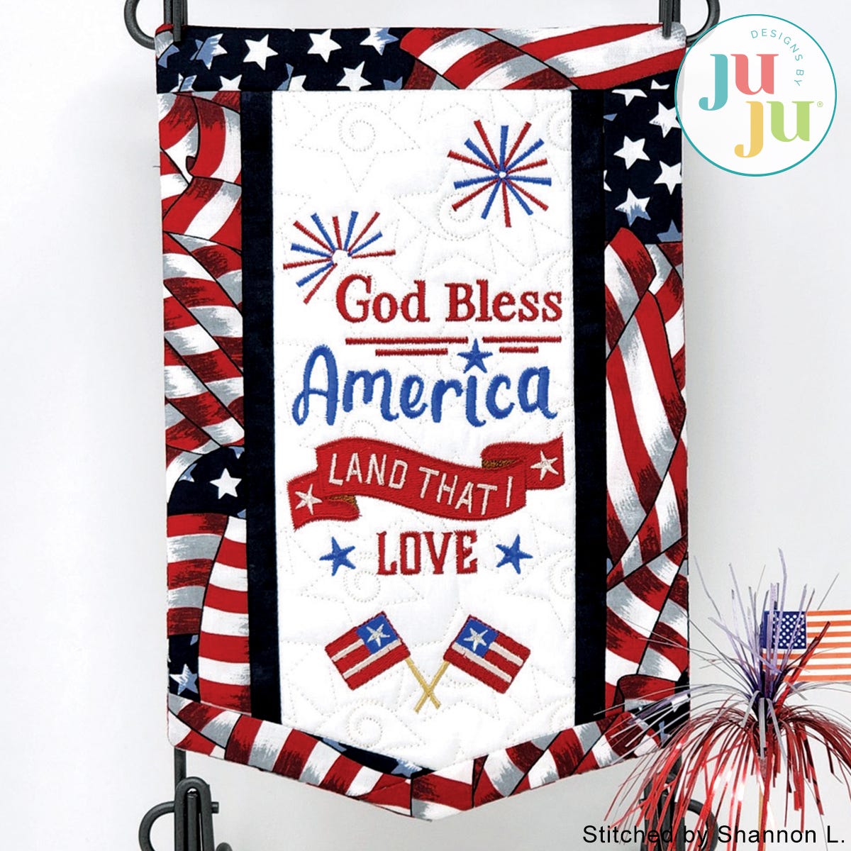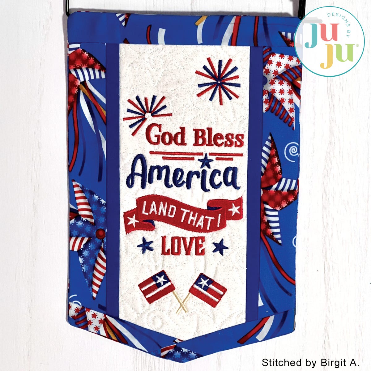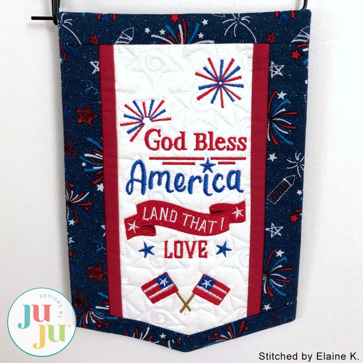 Decorate your home with a patriotic touch with this beautiful banner. The background is quilted in a star pattern and the various borders get attached during the embroidery. There is a "sleeve" in the back for hanging the quilt. The sleeve, too, is applied during the embroidery process. No additional hand or sewing machine stitching required.
