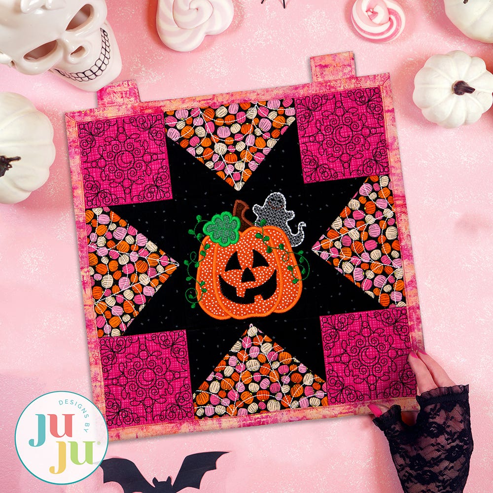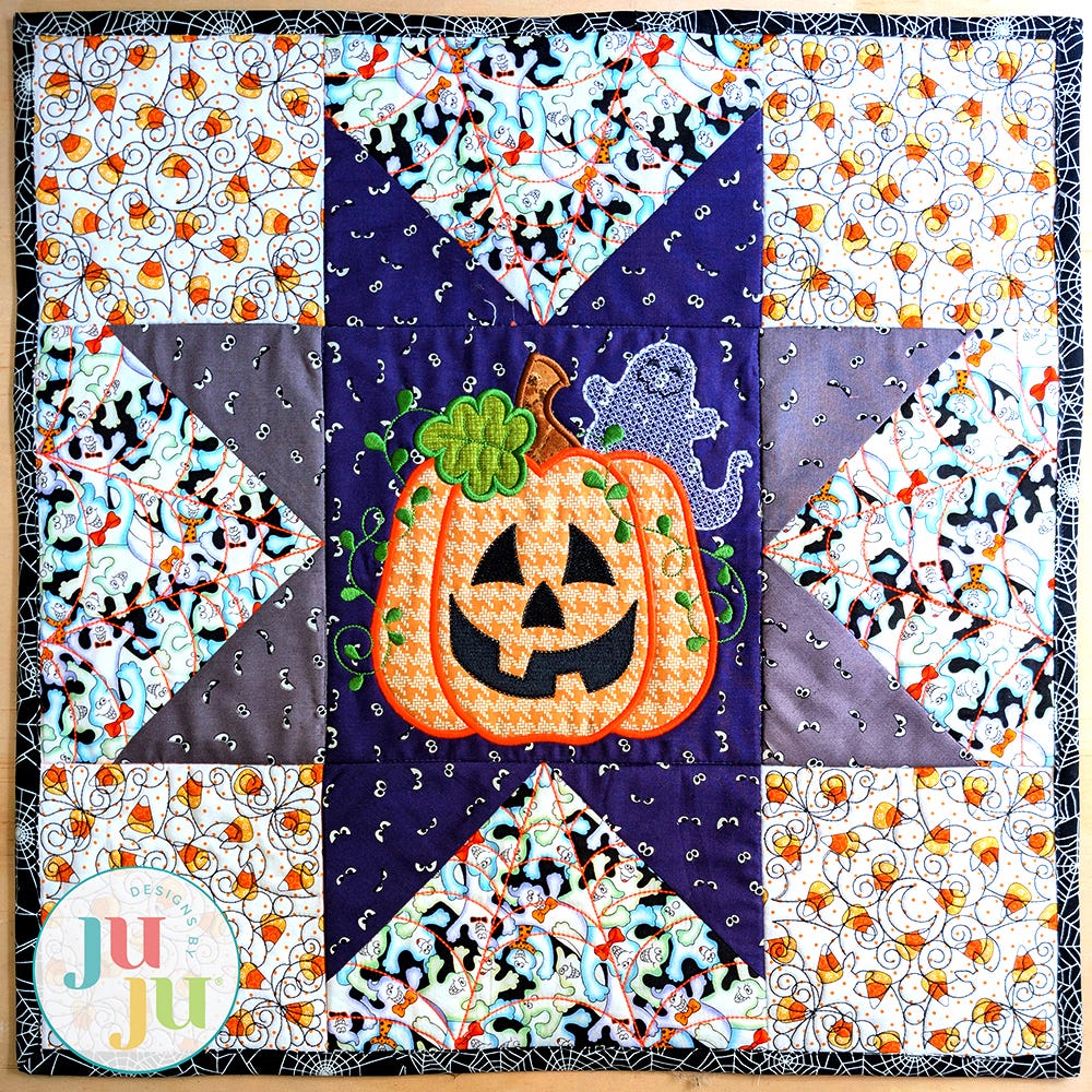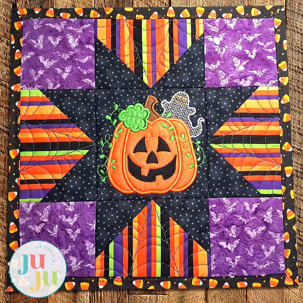 Add a spooky touch to your Halloween decor with our charming new mini quilt! This project is similar to a large sawtooth star quilt block. The center features an applique Jack-o'-lantern with a motif filled ghost. It's the perfect size for a little table decoration. Add tabs for a wall hanging, or make it a pillow!