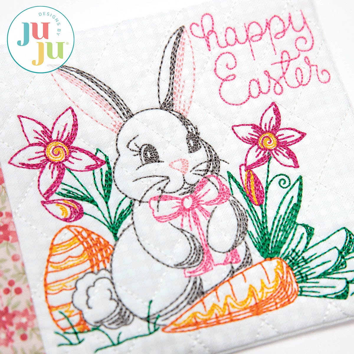 Our Happy Easter Bunny Mug Rug is a perfect springtime decoration for your coffee table. This mug rug features bean stitch lettering and details for a sweet vintage look. Available in five hoop sizes: 5x7 hoop, 6x10 hoop, 7x12 hoop, 8x12 hoop, and 9.5x14 hoop.