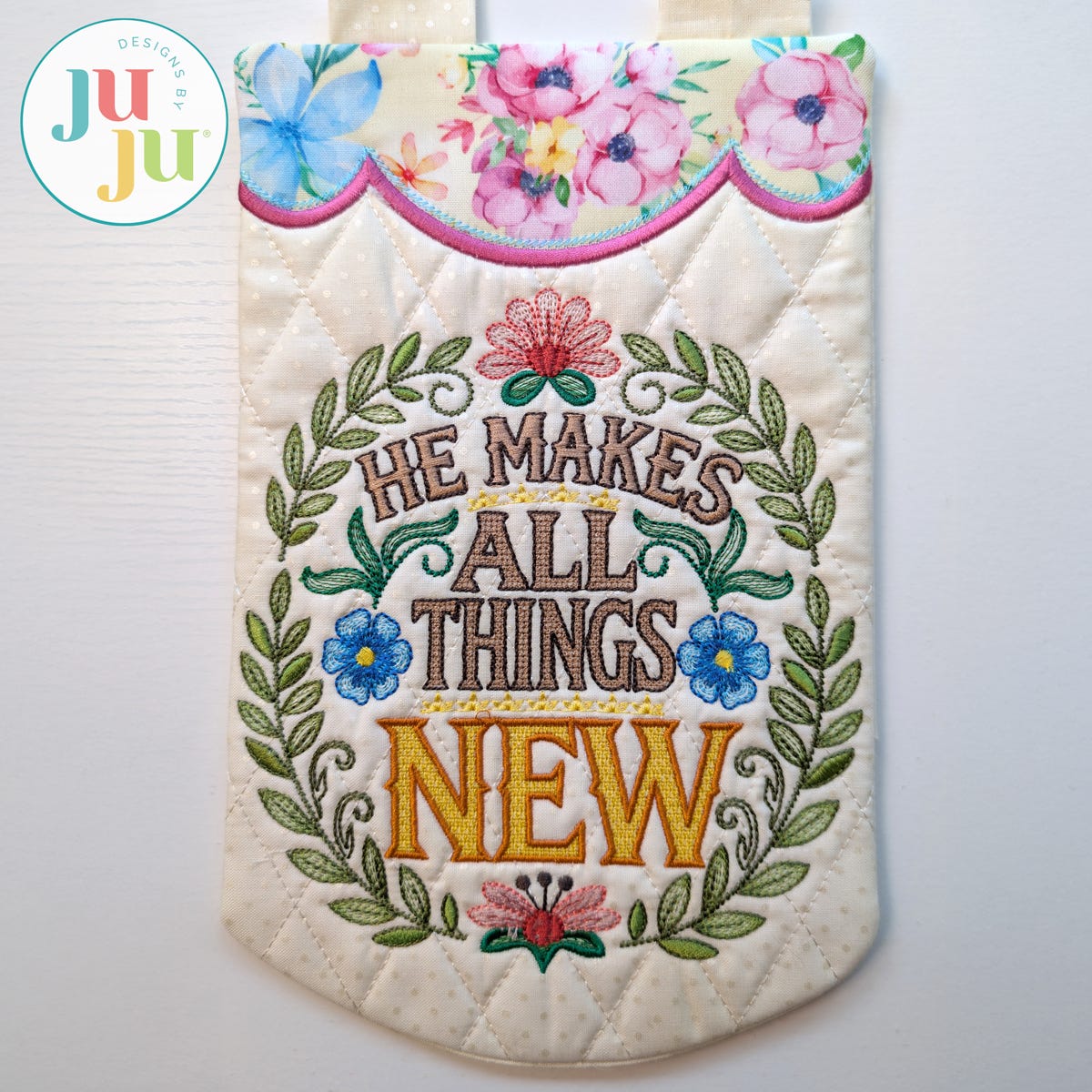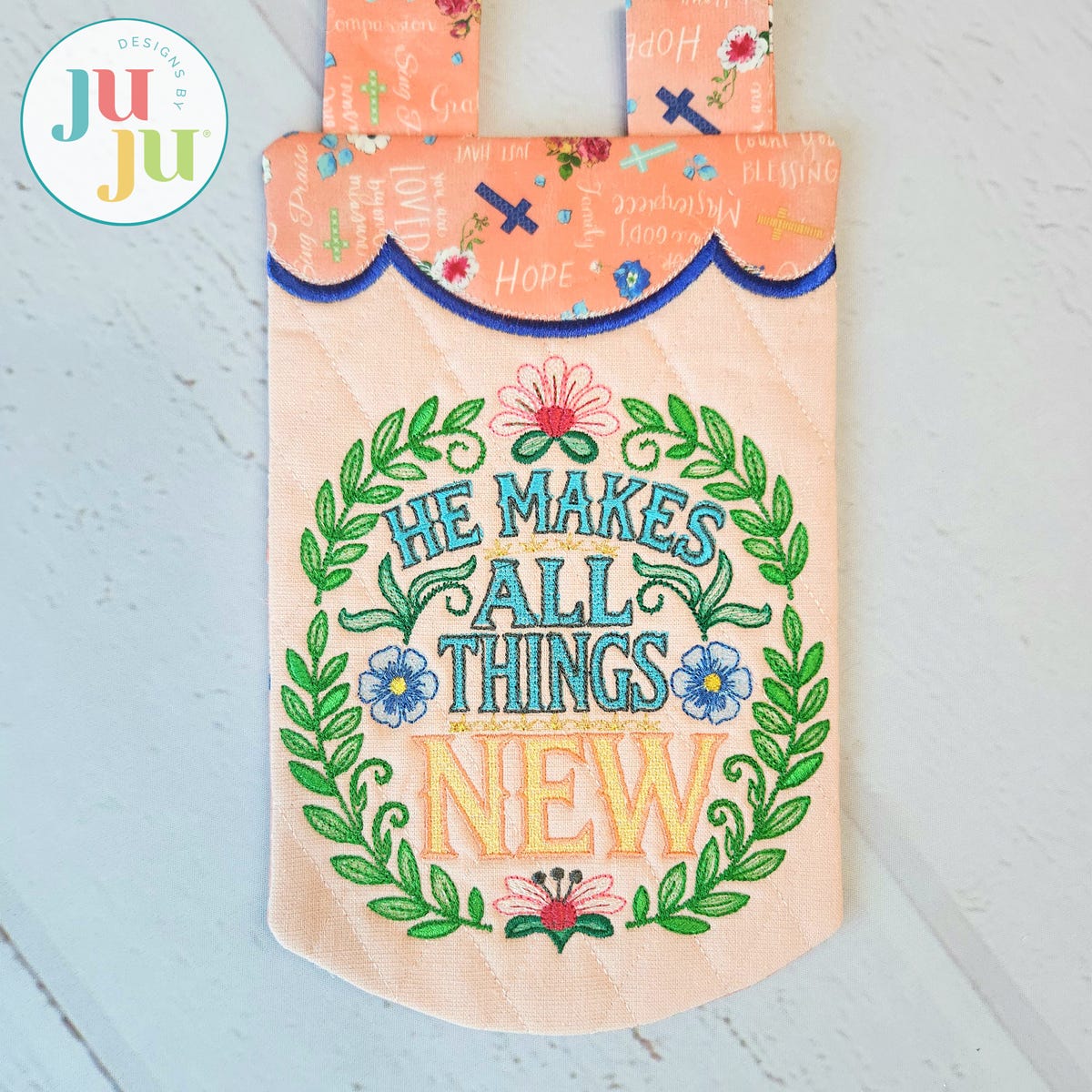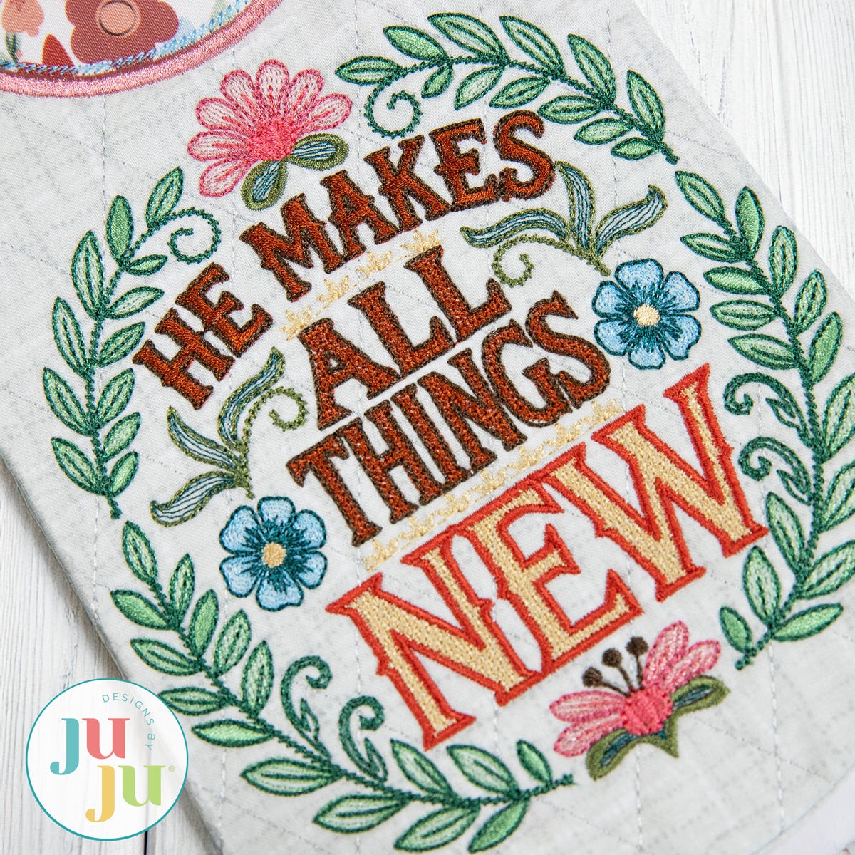 Our "He Makes All Things New" in the hoop miniature wall hanging or desk decor is the perfect way to decorate your space with an encouraging message! The embroidered text design features satin stitch and motif fill lettering with sketch and bean stitch accents.