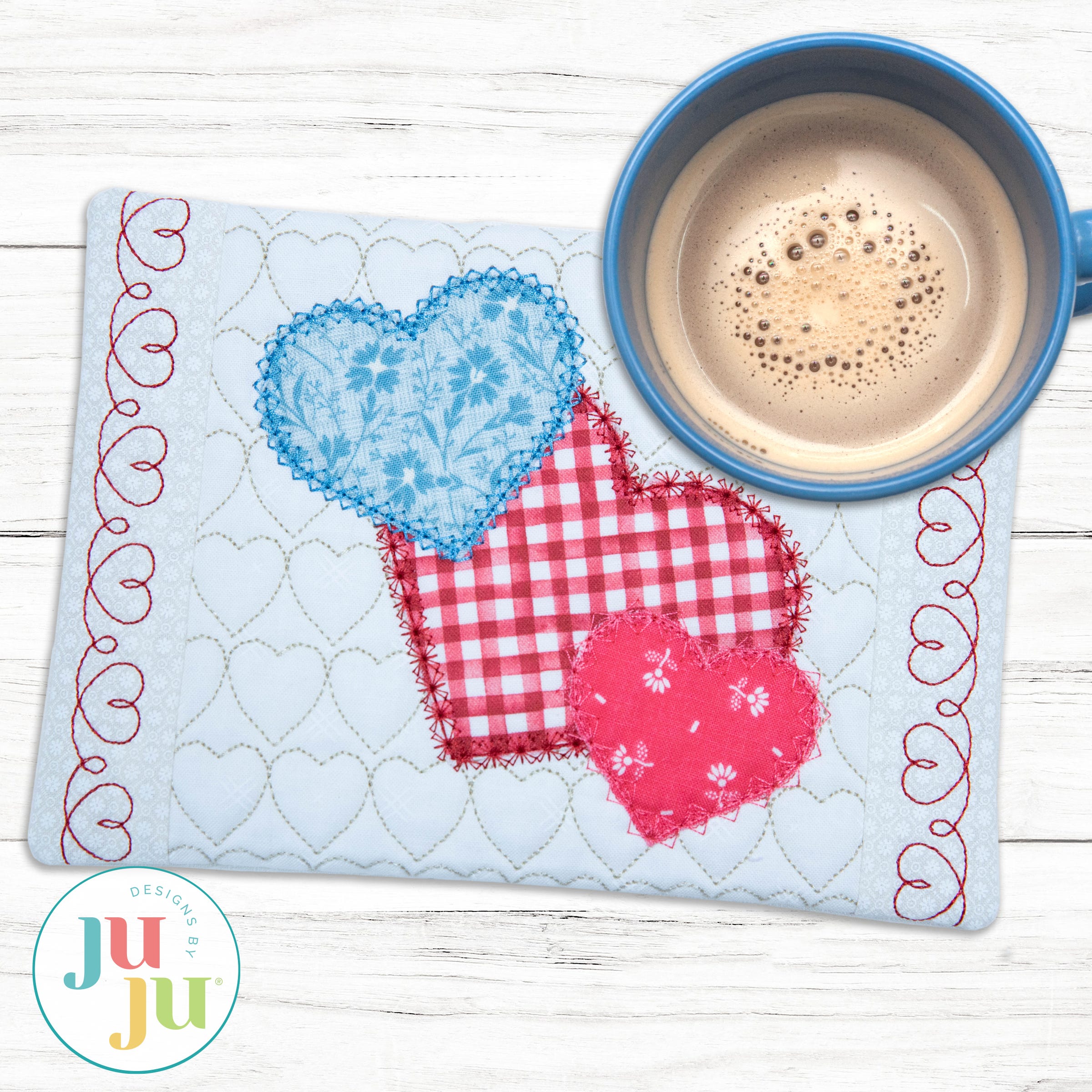 Our sweet Heart Trio Mug Rug is perfect for Valentine's Day! This mug rug features three applique hearts that are finished with a motif stitch for a lovely vintage look. Available in five hoop sizes: 5x7 hoop, 6x10 hoop, 7x12 hoop, 8x12 hoop, and 9.5x14 hoop.