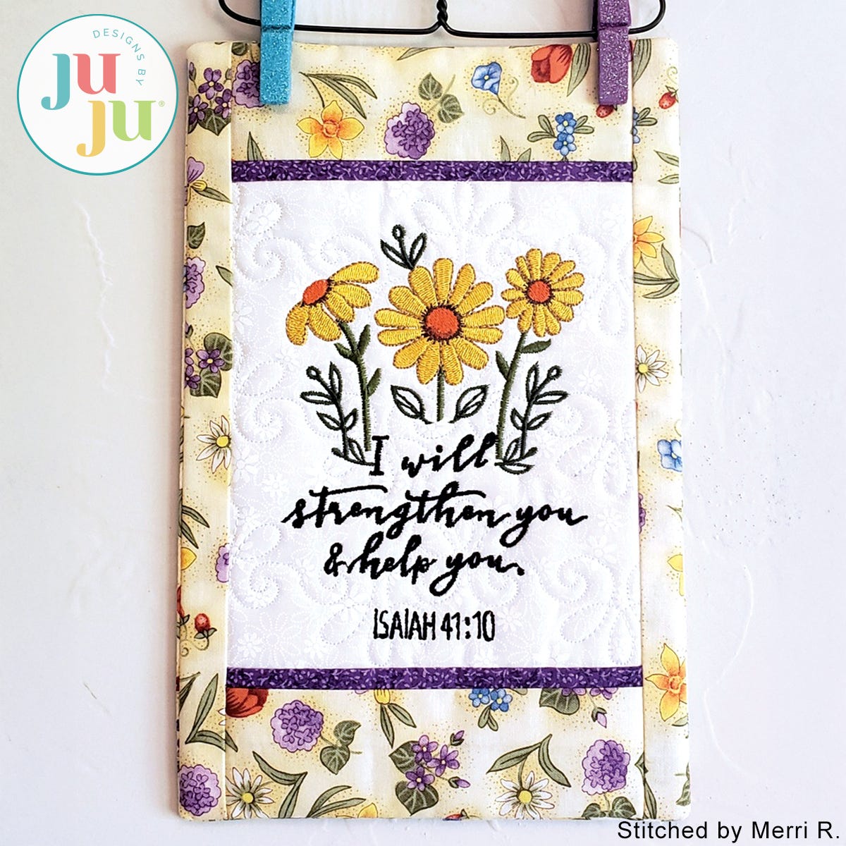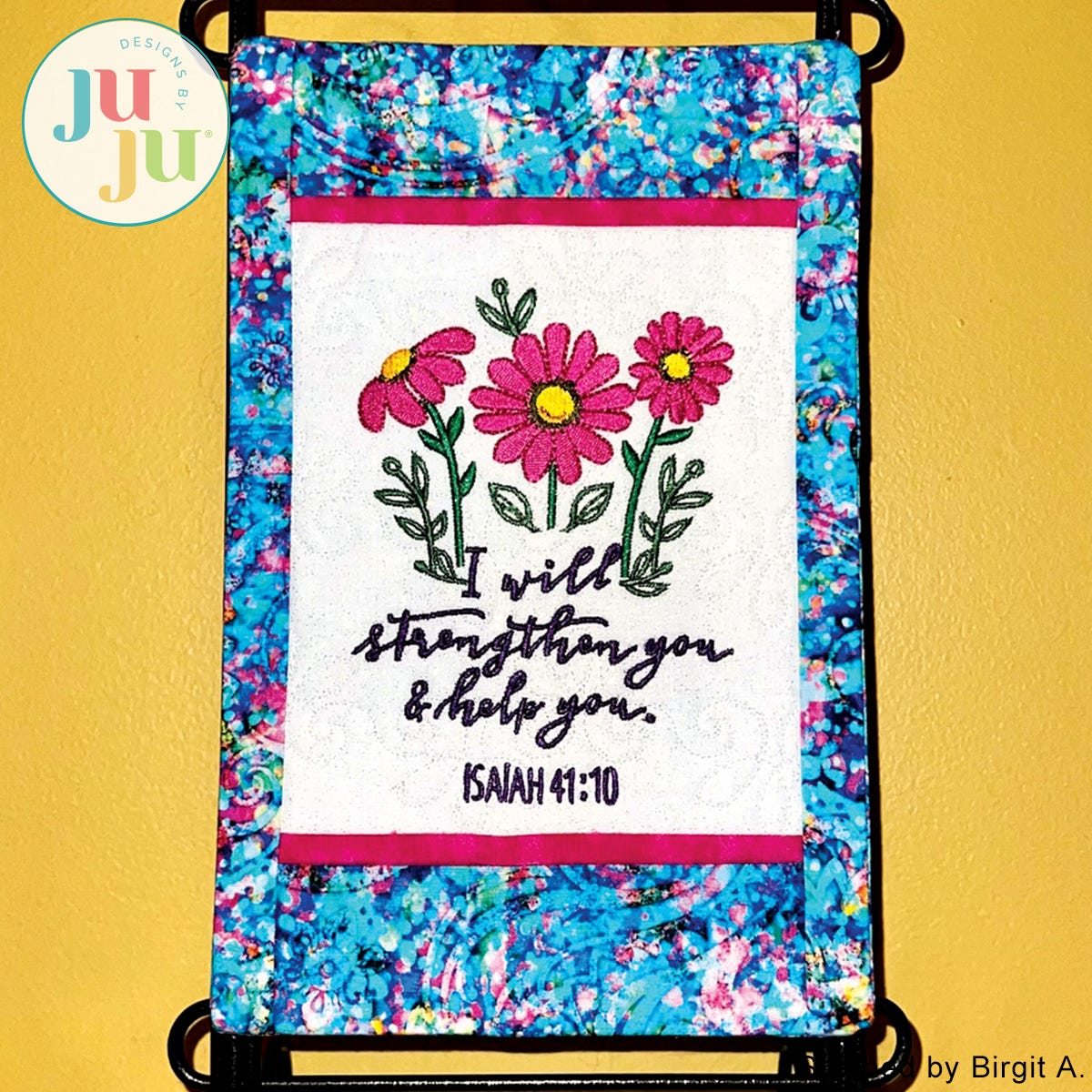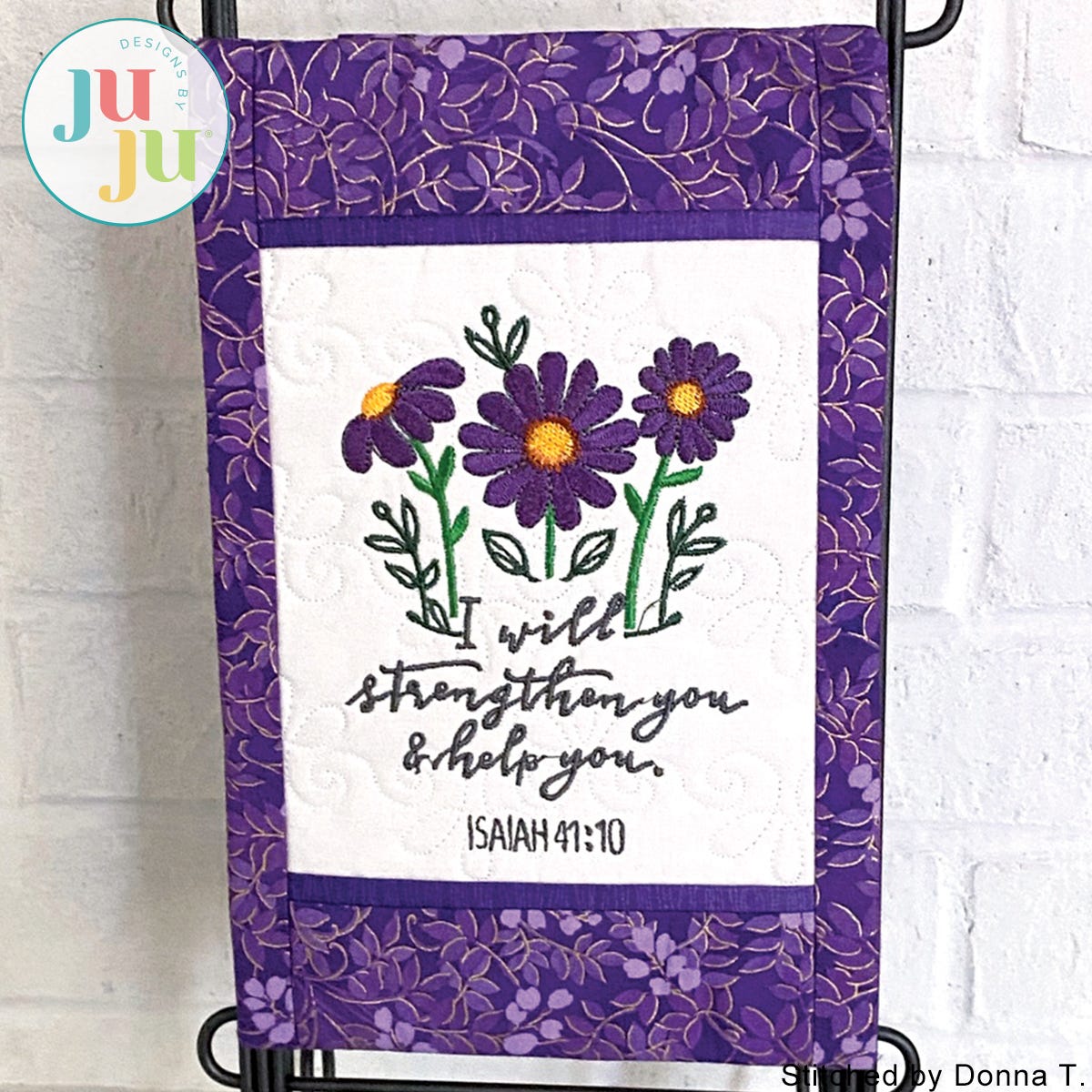 This beautiful mini quilt can be a constant reminder that God will give you the strength to face your daily challenges. The background of the mini quilt is motif quilted in the hoop and the various borders get attached during the in the hoop process. There is a "sleeve" in the back for hanging of the quilt. The sleeve, too, is applied during the embroidery process. No additional hand or sewing machine stitching is required.