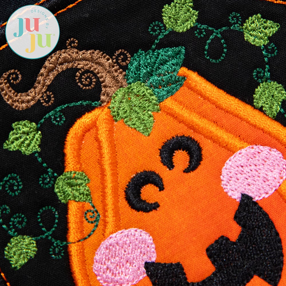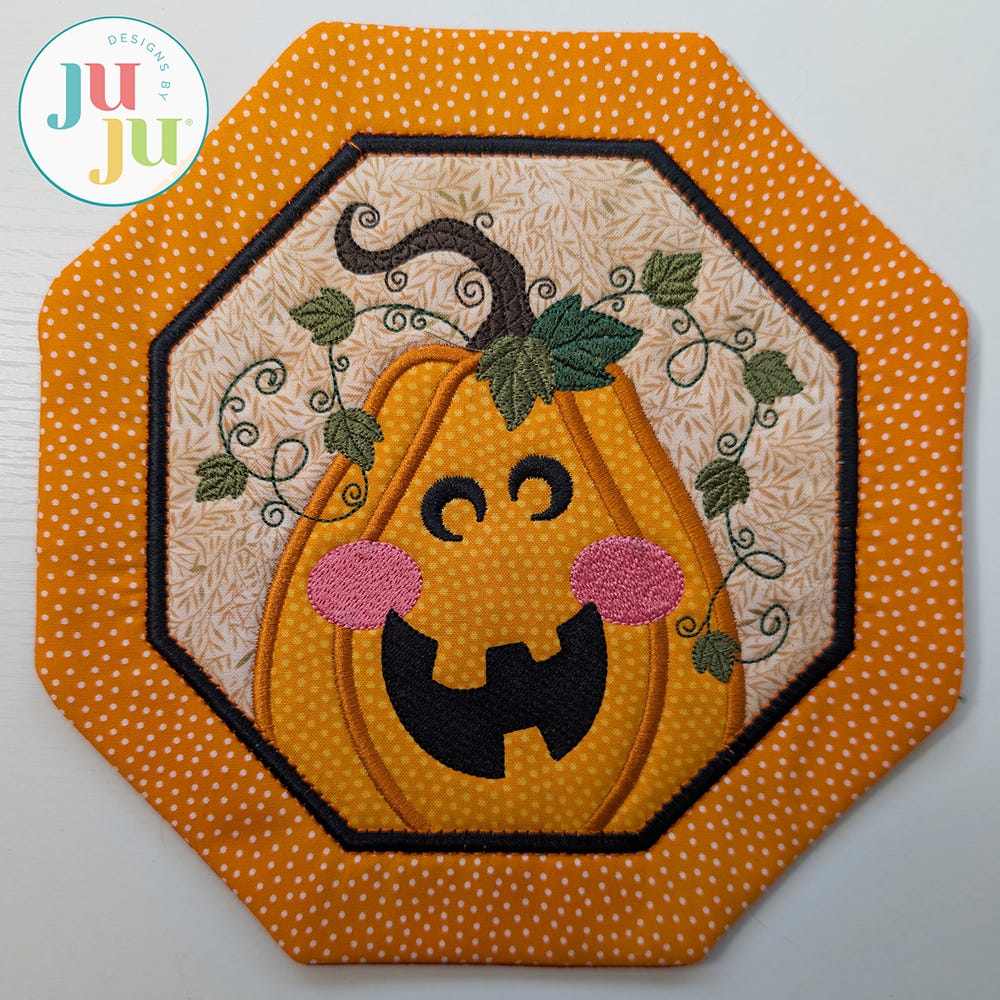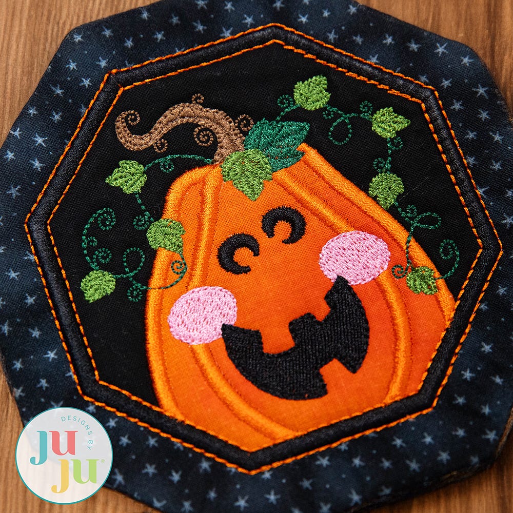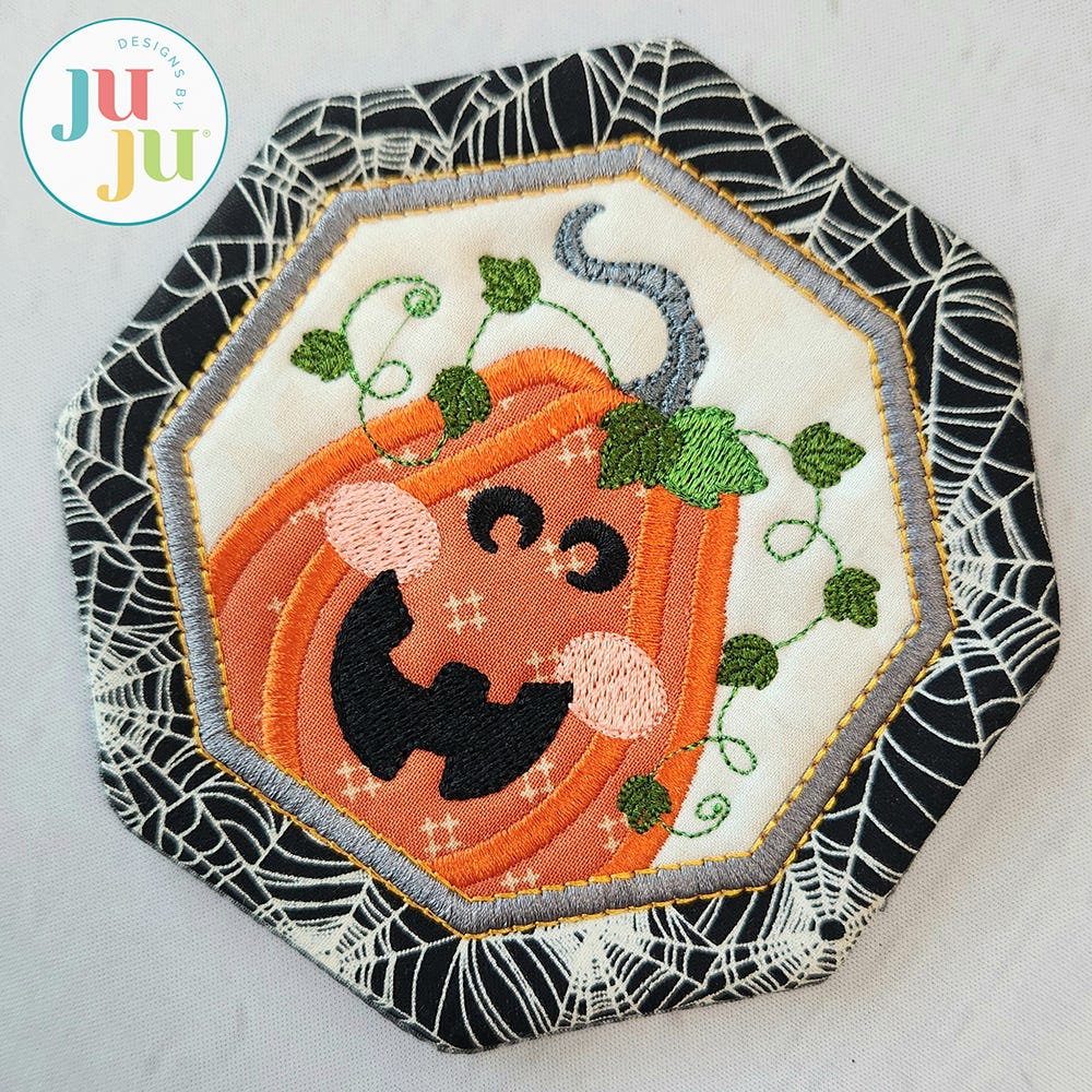 This coaster is the perfect mix of festive and functional! Designed to coordinate with our Modular Jack-o'-lantern in-the-hoop project series! With a wide range of sizes, this Jack-o'-lantern Coaster can be used as a mug rug, trivet, or candle mat.