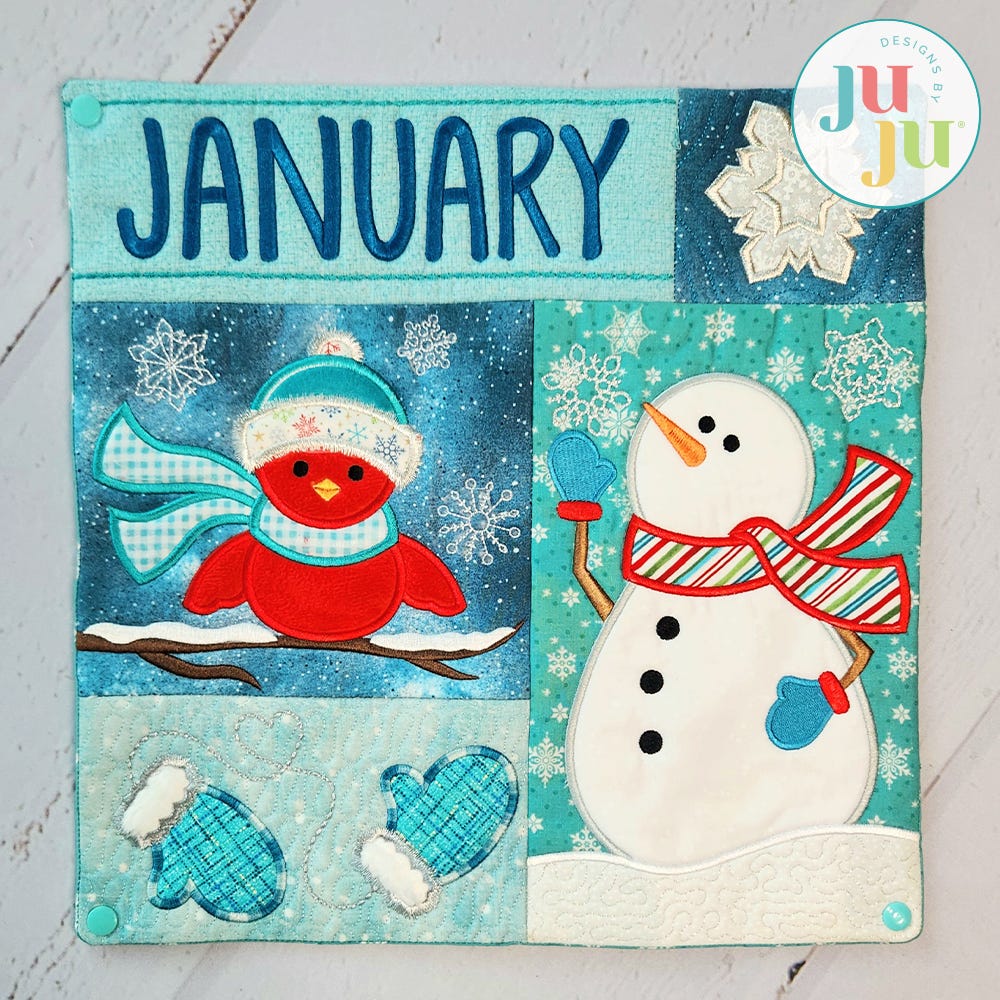 Introducing the first in our series of Monthly Mini Sampler quilts! The January mini quilt features sweet signs of winter: applique designs of a bird wearing a scarf and hat, a waving snowman, mittens and a snowflake.