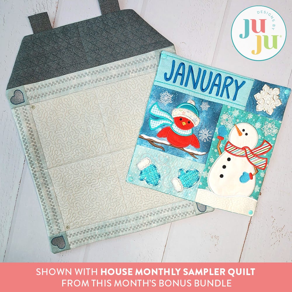 Our Monthly Mini Sampler quilts are perfectly sized to attach to the coordinating House Wall Hanging (currently available in the Bonus Bundle). Affix the sampler to the house using hook-and-loop tape, snaps, pins or buttons.