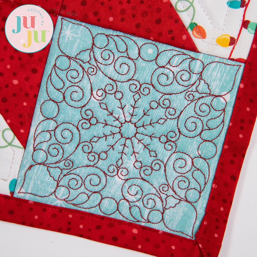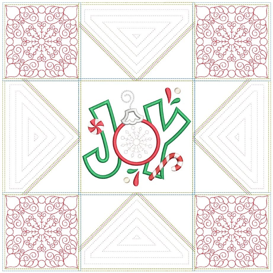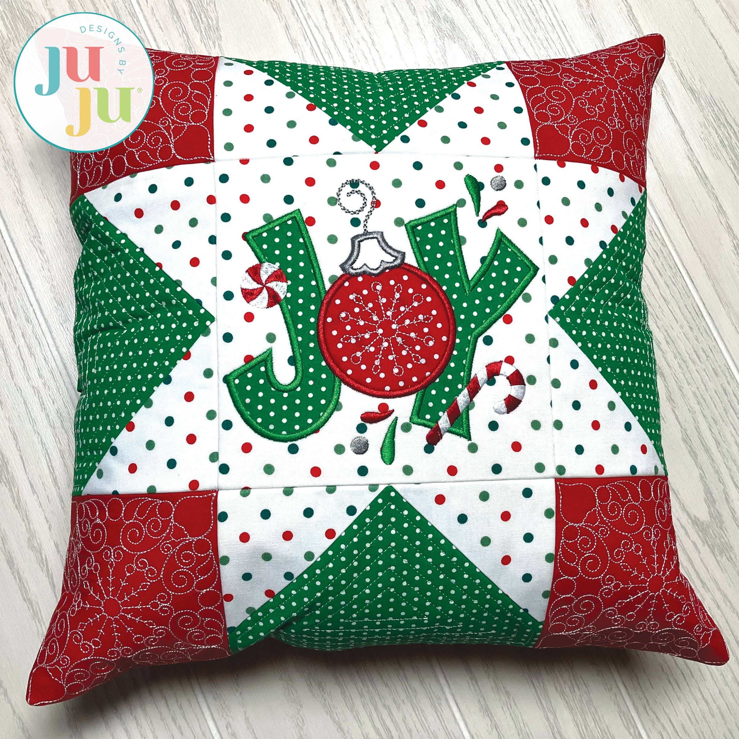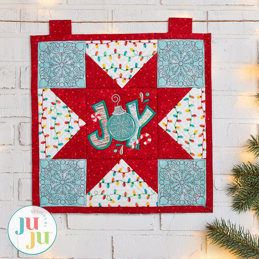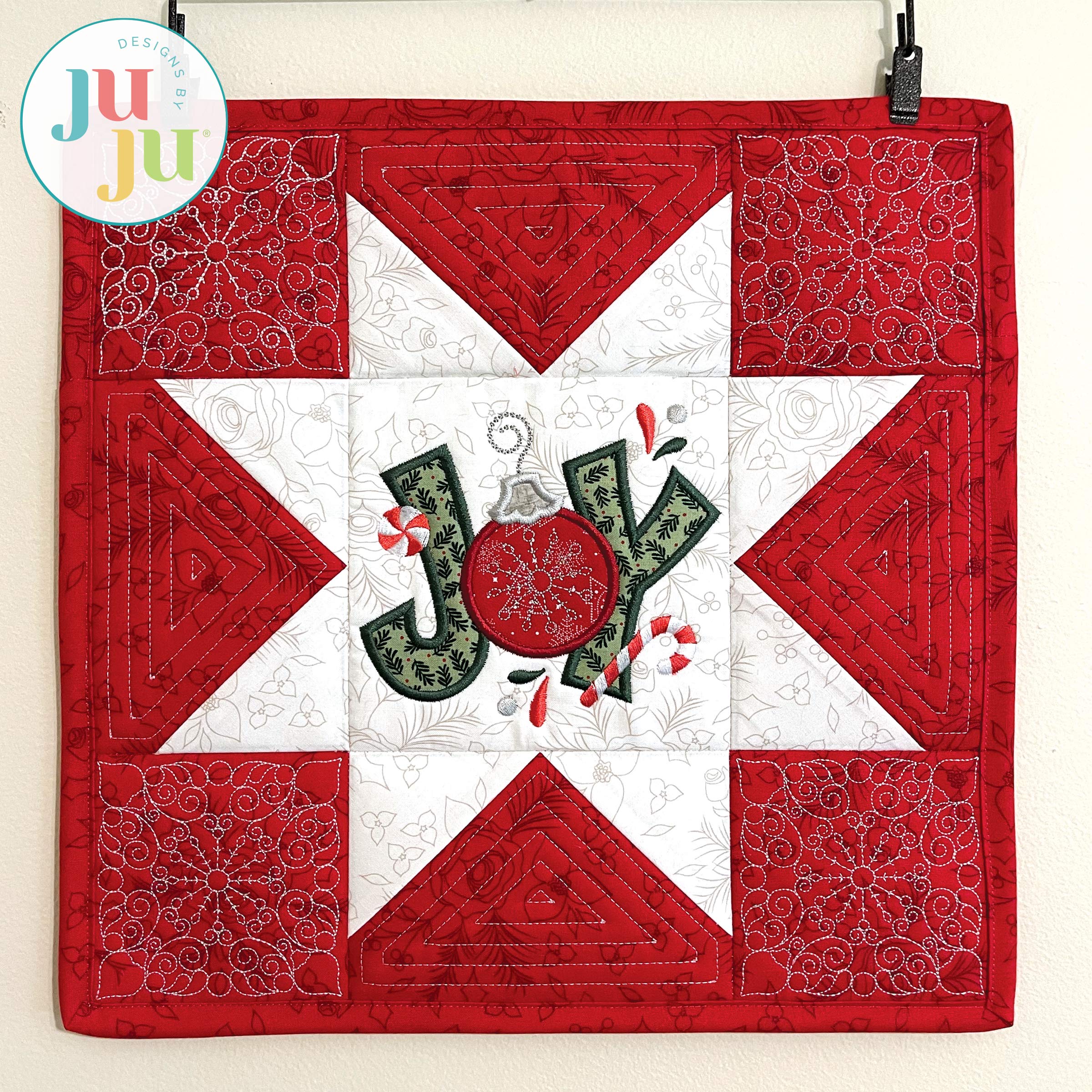 Share your joy this Christmas with our new mini quilt! This project is similar to a large sawtooth star quilt block. The center features the word JOY as an applique with an ornament for the letter O. It's the perfect size for a little table decoration. Add tabs for a wall hanging, or make it a pillow!