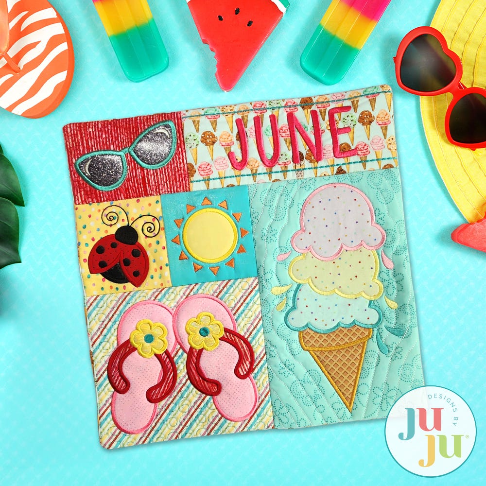 Introducing the sixth in our series of Monthly Mini Sampler quilts! The June mini quilt features sweet signs of summer: applique designs of sunglasses, ladybug, sun, flip flops, and a three-scoop ice cream cone.