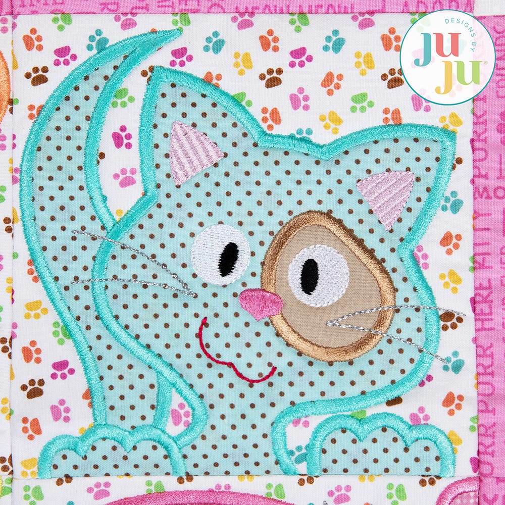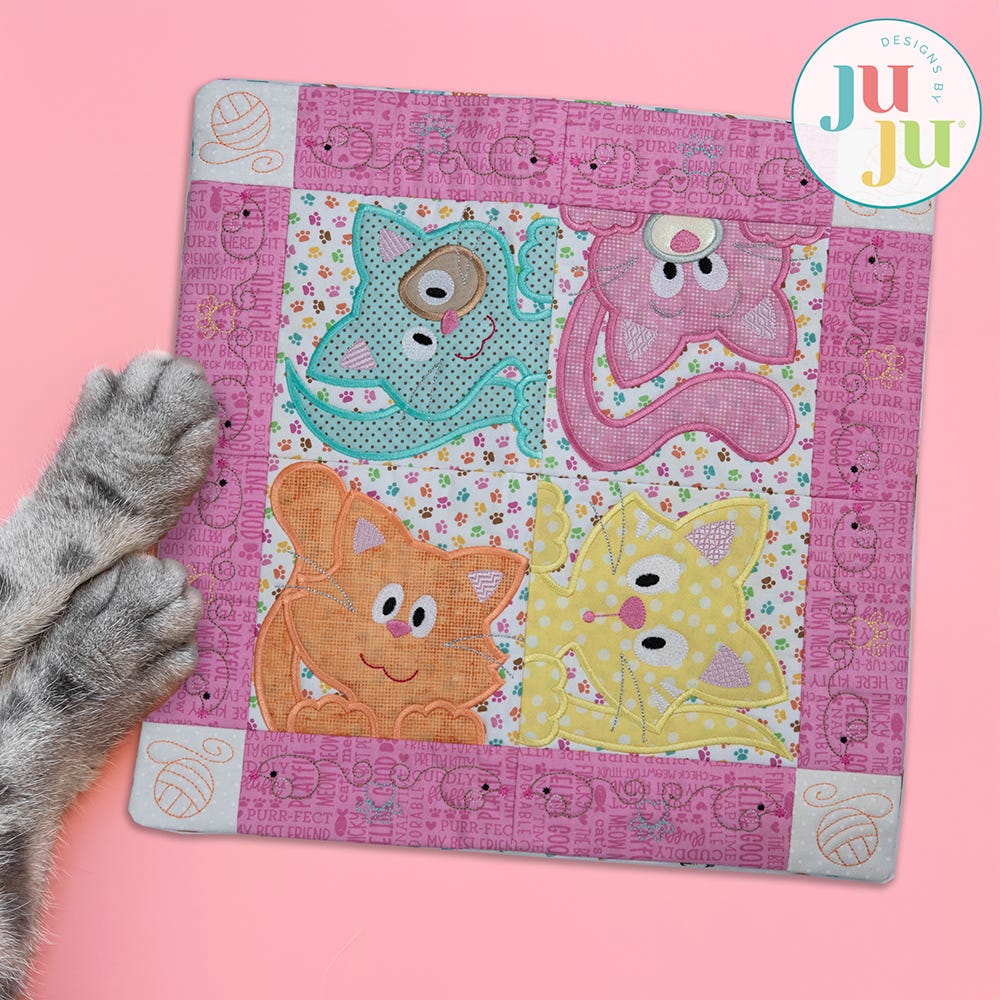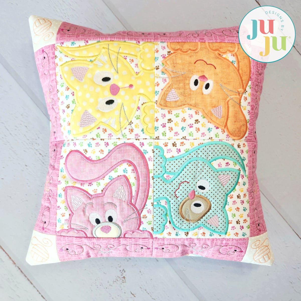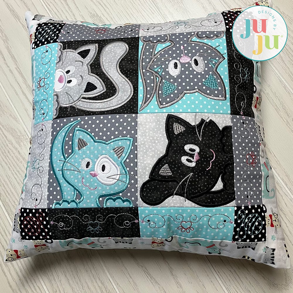 Paws-itively delightful and stitched with a sleek finish, our Kitty Patchy Pillow Satin brings a polished touch to your feline-themed décor! It features four satin stitch applique blocks of cats rotated in different directions with bean stitch mice, paw prints and balls of yarn in the border blocks. Easy to make and assemble! Complete step by step PDF photo tutorial included with your download. Four sizes included, minimum 5x7 hoop required.