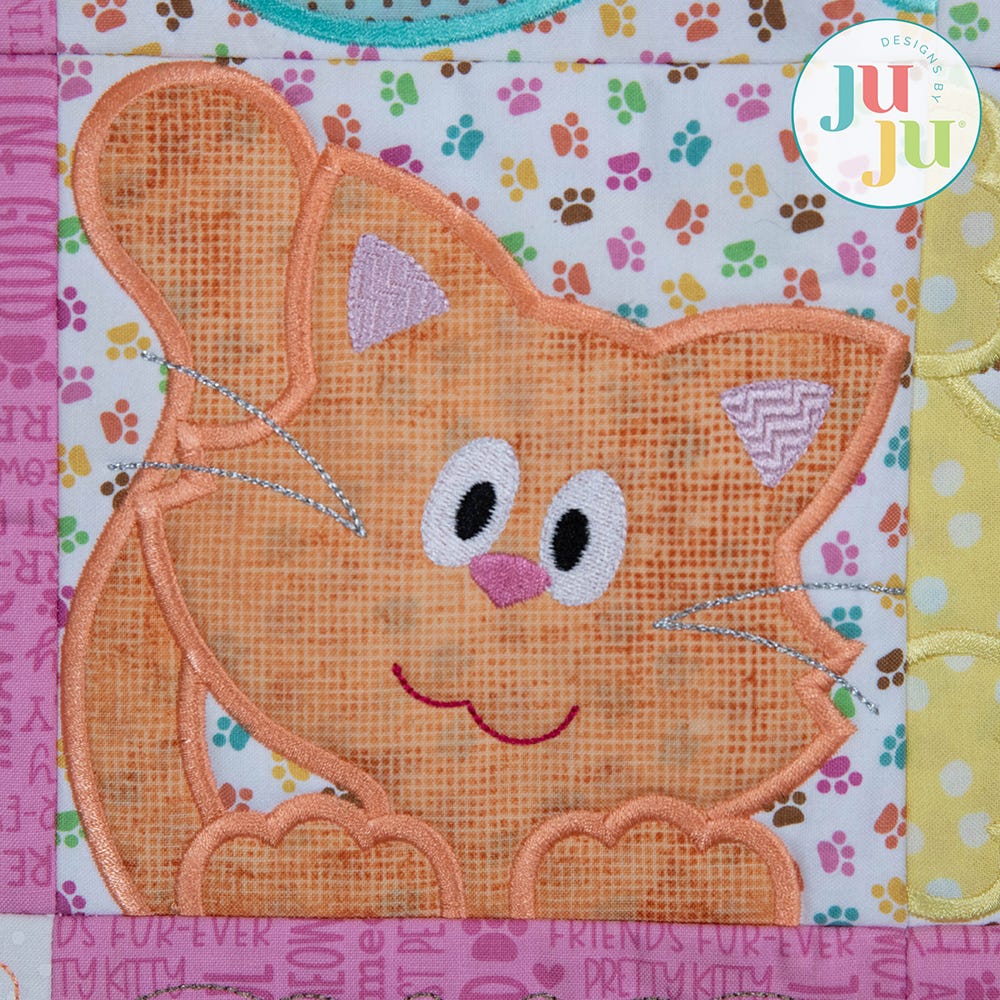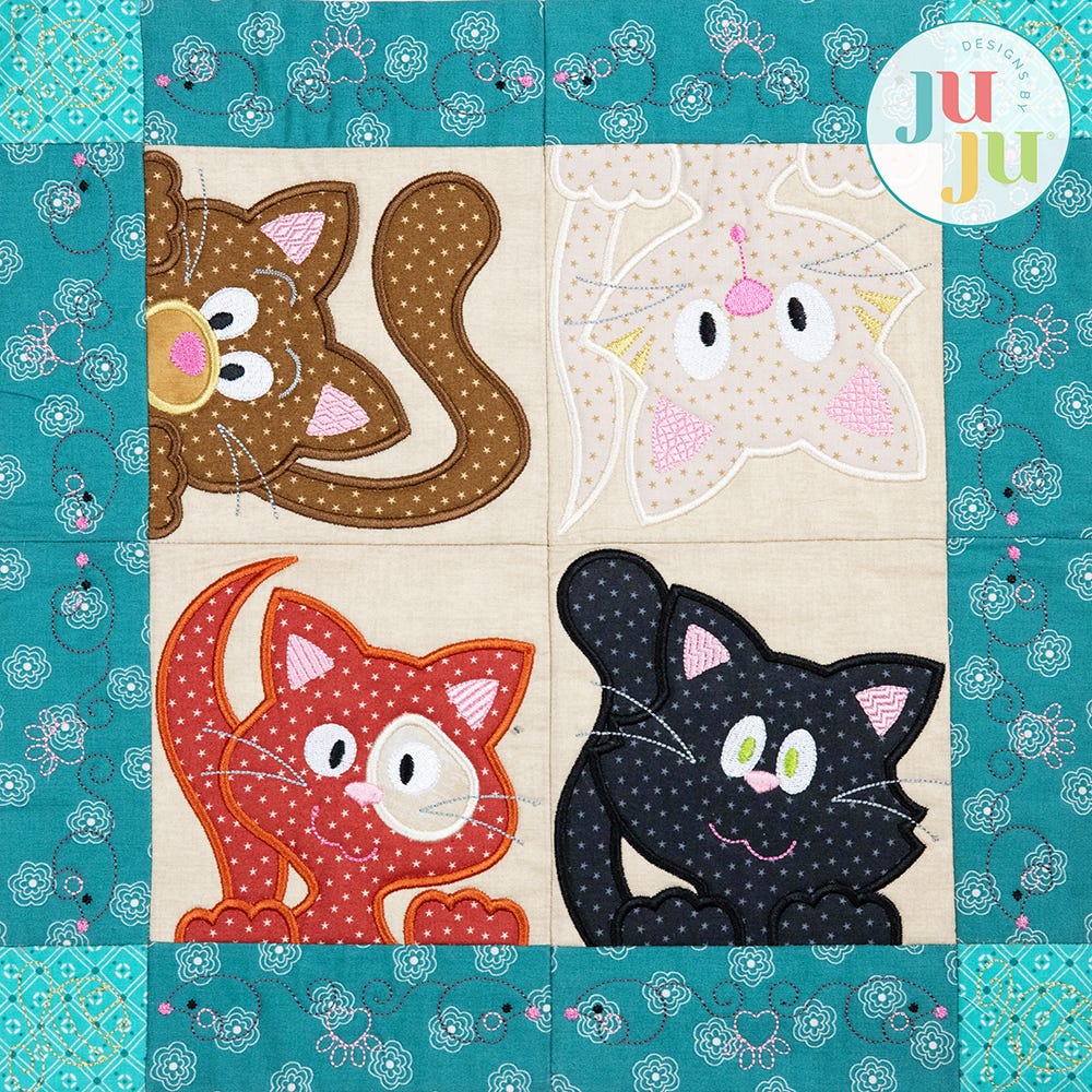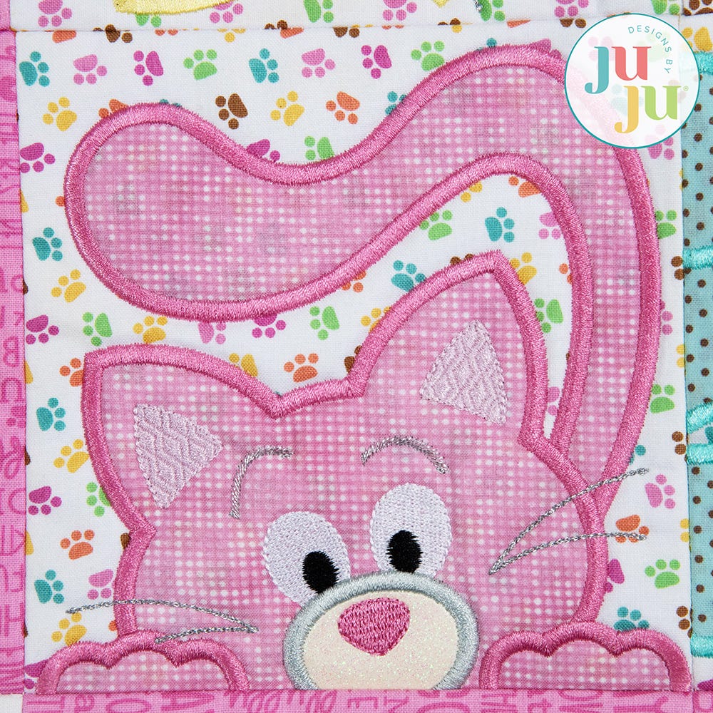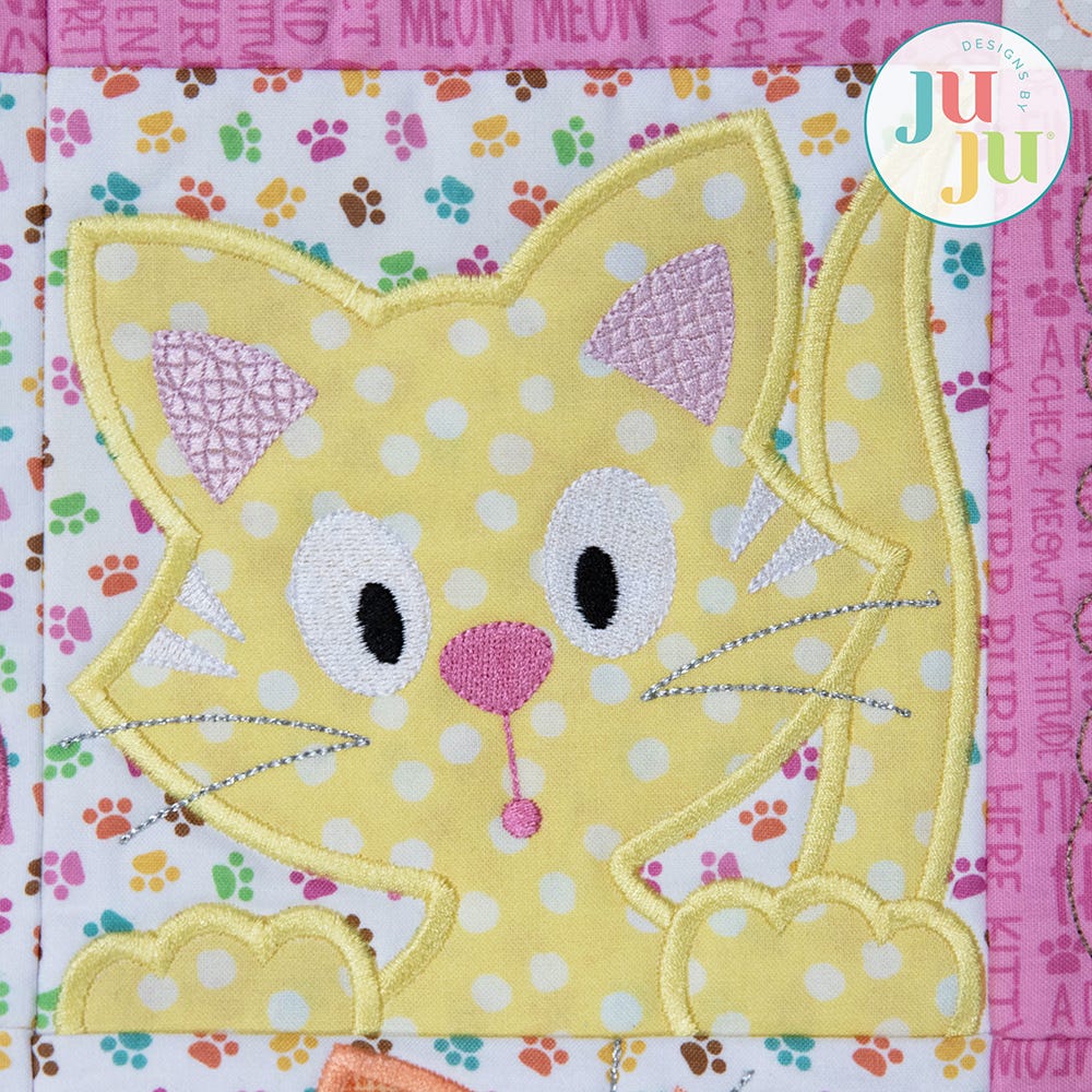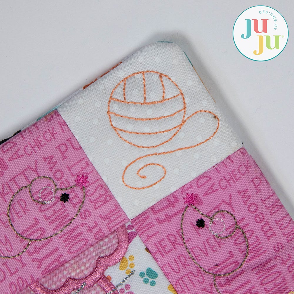 Paws-itively delightful and stitched with a sleek finish, our Kitty Patchy Pillow Satin brings a polished touch to your feline-themed décor! It features four satin stitch applique blocks of cats rotated in different directions with bean stitch mice, paw prints and balls of yarn in the border blocks. Easy to make and assemble! Complete step by step PDF photo tutorial included with your download. Four sizes included, minimum 5x7 hoop required.