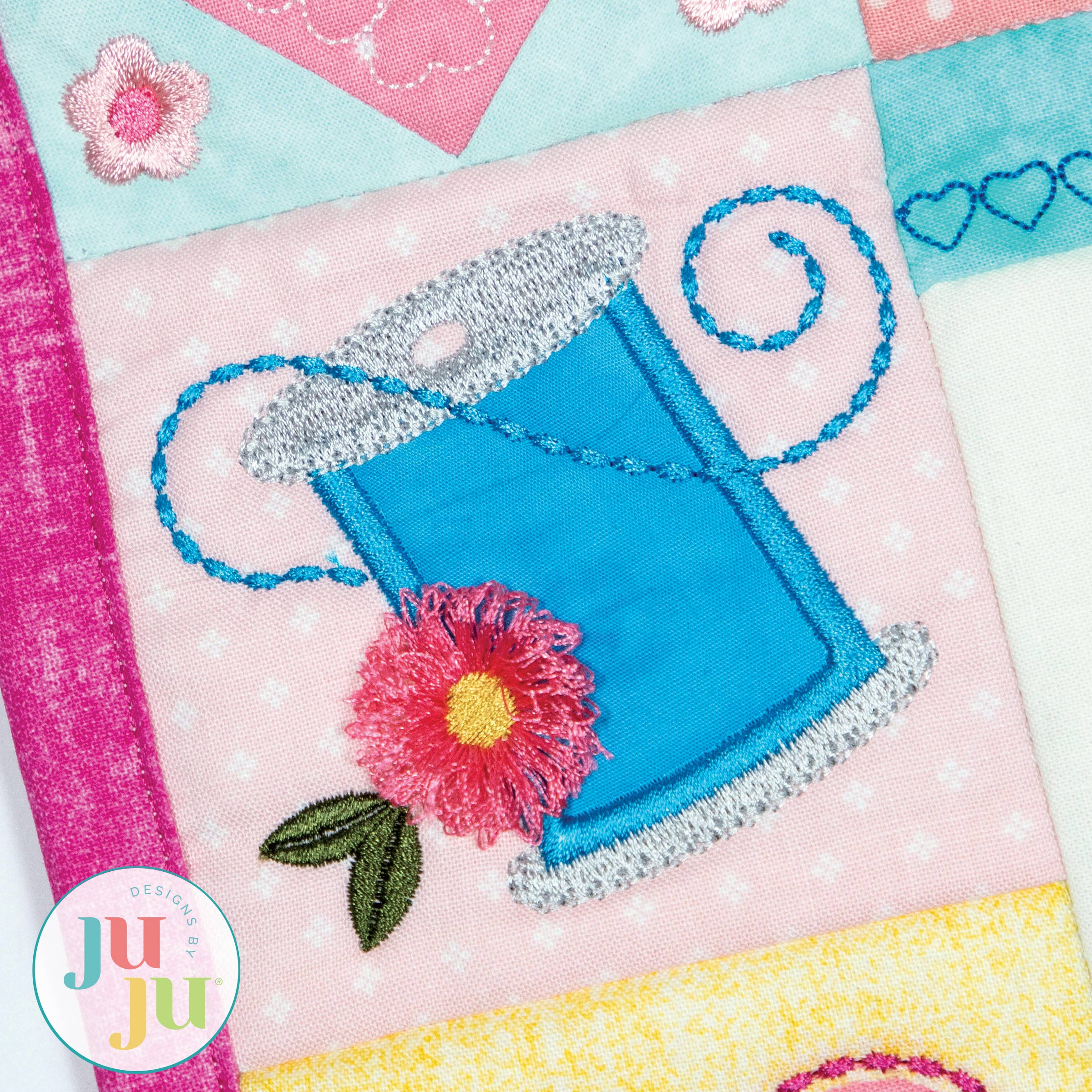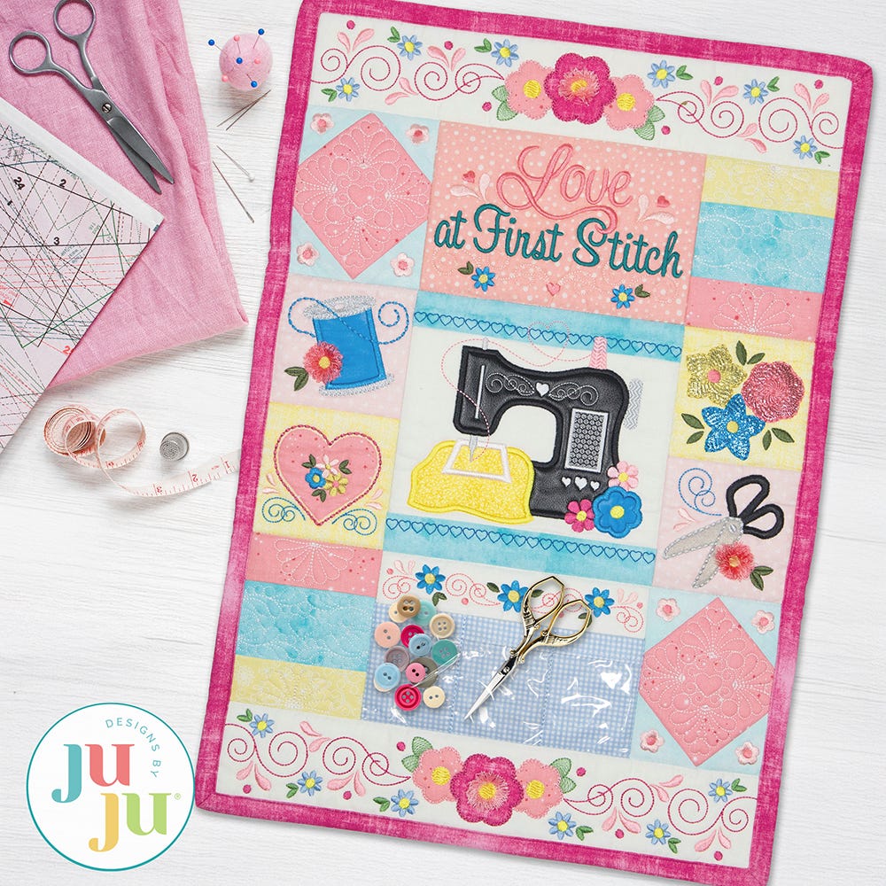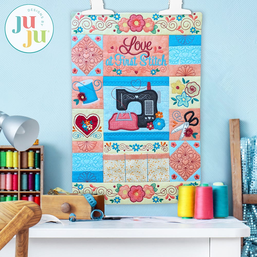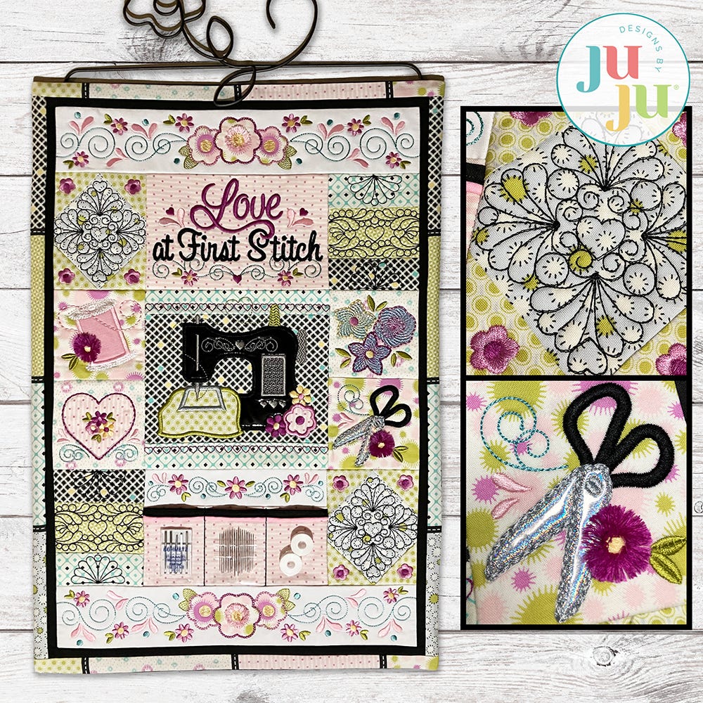 You will fall in love with this project at first stitch! This sweet machine embroidery-themed wall hanging explores several different embroidery techniques: traditional applique, reverse applique, stitch-and-flip applique, and fringe. It also provides the opportunity to explore fun types of material like mylar and faux leather vinyl. Use clear vinyl to make a functioning pocket to hold your favorite small sewing notions. Made with the fabric and threads of your choice, it will be the perfect addition to your sewing studio!