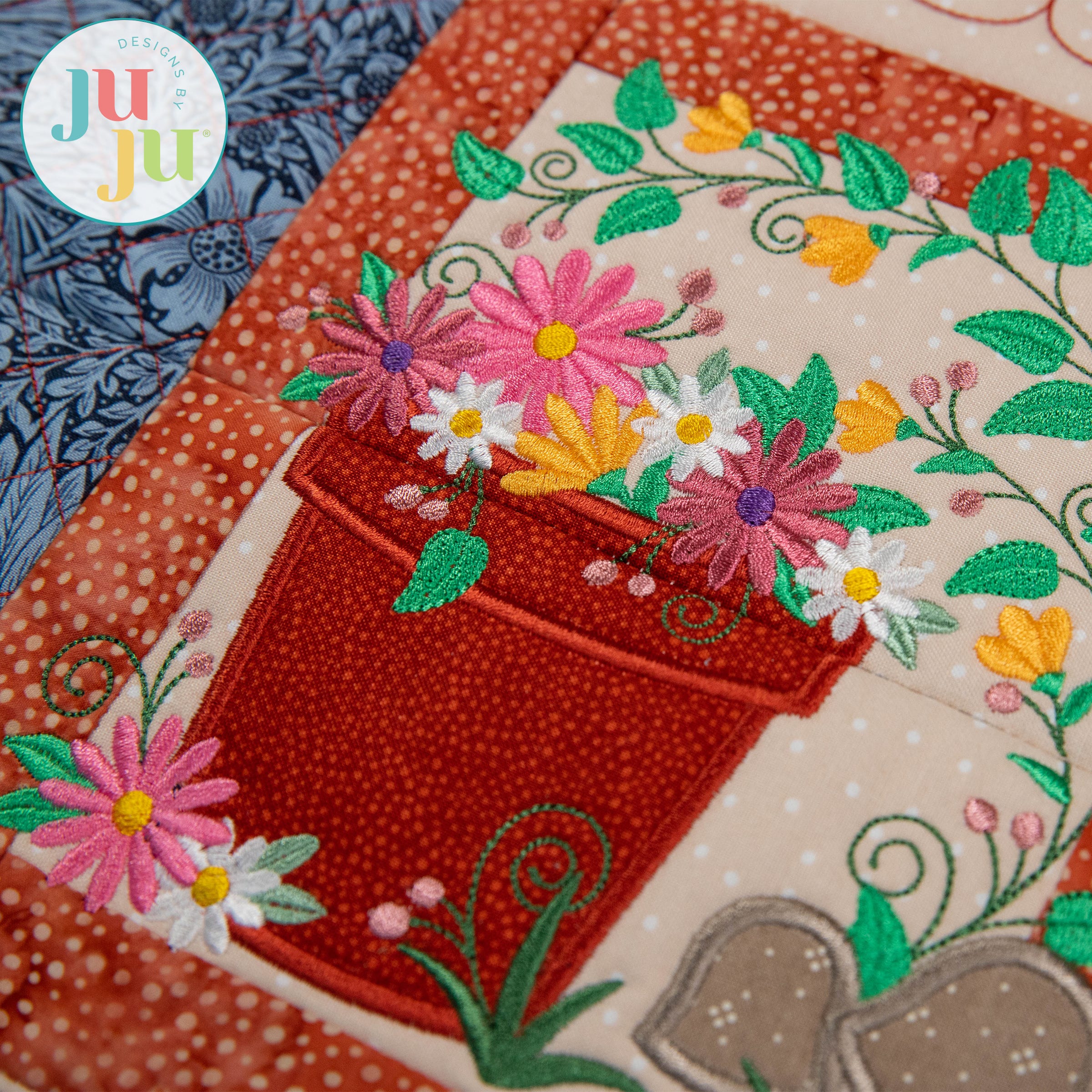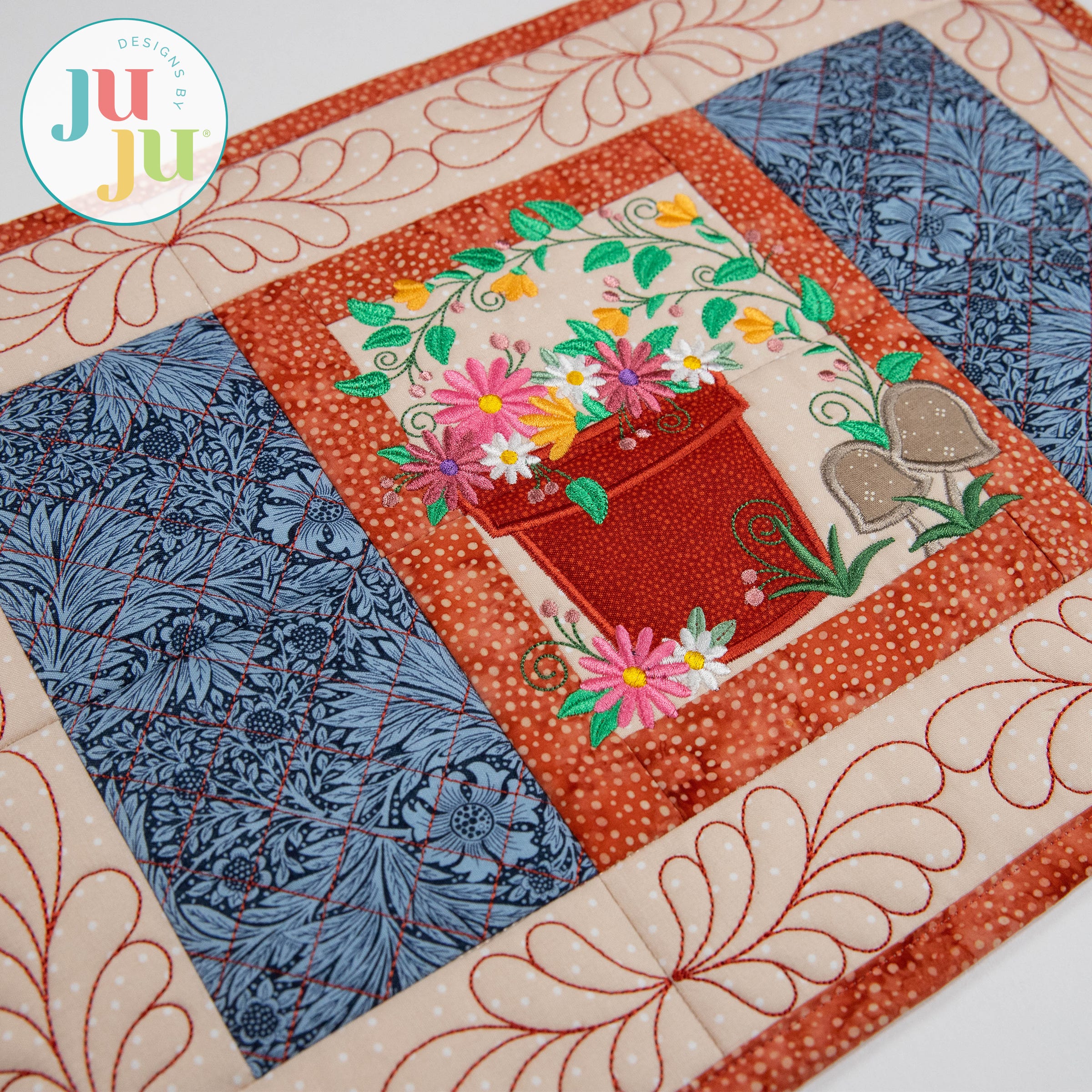 This set includes: Main Flower Pot design, Crosshatch Side blocks, and Feathered Swirl Border blocks. (Bonus Zig Zag border blocks that coordinate with our Modular Table Runner designs are also included.)