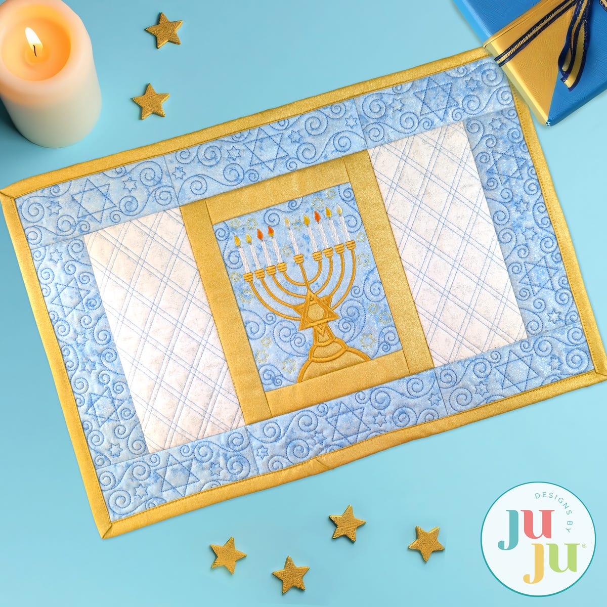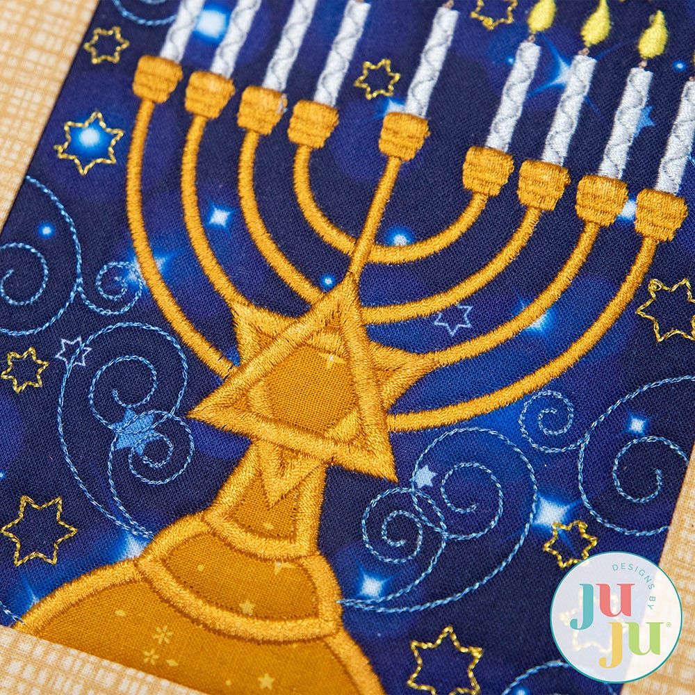 This set includes: Main Hanukkah design, Double Crosshatch Quilted Side blocks, and Hanukkah Border blocks. (Bonus Zig Zag border blocks that coordinate with our Modular Table Runner designs are also included.)