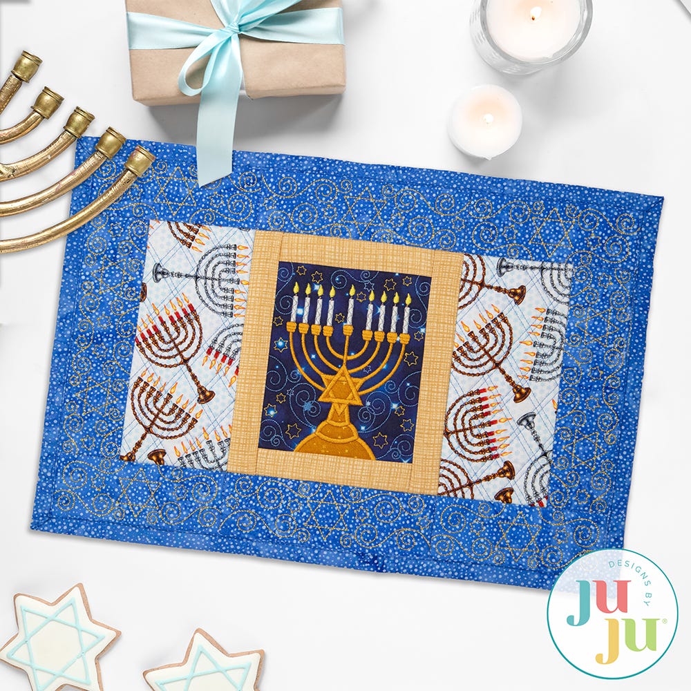 Decorate your dining room for the holidays with this lovely Modular Hanukkah Placemat, crafted to perfectly complement our coordinating Modular Hanukkah Table Runner. When made with the fabric and threads of your choice, it will add both elegance and functionality to your special meals!