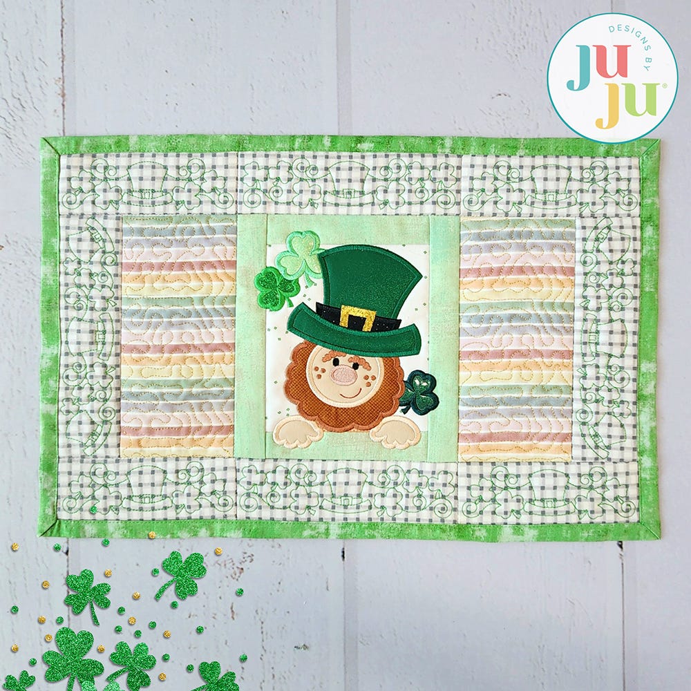 This set includes: Main Leprechaun design, Stipple Quilted Side blocks, and Leprechaun Hat Border blocks. (Bonus Zig Zag border blocks that coordinate with our Modular Table Runner designs are also included.)