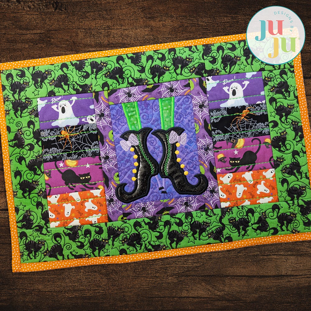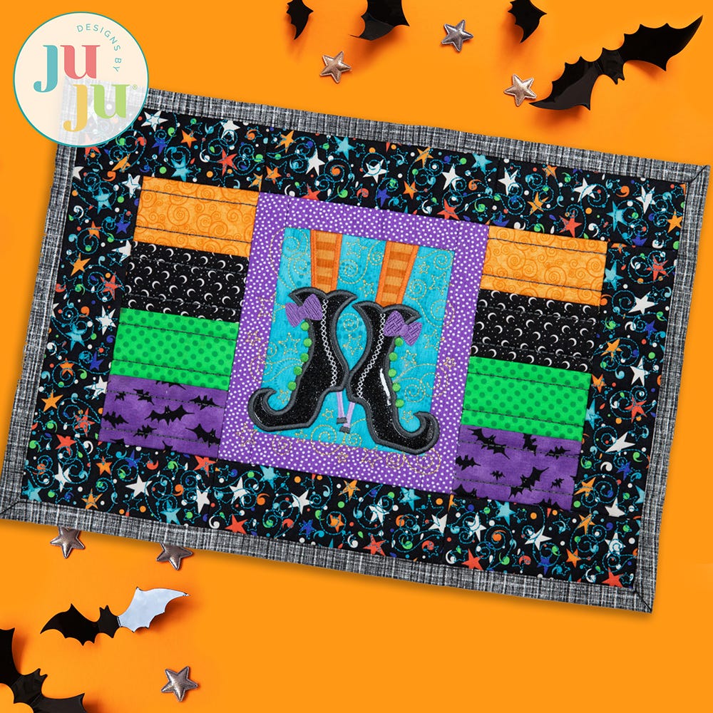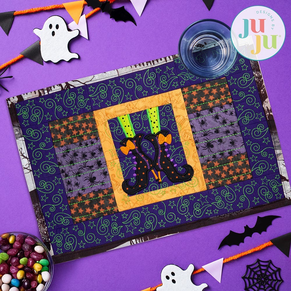 Dress your dining table in spooky style with this charmingly designed Modular Witch Feet Placemat, crafted to perfectly complement our coordinating Modular Witch Feet Table Runner. When made with the fabric and threads of your choice, it will add both style and functionality to any festive feast!.
