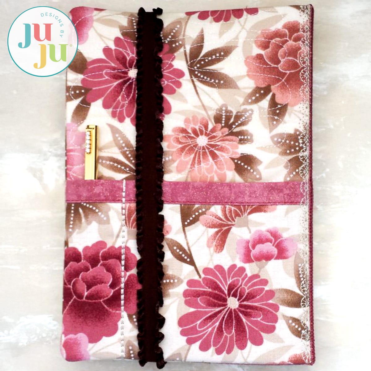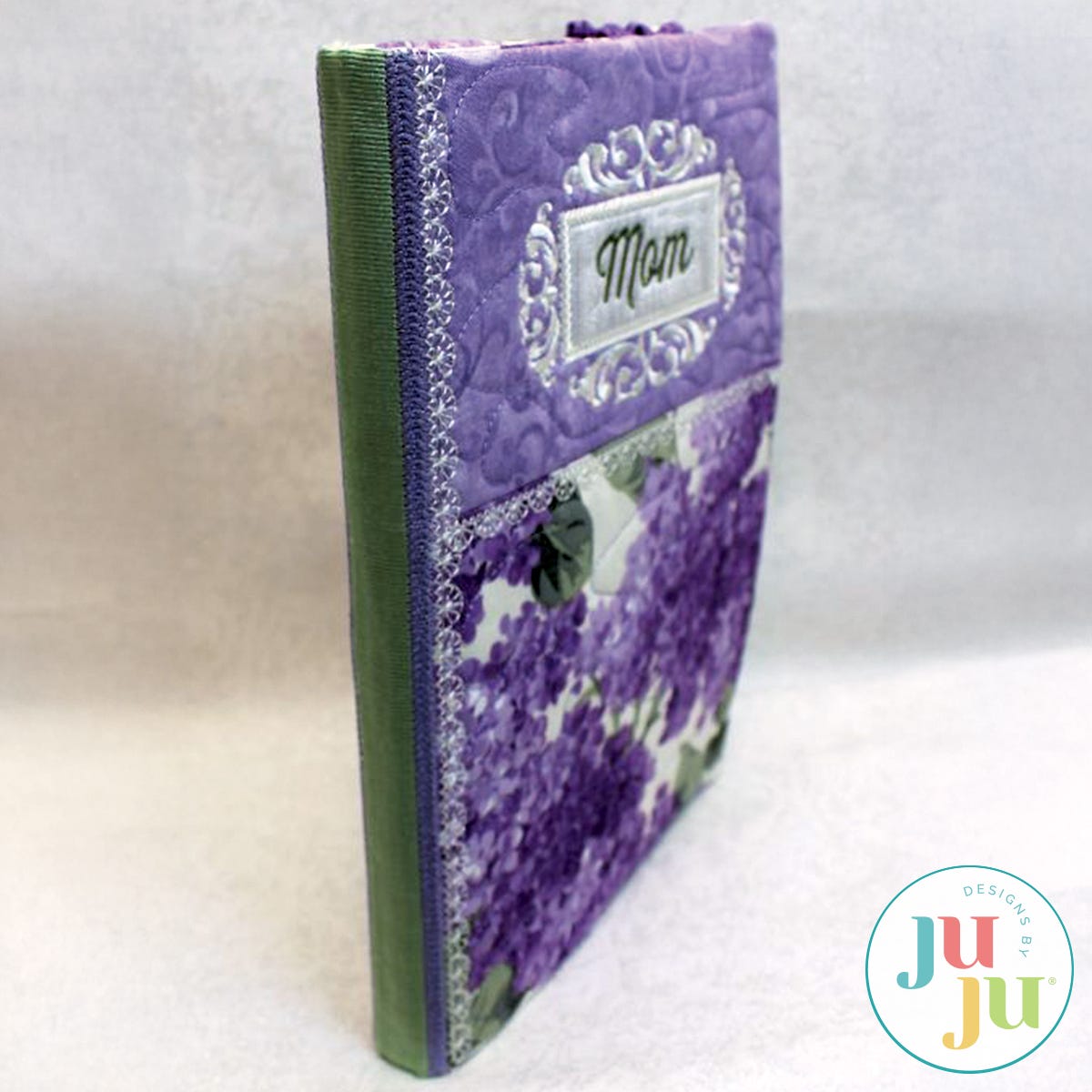 This journal cover is completely done as an in the hoop project. The front and back are constructed in separate hoopings and joined together in a third hooping when making the spine. No hand sewing required. There is a pen pocket in the back as well as a pocket for storing papers. The journal is kept closed when not in use through the means of an elastic strap. You can use decorative elastic or make your own fabric covered elastic (instructions are included for doing so). Your download includes the journal design with the word “Mom' inserted as well as a front design with the word "Mum" embedded. You also will receive the front design with the label left blank so you can insert any initials or short name of your own choosing. Please note that the journal used is a 6x8" journal refill, for sale at Barnes and Nobles online and in store. The dimensions of this journal refill are 5.8x8.3" (=A5 dimensions). Please make sure you use the right size journal for this cover.