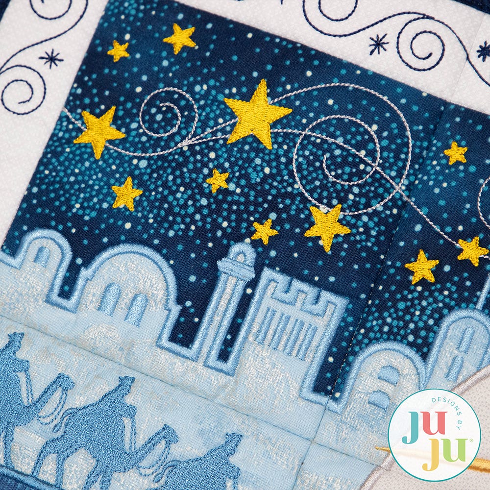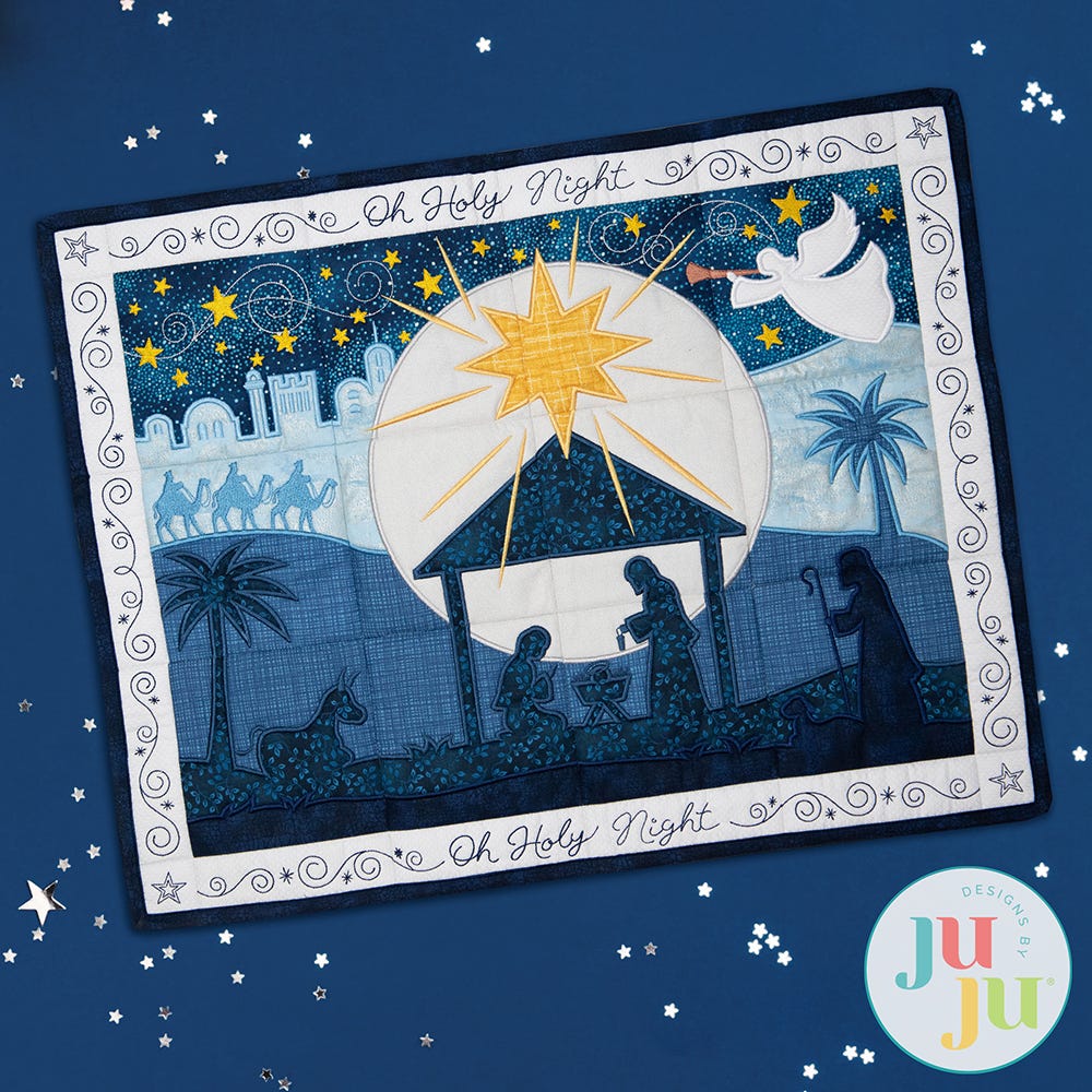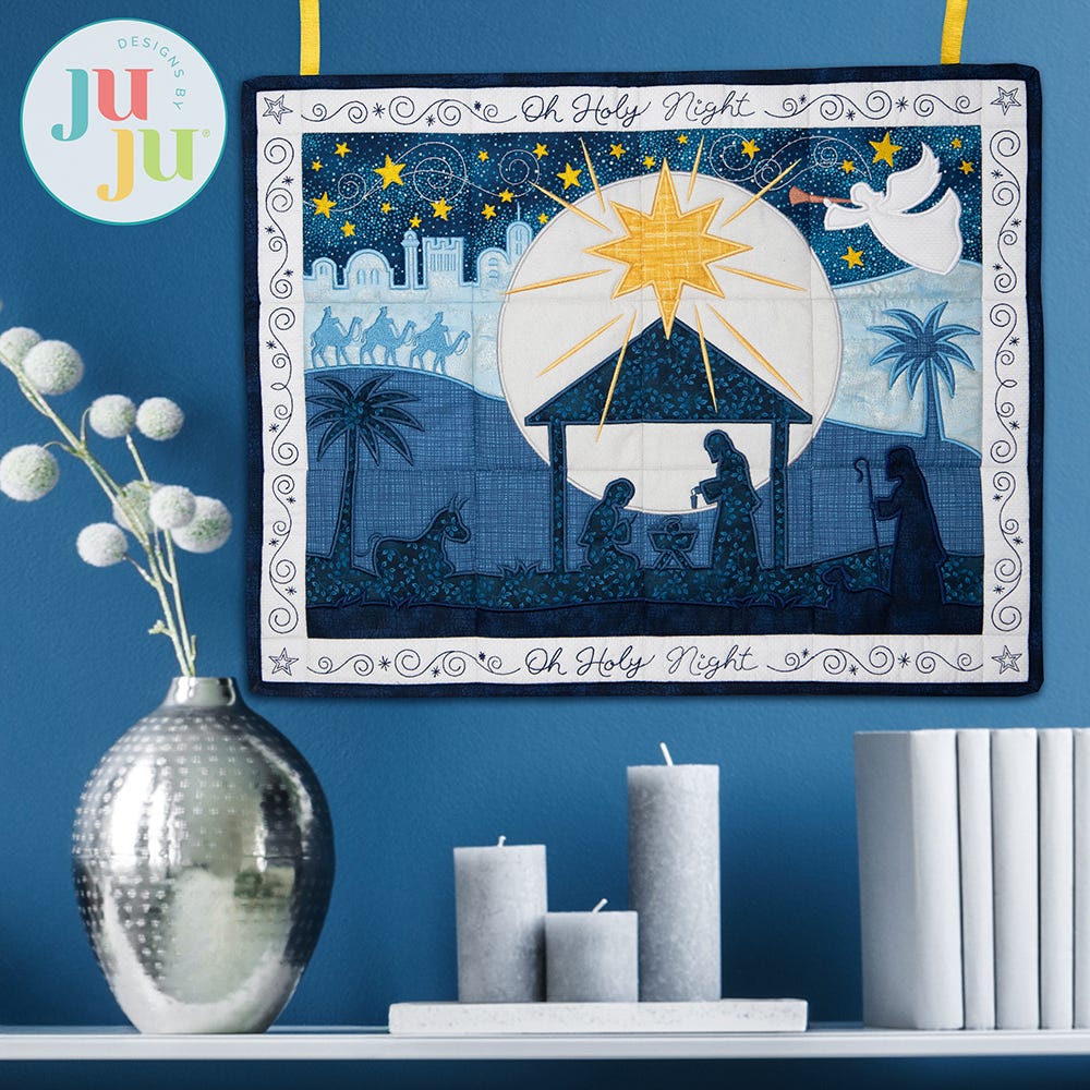 Celebrate the real reason for the season this Christmas with our Nativity Wall Hanging! This project features applique silhouettes of the manger scene against a night sky. Most design elements extend over multiple blocks to create the single, large picture.