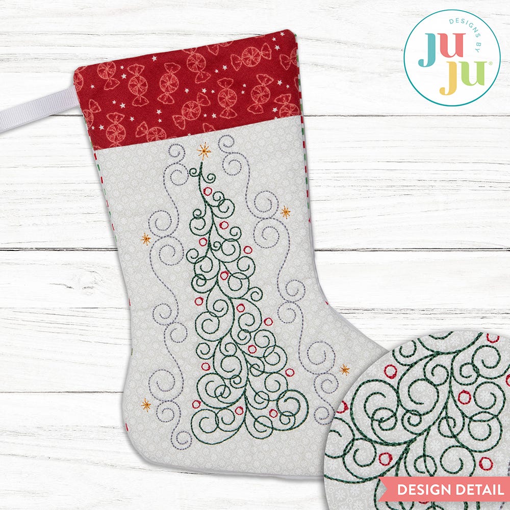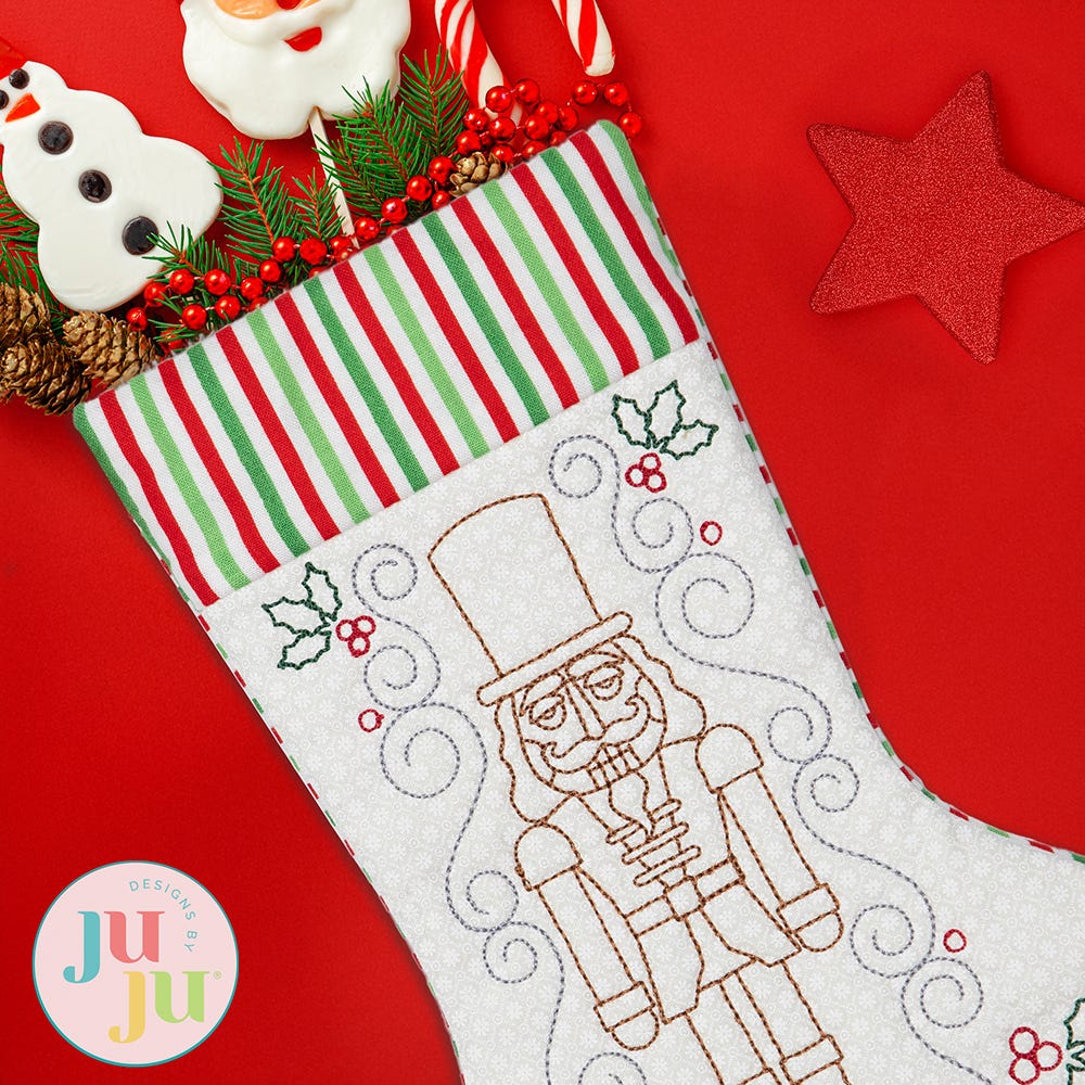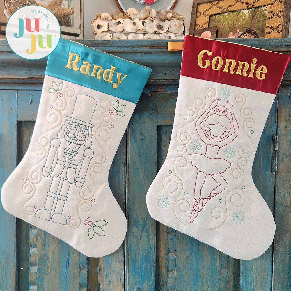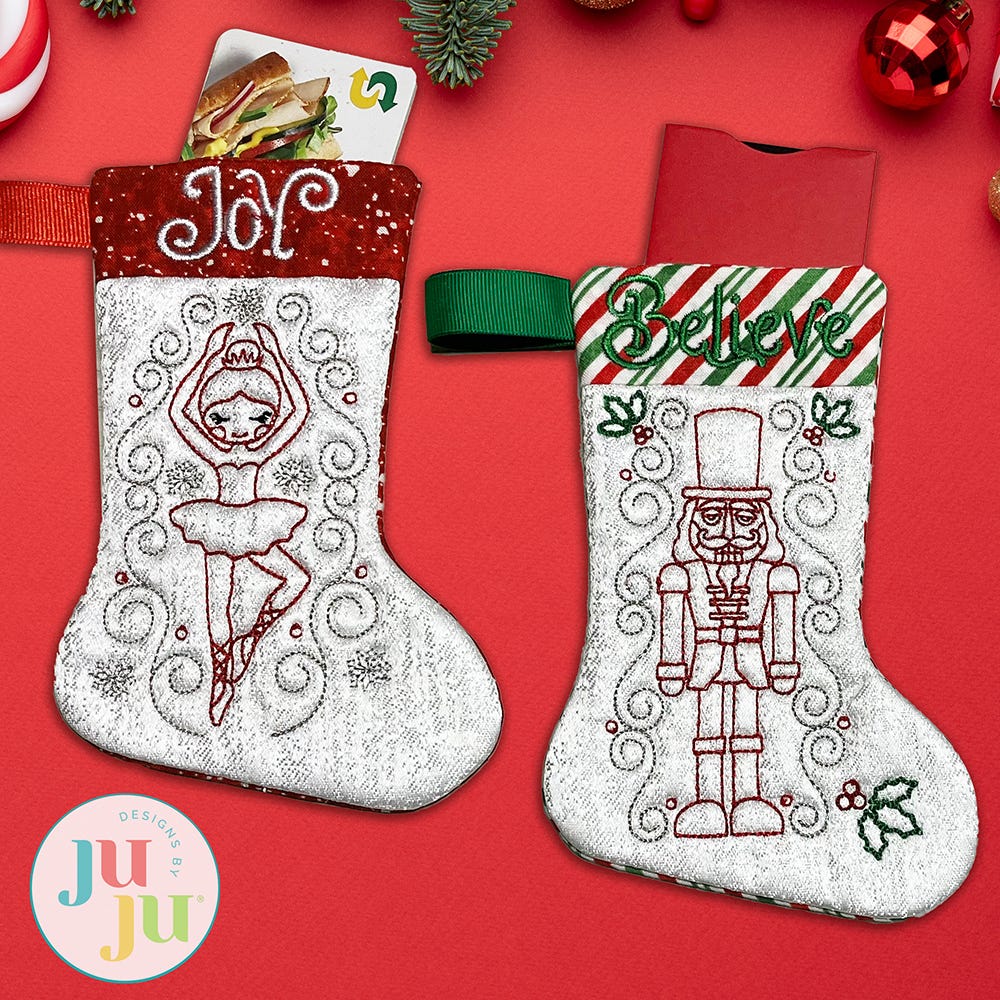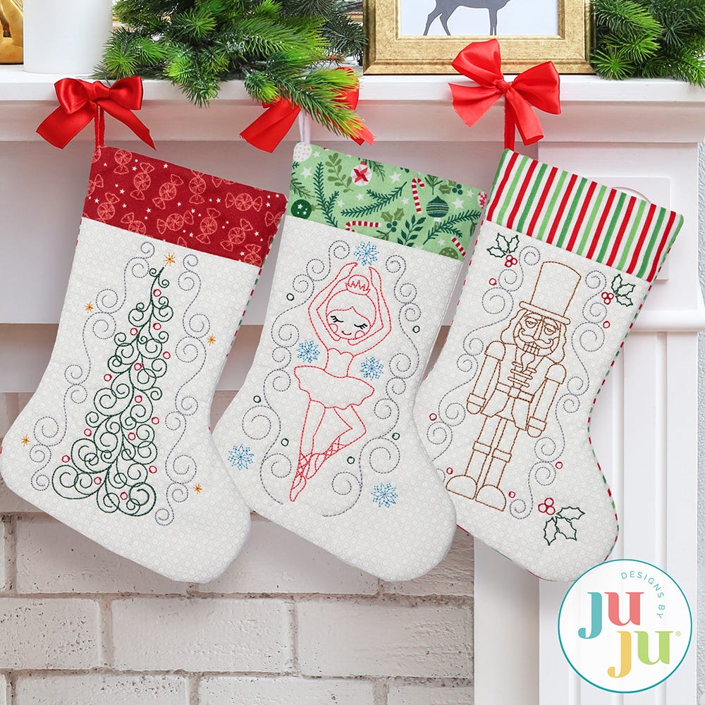 These three sweet and simple in-the-hoop stockings are fully lined with no exposed seams! Designed to coordinate with our Nutcracker Tree Skirt, each stocking feature a different bean stitch design: nutcracker, ballerina and tree.