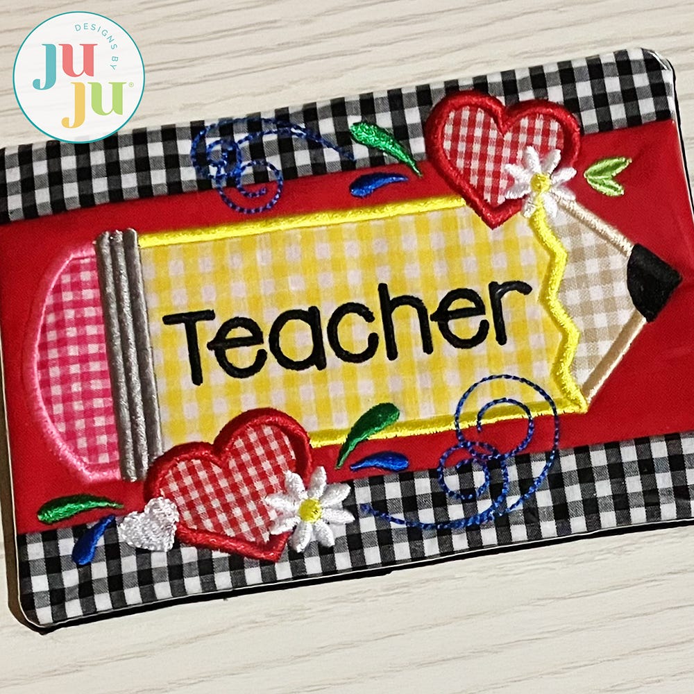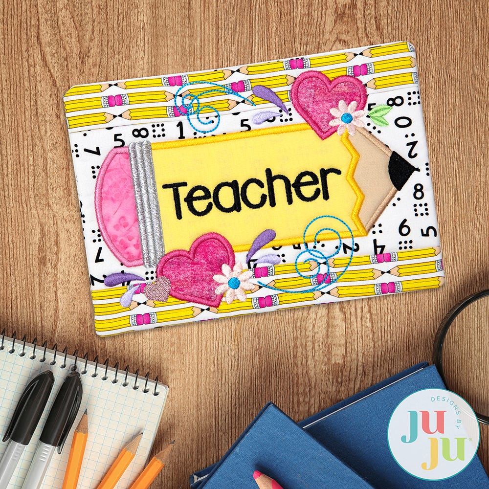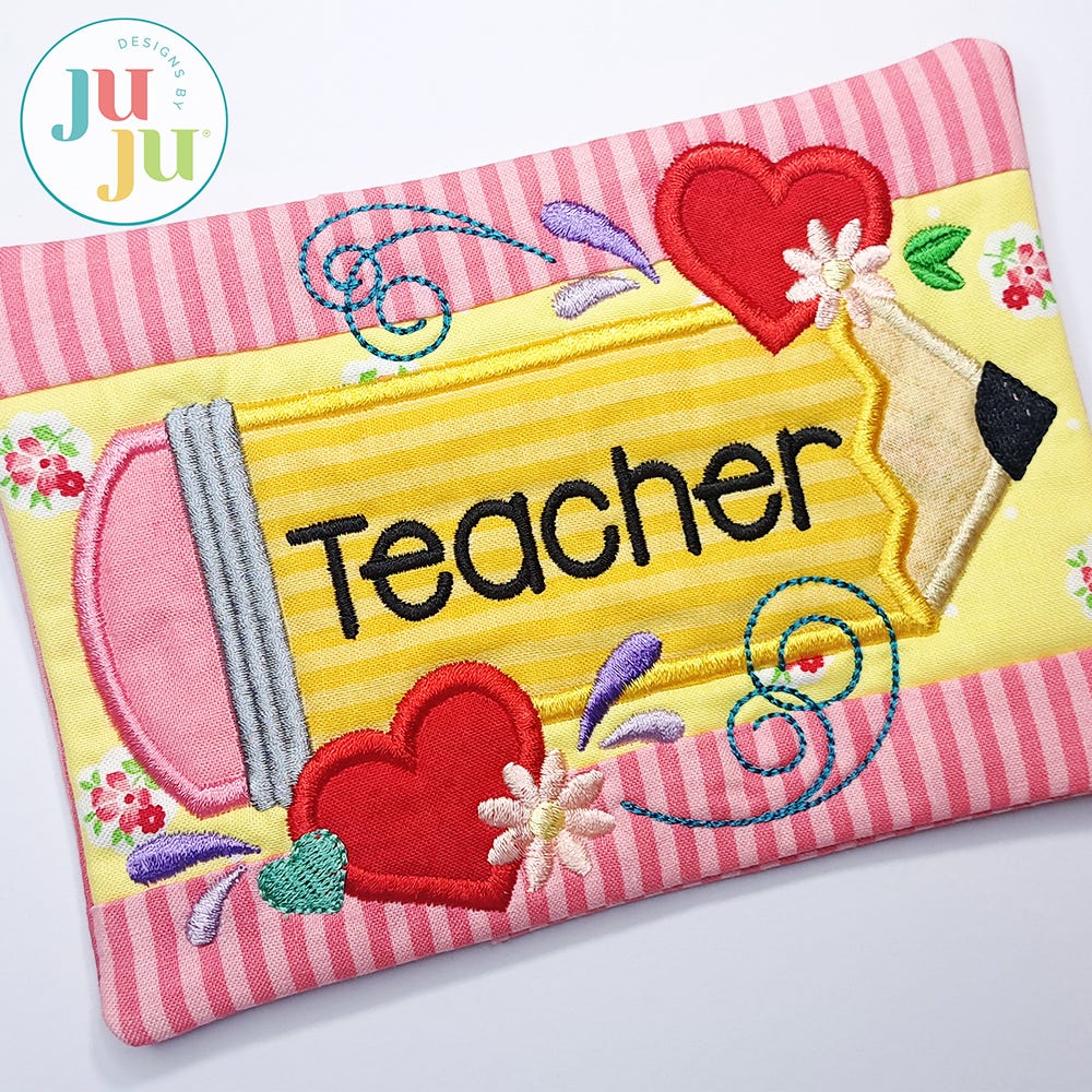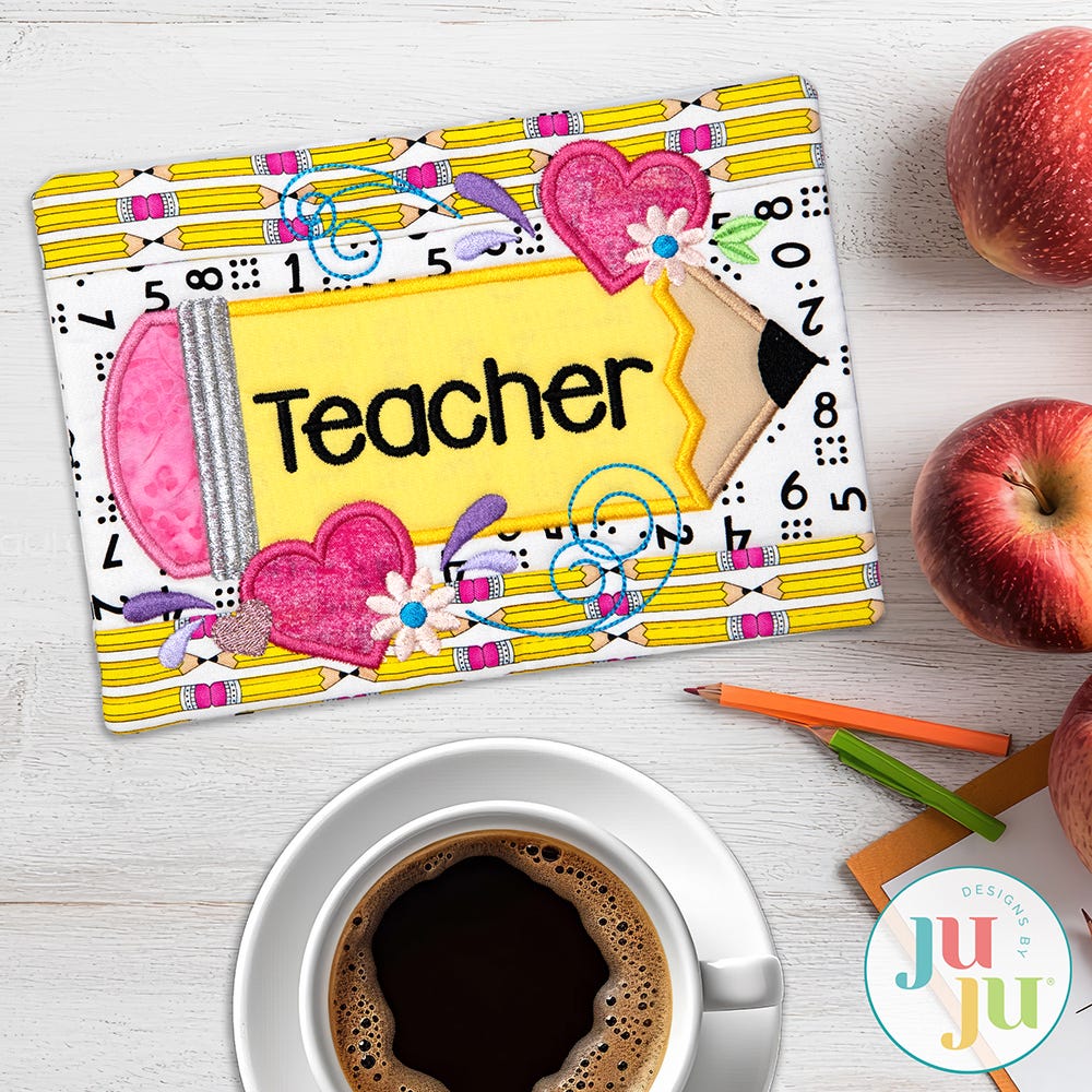 Start the school year "write" with a sweet gift for your new teacher! This mug rug features an applique pencil with sweet hearts and floral accents. The "Teacher" text is included in the design file, as pictured. (For reference, the font used is Lego House, sold separately.)