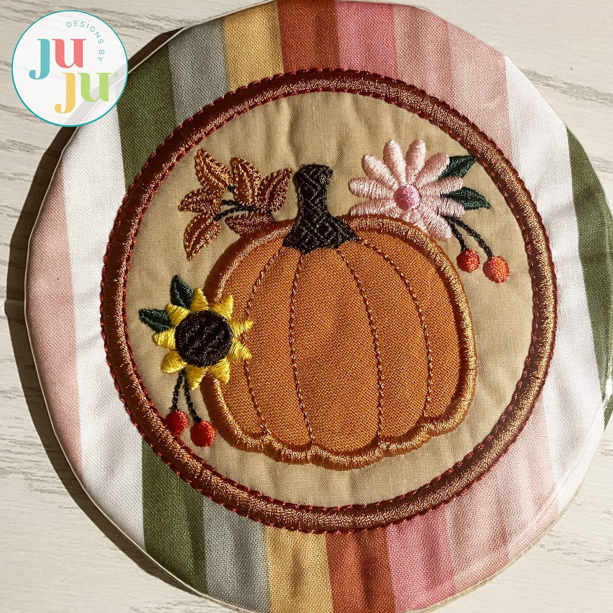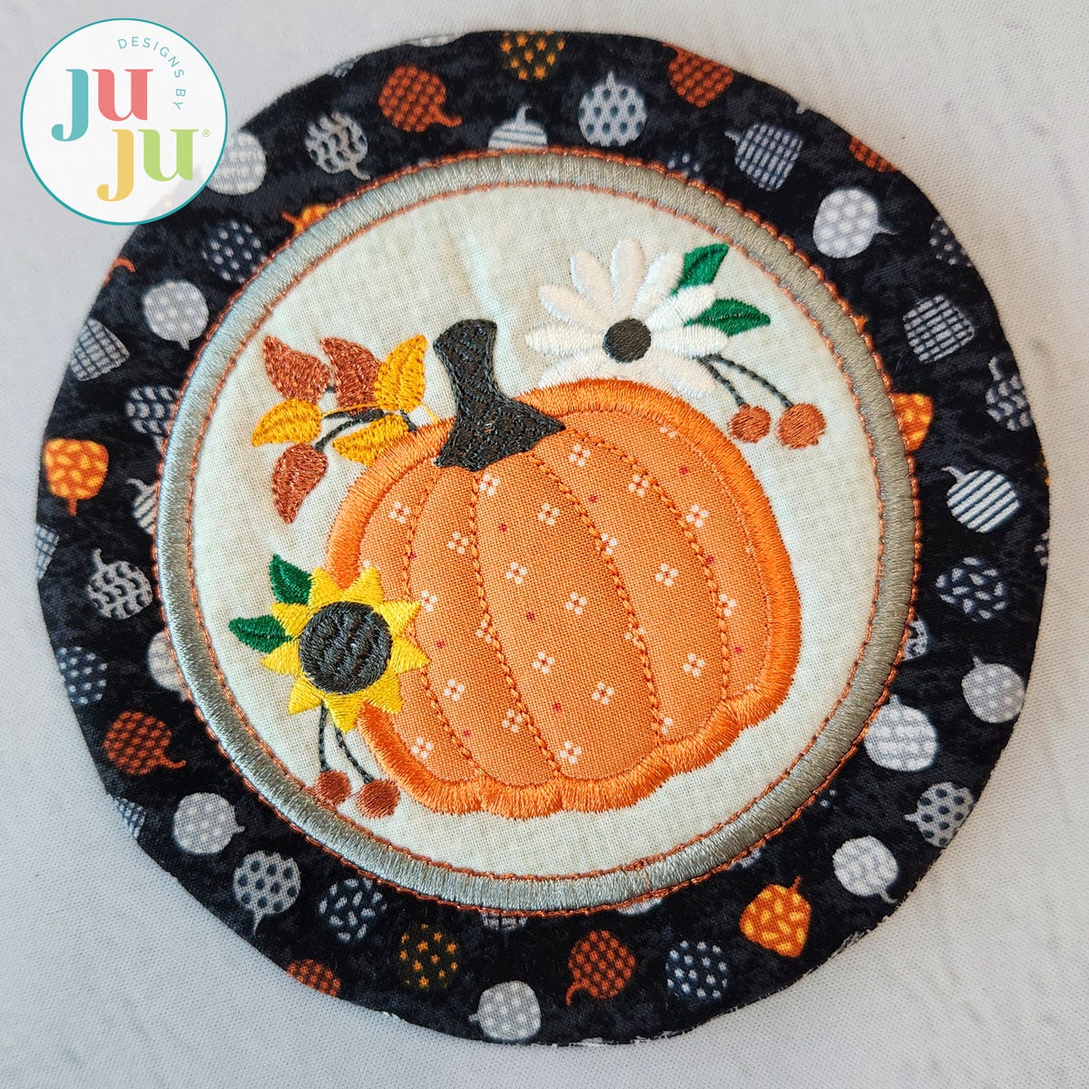 Designed to coordinate with our Modular Pretty Pumpkins in-the-hoop project series! With a wide range of sizes, this Pretty Pumpkin Coaster can be used as a mug rug, trivet, or candle mat.