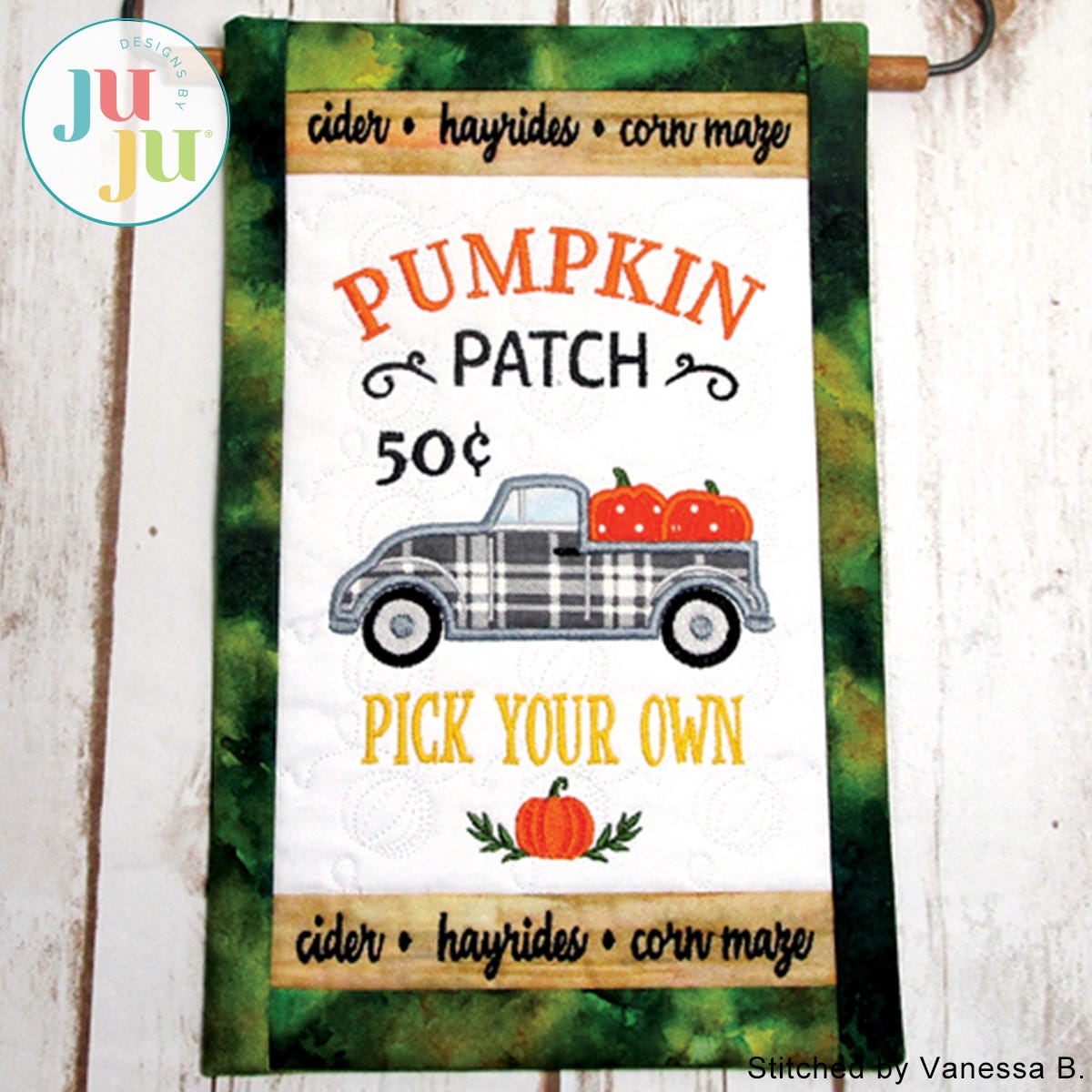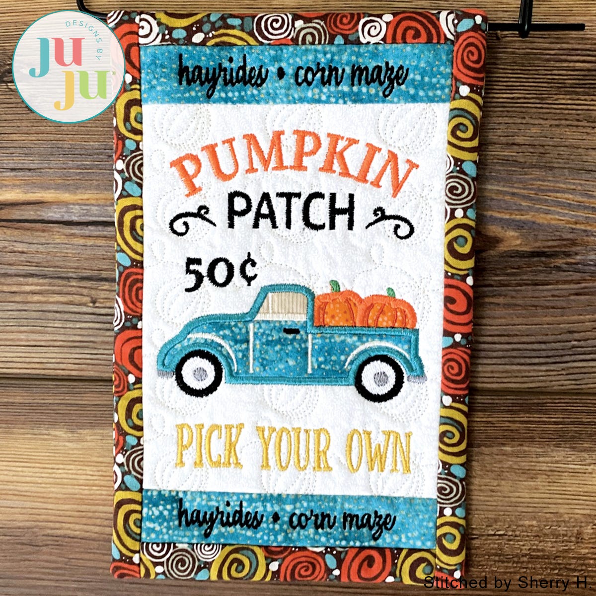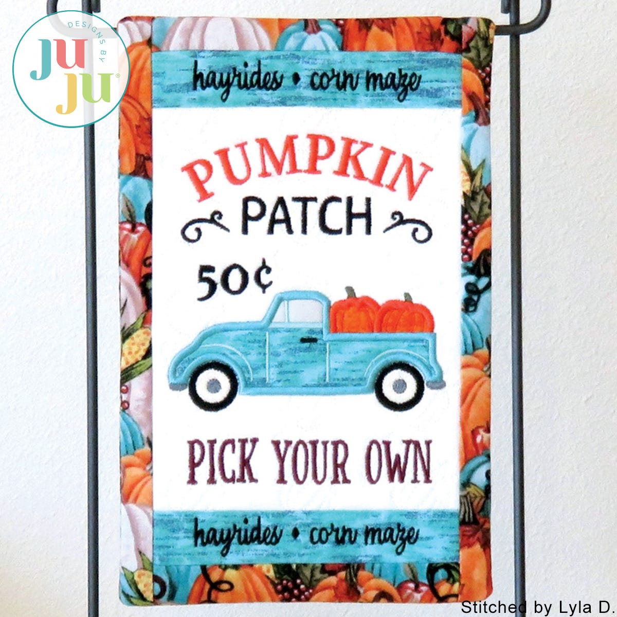 The truck, window, and pumpkins are appliqued. It’s easy to do; we show you how.