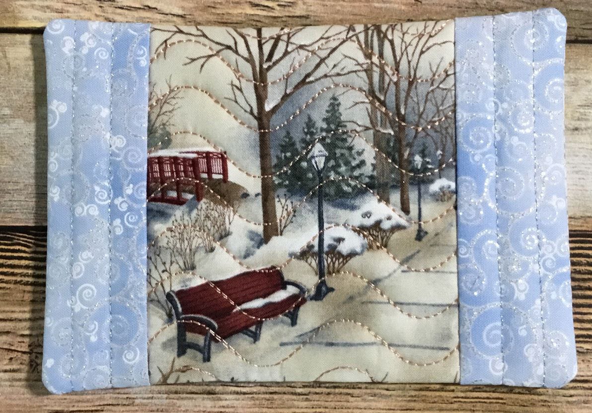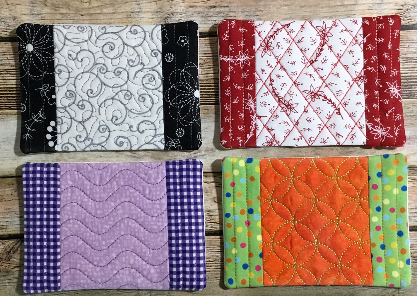 Introducing our set of quilted mug rug quilt patterns, perfect for creating beautiful in the hoop mug rugs. These patterns allow you to craft mug rugs in four different quilting styles: stipple, crosshatch, waves, and double wedding ring. Each mug rug features a centered panel and two elegant side borders with simple quilting on the side panels.