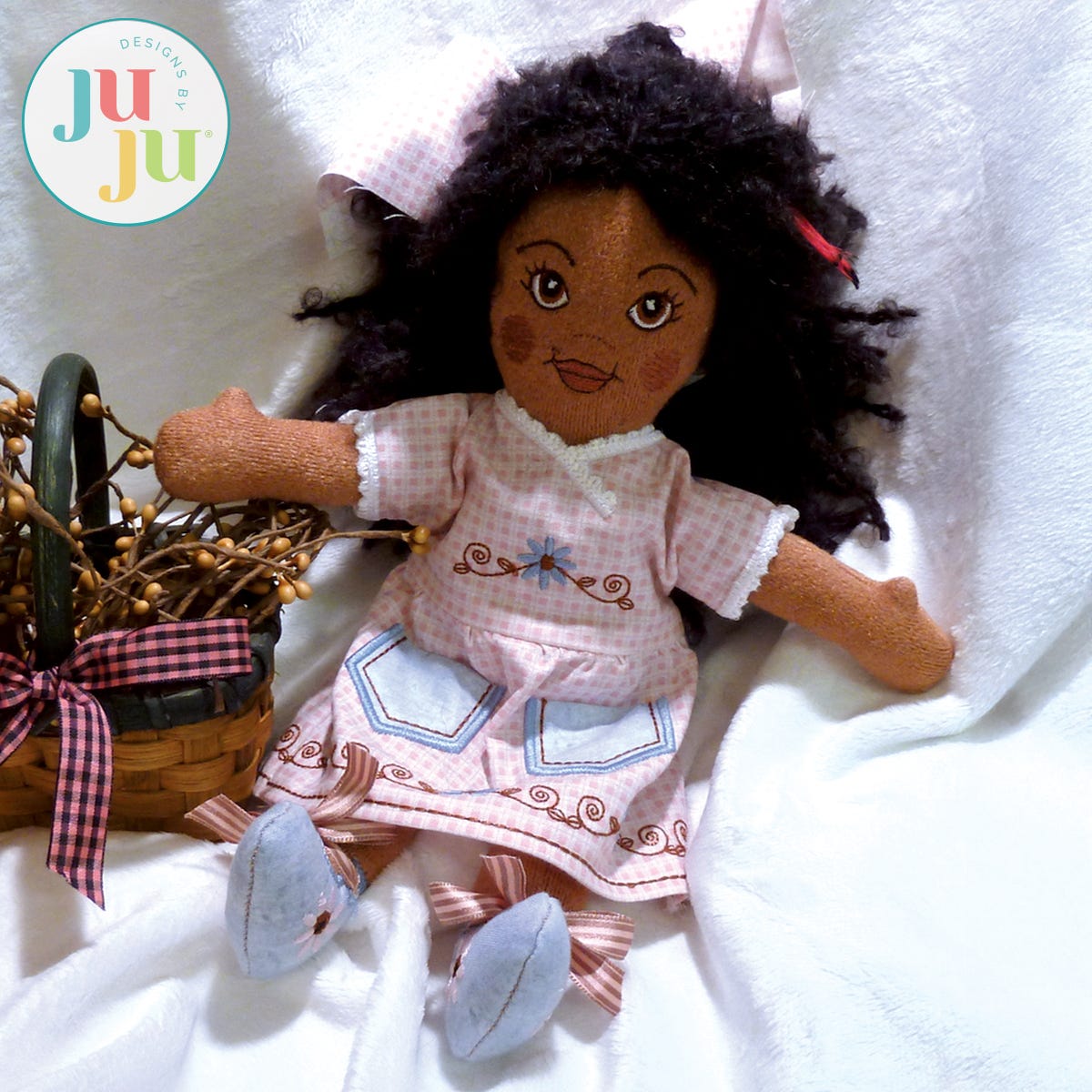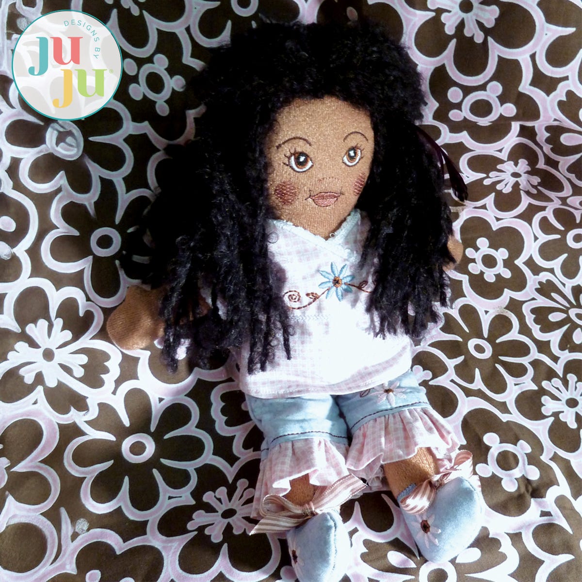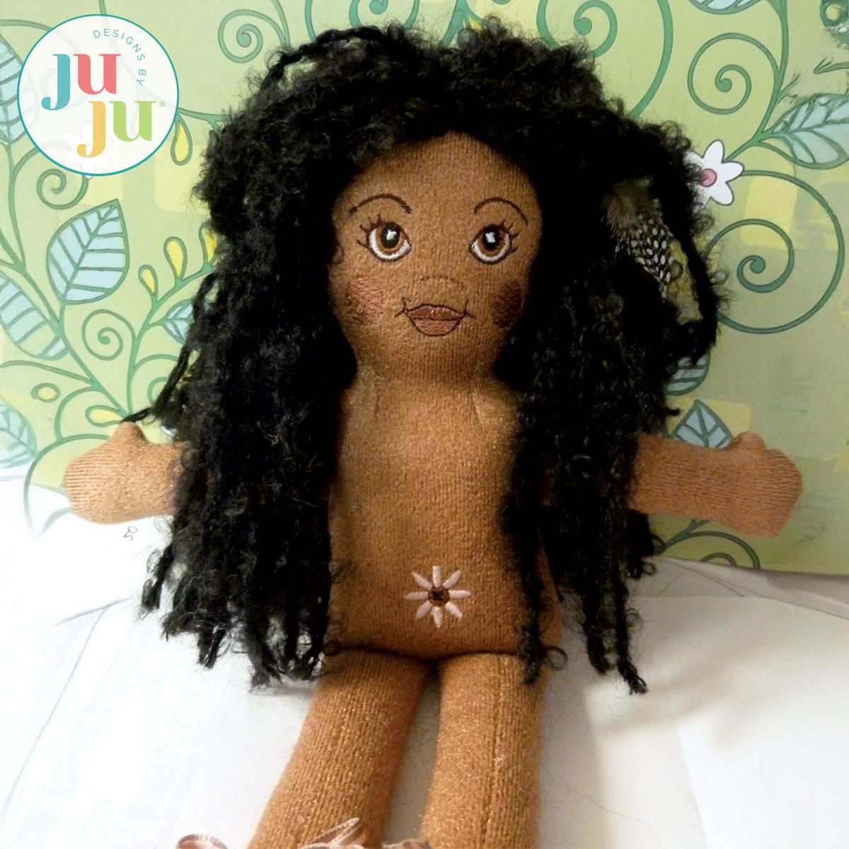 This doll is an in the hoop project for 5x7 hoops. The doll comes with patterns for an embroidered dress, a top, a pair of pants, and undies. The clothing items are mostly completed in the hoop, with some machine and/or hand sewing required. Shoes are appliqued to the legs and a little daisy is stitched for Daisy's belly button.