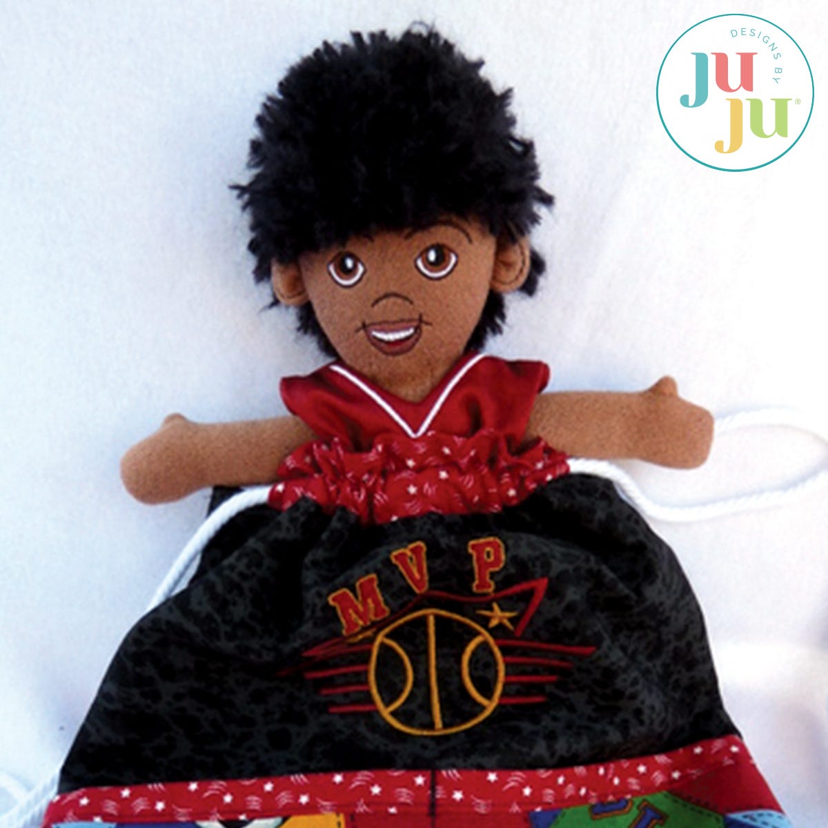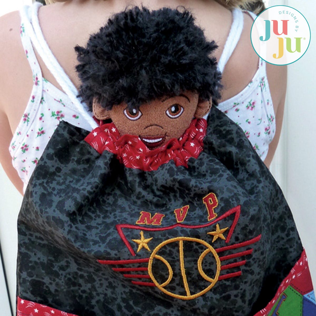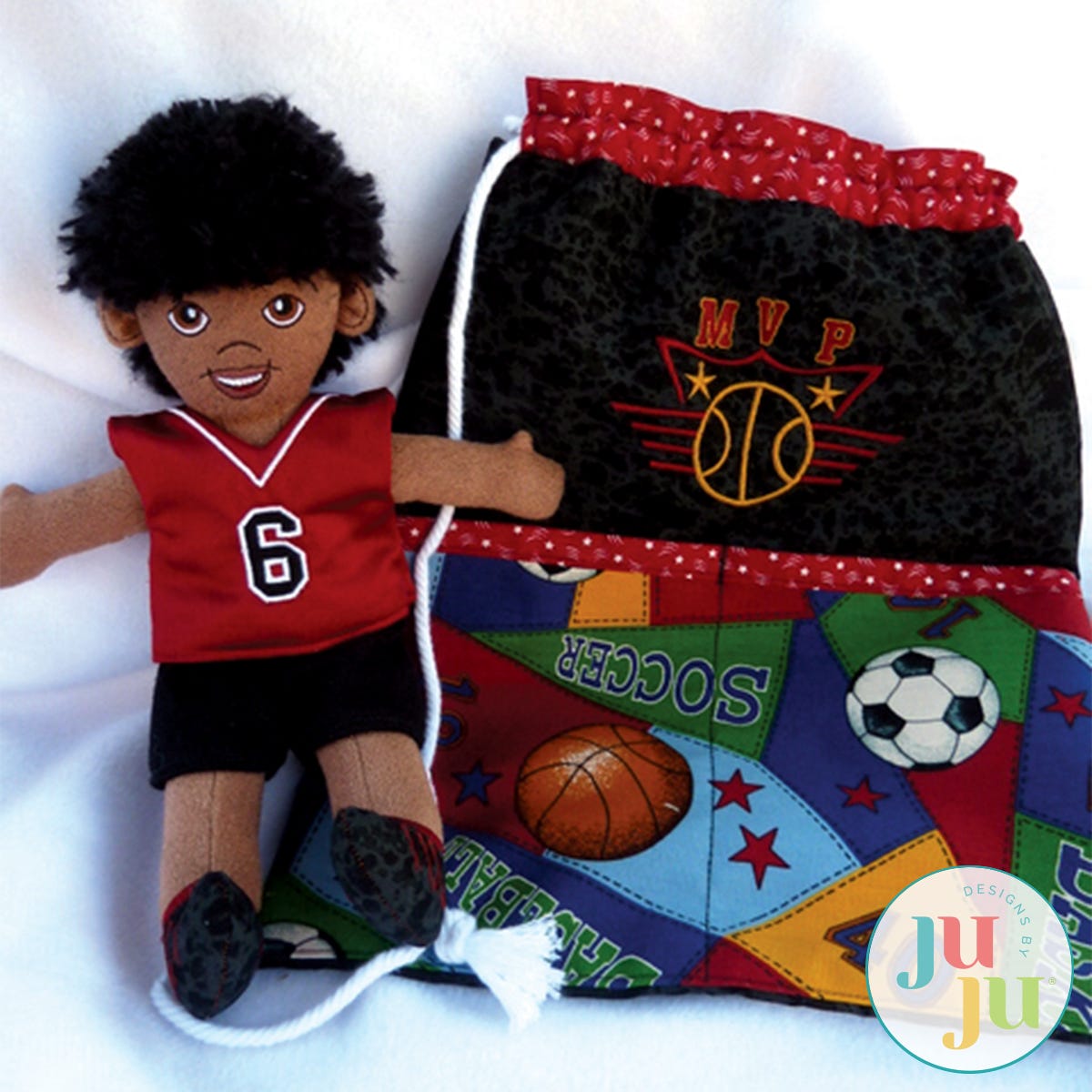 This boy doll is the brother to our Daisy doll, an in-the-hoop project for 5x7 hoops. The doll comes with patterns for an embroidered T-shirt, sports jersey and pair of shorts. The clothing items are mostly completed in the hoop, with some machine and/or hand sewing required. You have the option of appliqueing shoes to the legs or having plain legs and feet so you can put purchased doll shoes on the little fellow. The belly button is a little basketball., just for the fun of it! Also part of your purchase is a pattern for a child's lined drawstring backpack with a large outside pocket. Also part of your purchase is a pattern for a child's lined drawstring backpack with a large outside pocket. Detailed PDF instructions included.