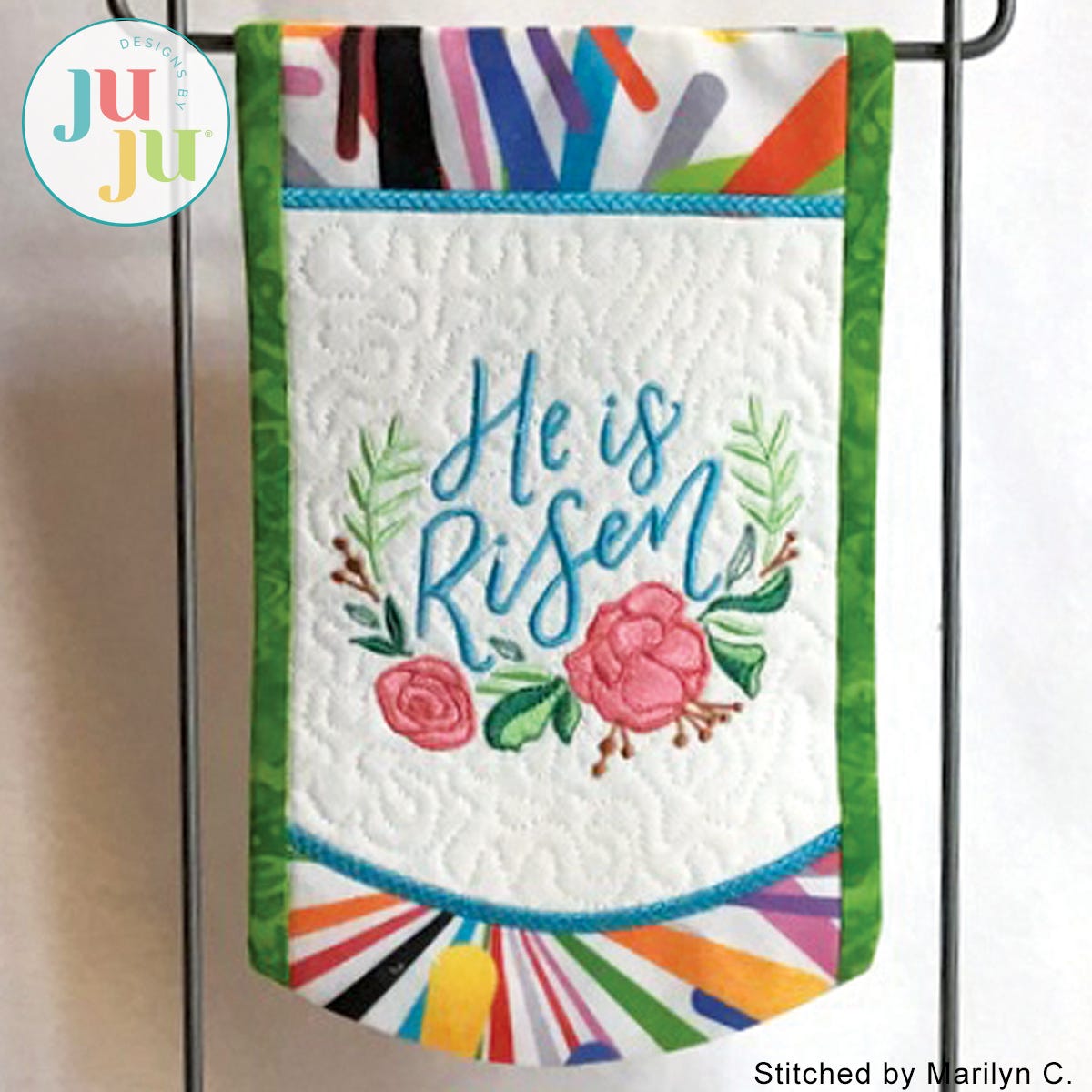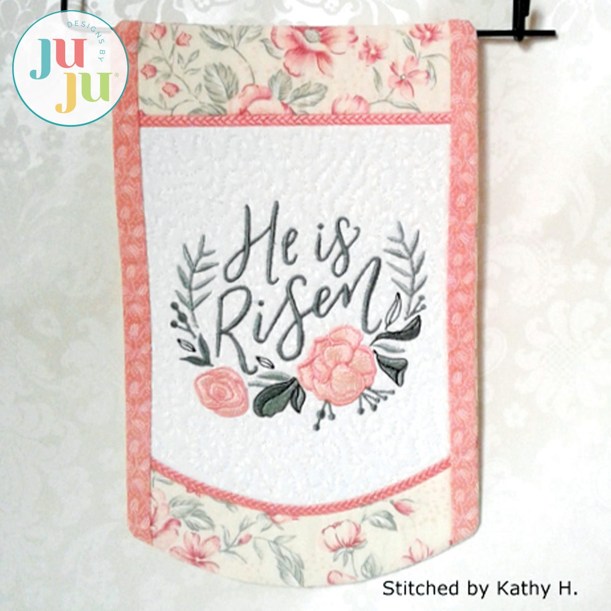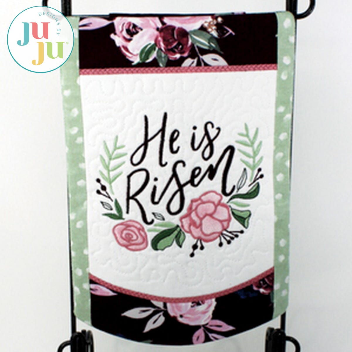 Decorate your home for Easter with this beautiful inspirational banner. The top and bottom borders are reverse appliqued and the applique edge has a delicate braid pattern. The banner's background is stipple quilted in the hoop and the side border strips are applied during the in the hoop process. There is a "sleeve" in the back for hanging the quilt. The sleeve is applied during the embroidery. No additional hand or sewing machine stitching is required.
