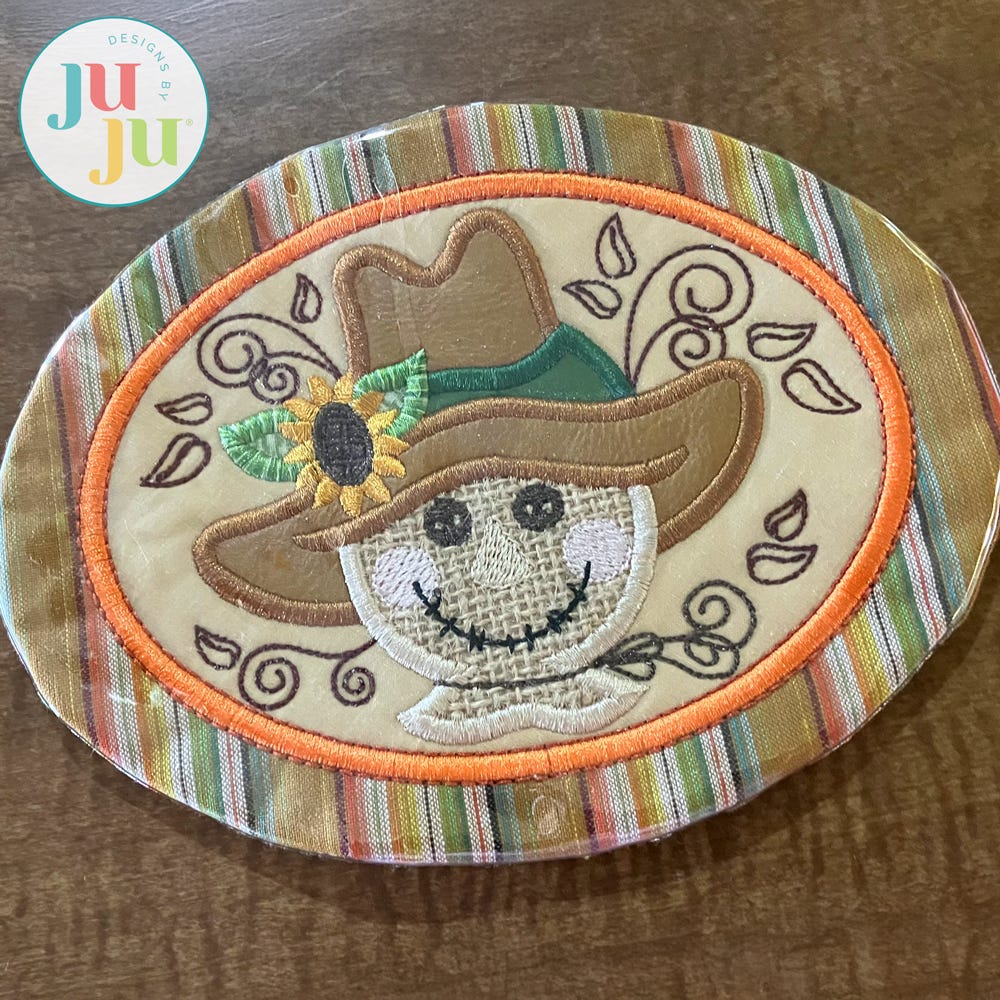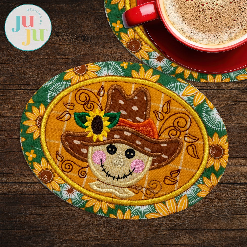 Add a touch of Fall flair to your table! Designed to coordinate with our Modular Scarecrow in-the-hoop project series! With a wide range of sizes, this Scarecrow Coaster can be used as a mug rug, trivet, or candle mat.