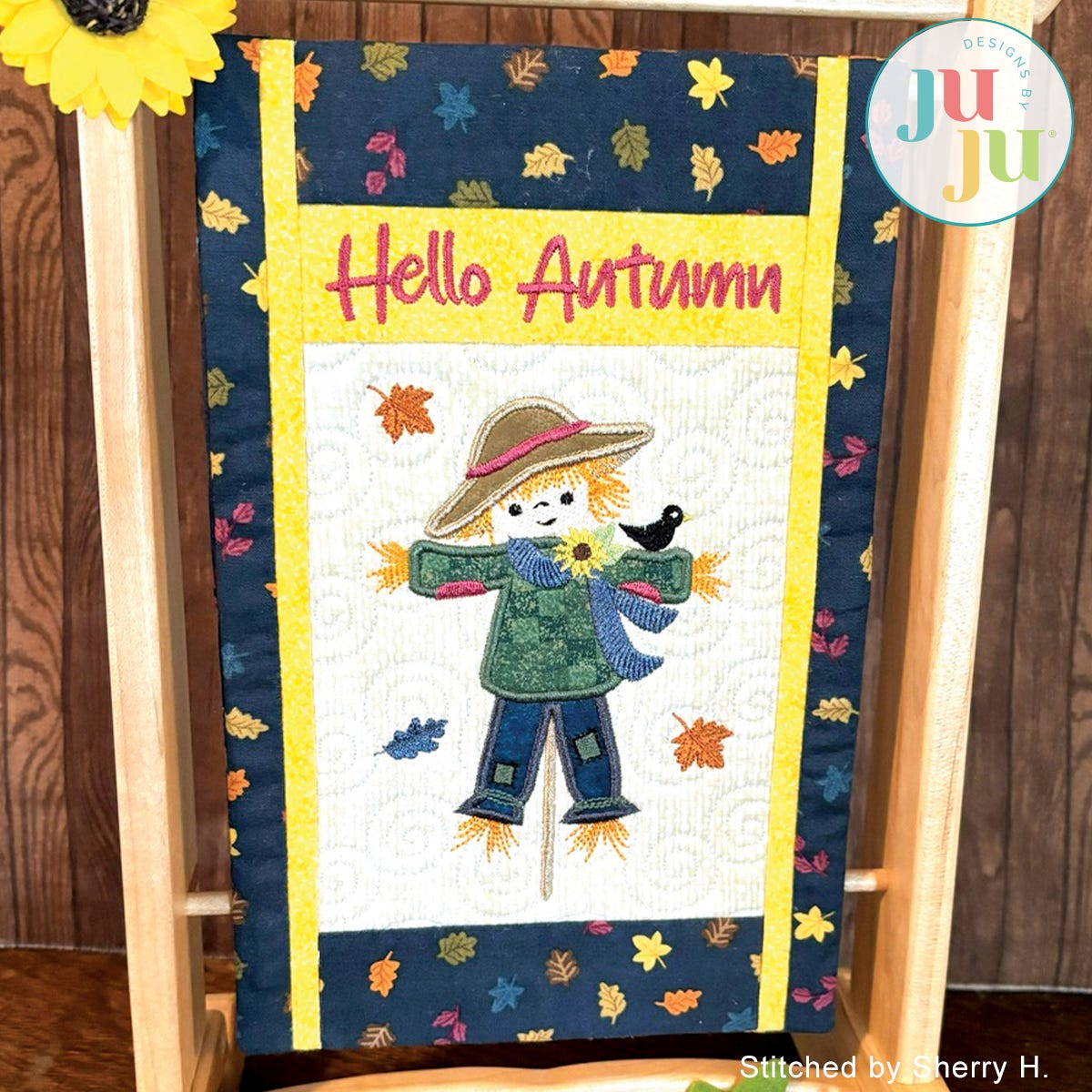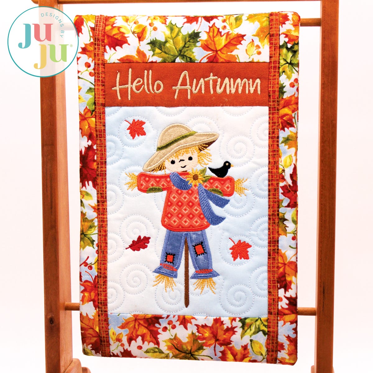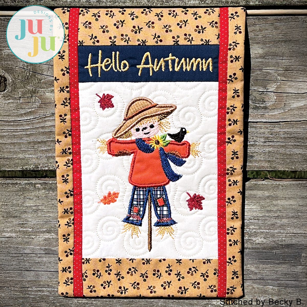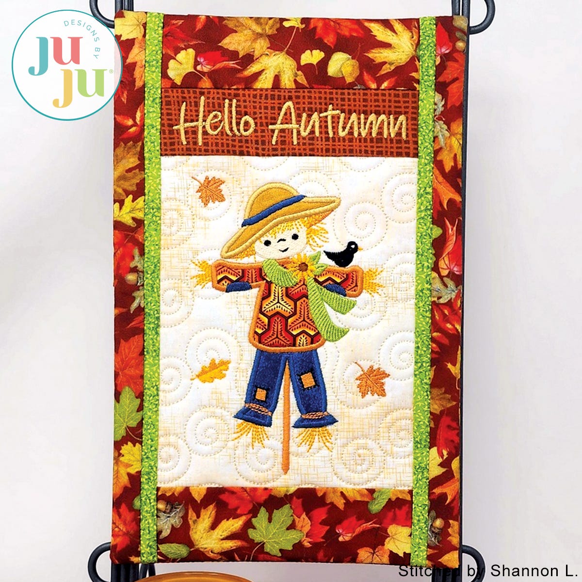 What fun seasonal project for decorating your home or office. The background of the mini quilt is quilted in the hoop and the various borders get attached during the in the hoop process. There is a “sleeve” in the back that will make it easy to hang the quilt. The sleeve, too, is applied during the embroidery process. No additional hand or sewing machine stitching is required.