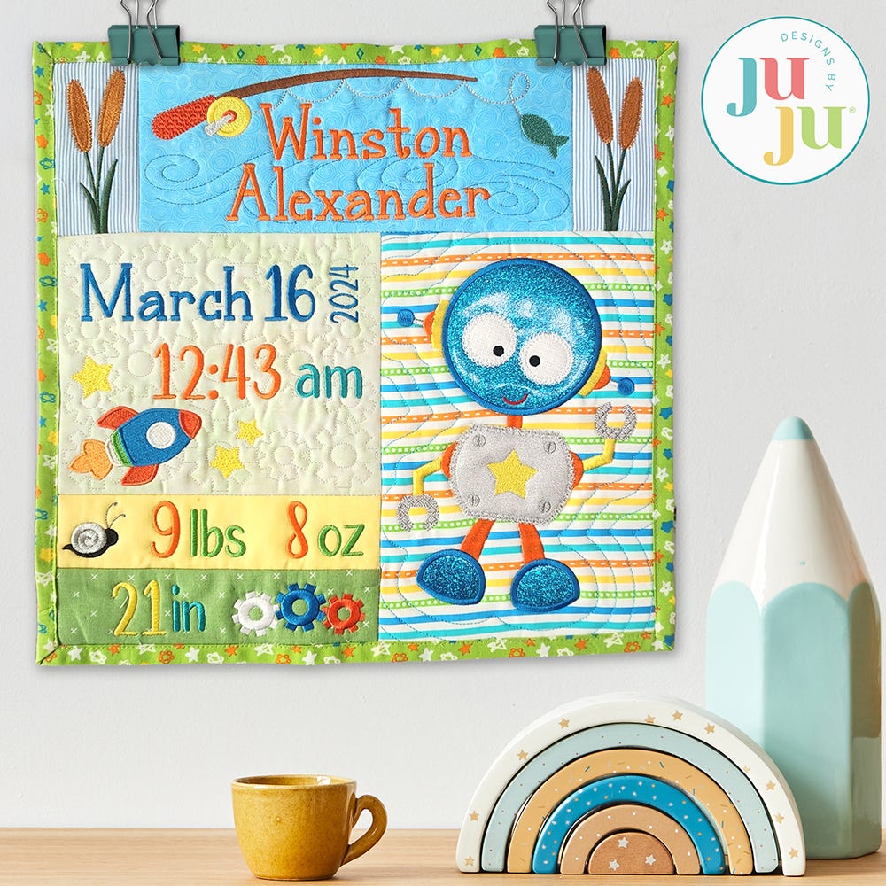 The cutest way to display baby's birth details is now available! Designed to coordinate with our Snips and Snails Baby Quilt, this sweet wall hanging features embroidered details of the things little boys love: fishing pole, cattails, rocket ship, snail and gears, plus three options for the large applique block: a dinosaur, dog or robot. Personalize the blocks by adding baby's name, birthdate, time of birth, weight and height in the font(s) of your choice, sold separately.