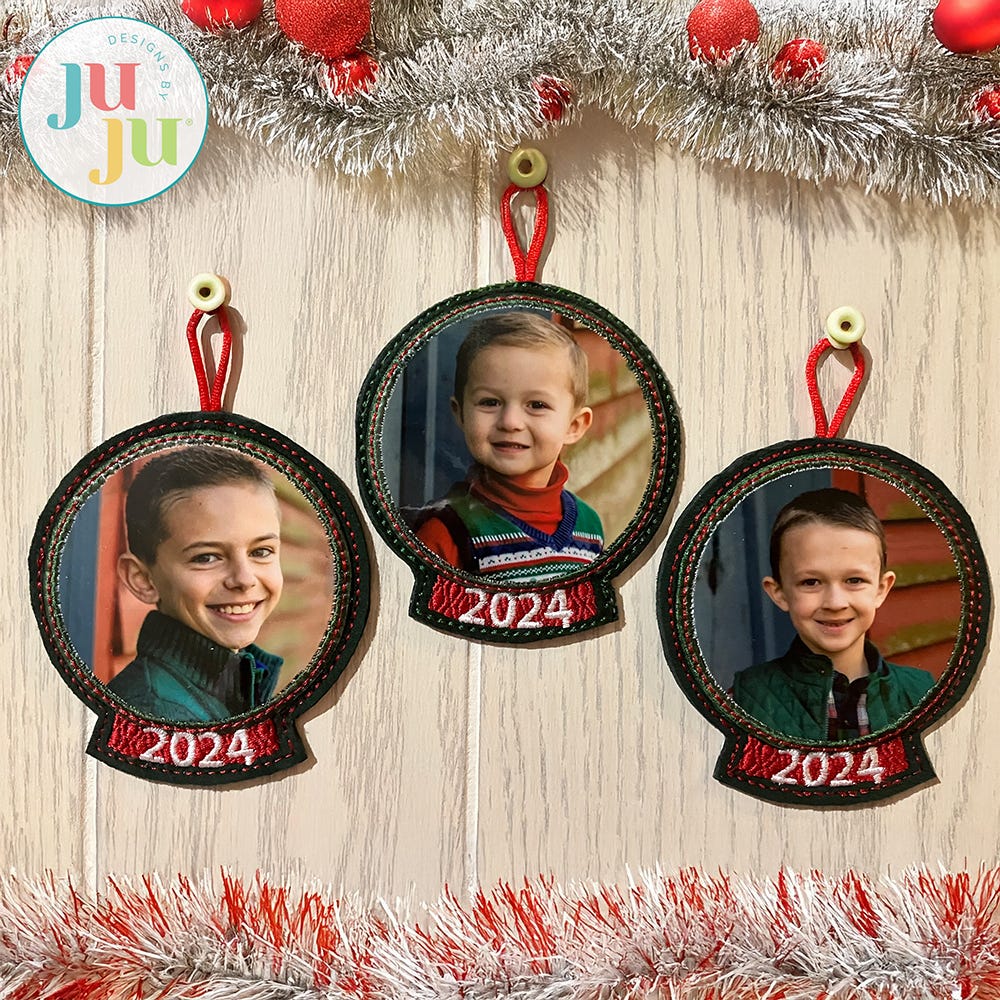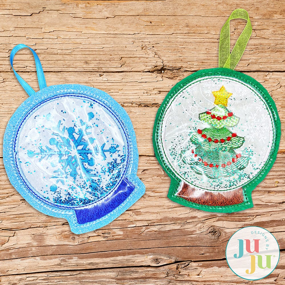 Designed to be made with vinyl or felt. After the embroidery design inside the snow globe is complete, clear vinyl is tacked down and chunky glitter is inserted into the ornament before the backing is added. Each ornament is made in one hooping; no additional sewing required! Use ribbon or cording for the hanger; embellish with bows or beads.