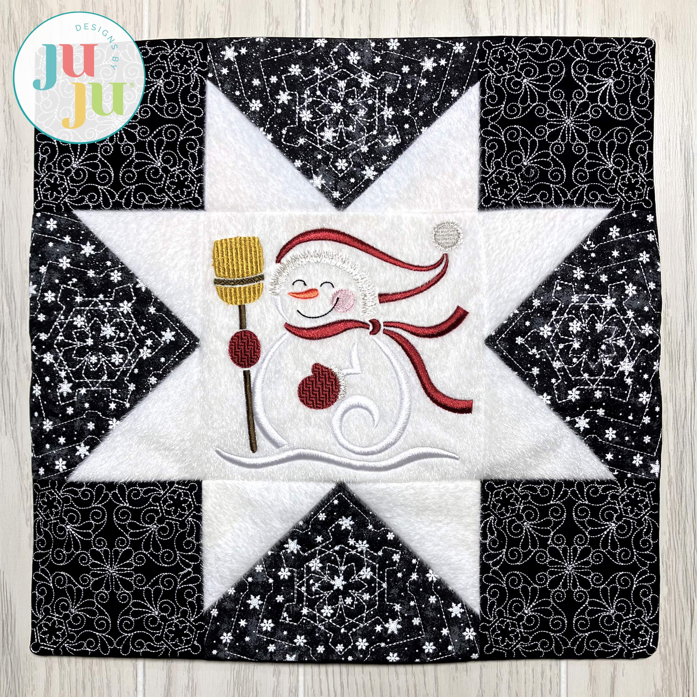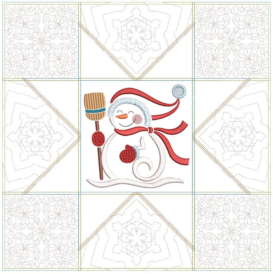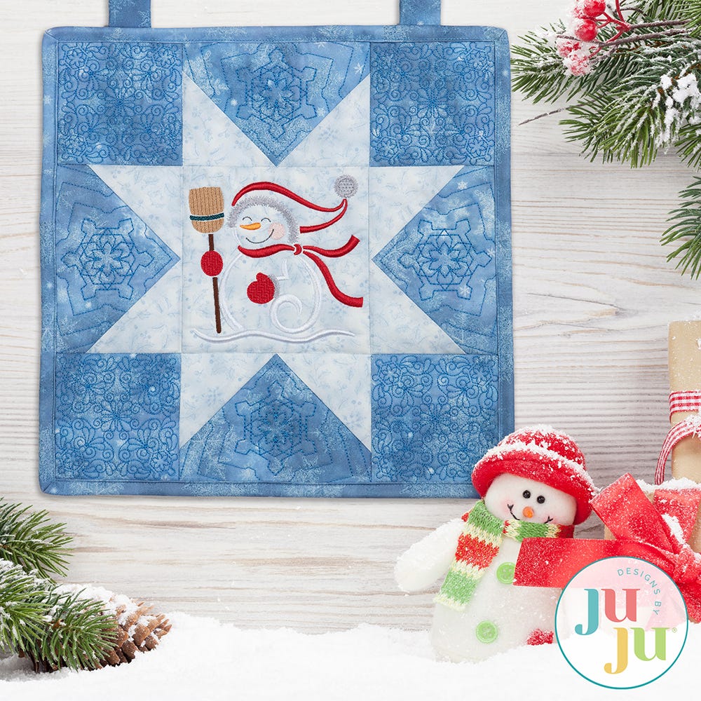 Add a cozy touch to your winter décor with our charming new mini quilt! This project is similar to a large sawtooth star quilt block. The center features an embroidery-only design of a sweet snowman. It's the perfect size for a little table decoration. Add tabs for a wall hanging, or make it a pillow!