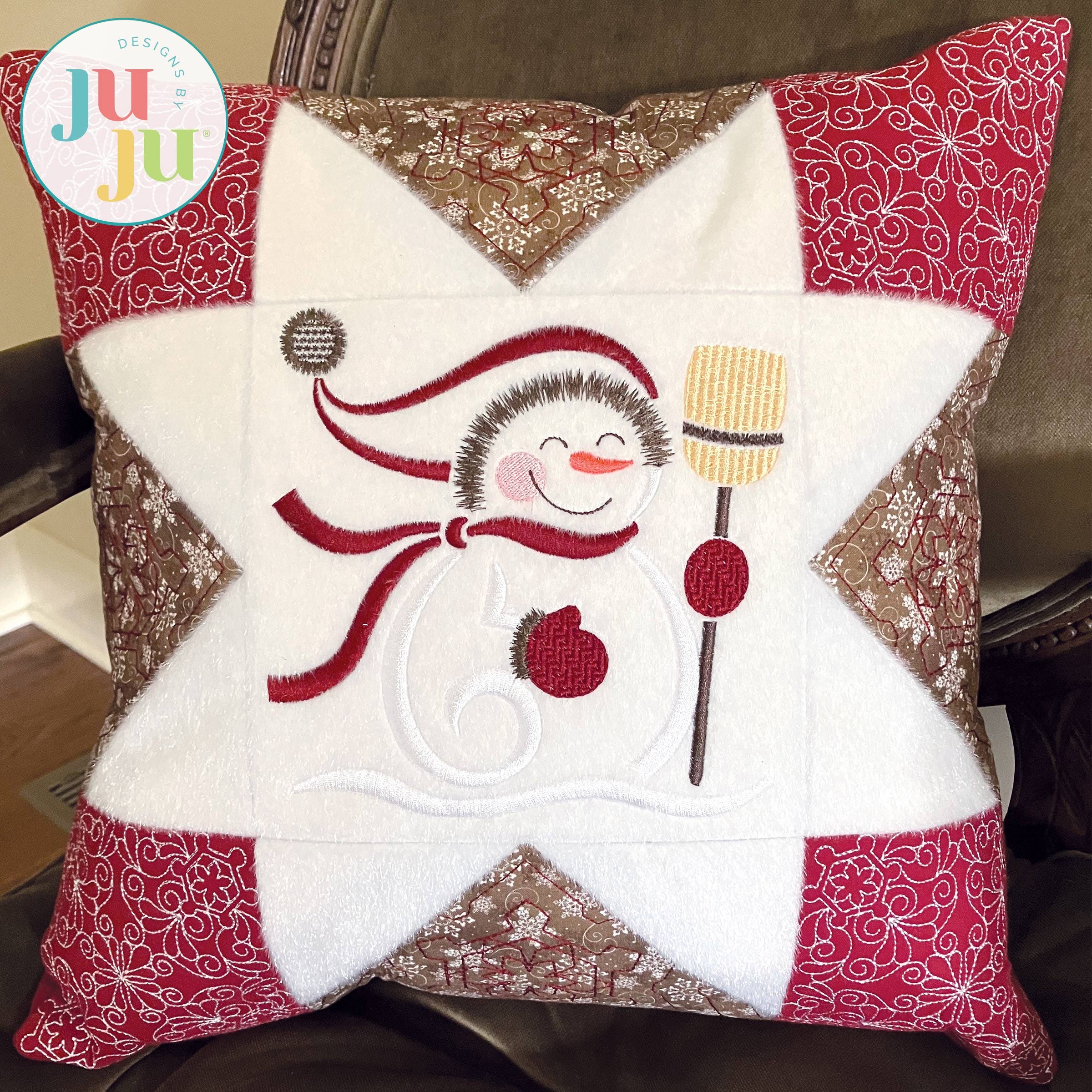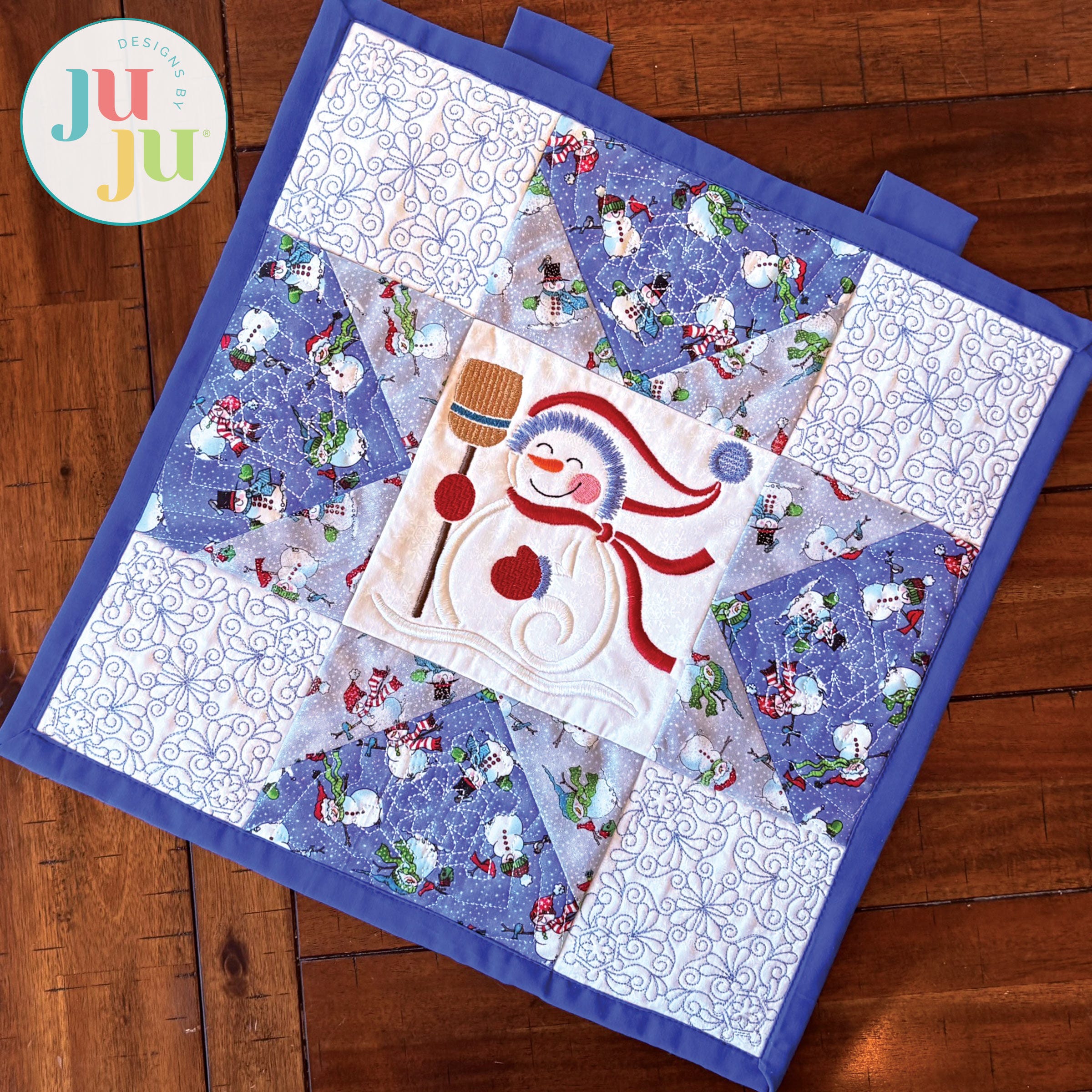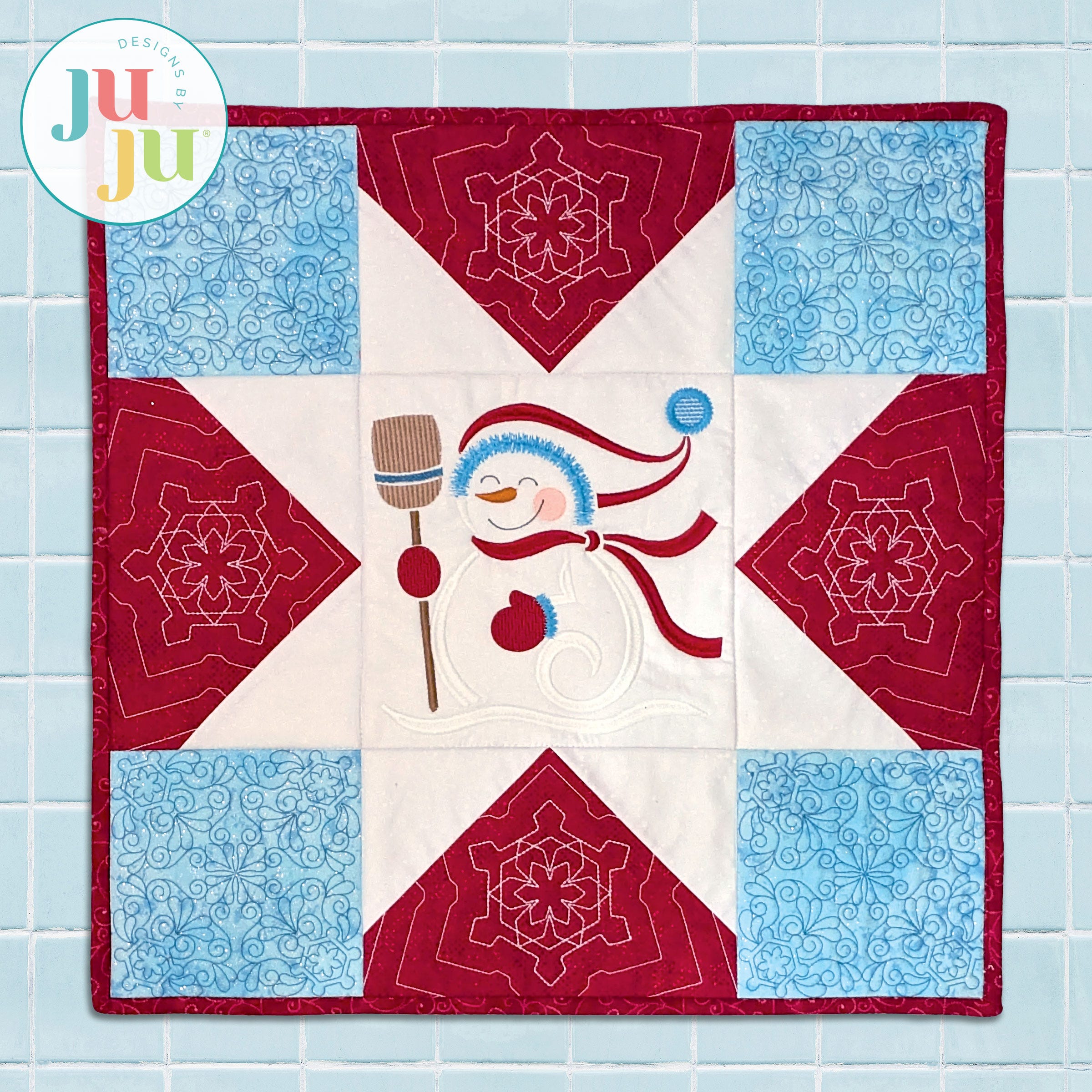 Add a cozy touch to your winter décor with our charming new mini quilt! This project is similar to a large sawtooth star quilt block. The center features an embroidery-only design of a sweet snowman. It's the perfect size for a little table decoration. Add tabs for a wall hanging, or make it a pillow!