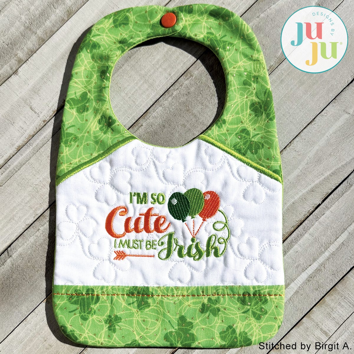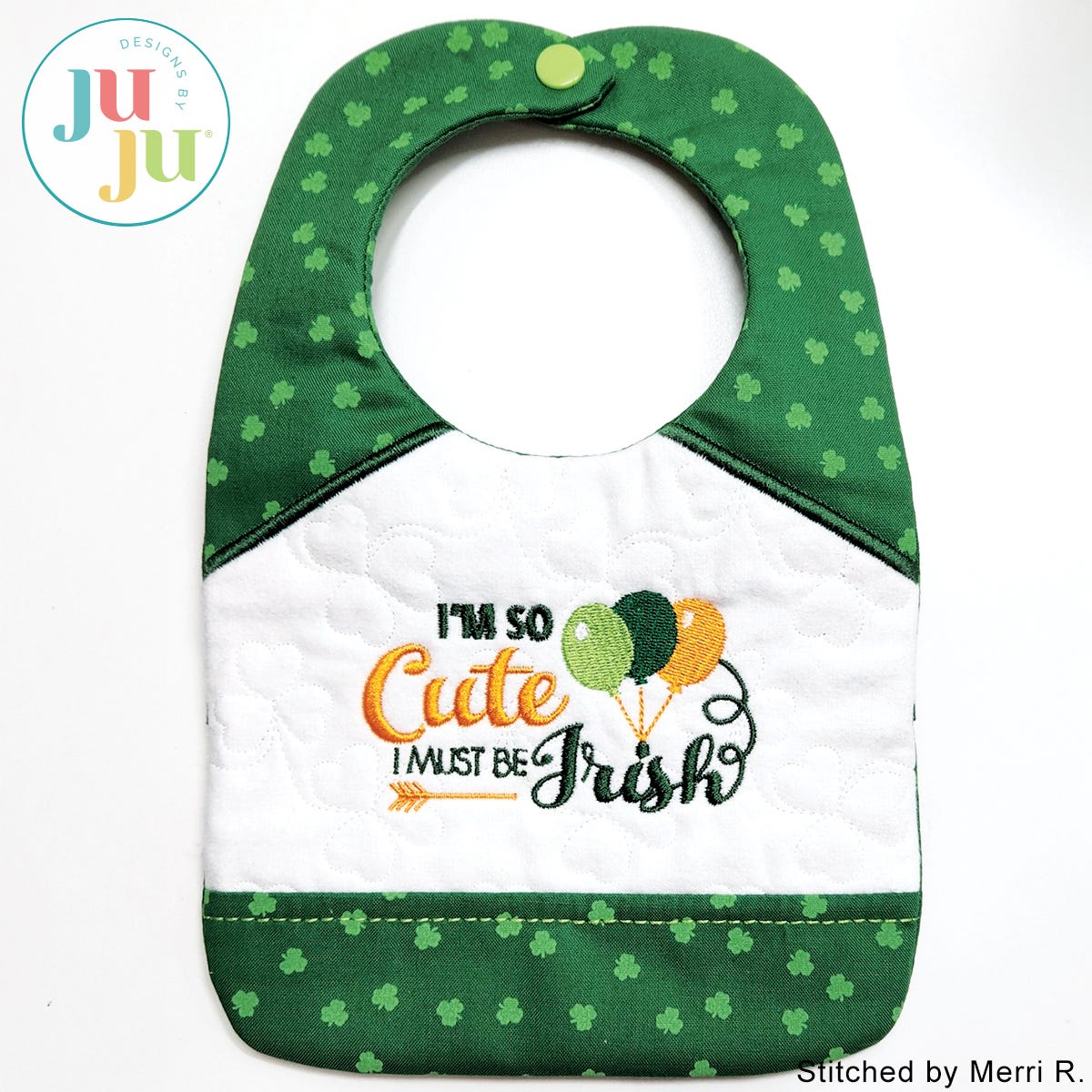 This adorable bib is entirely constructed in the hoop; no additional sewing machine or hand stitching required. The center background is quilted with a clover motif. Closure of the bib is accomplished with a plastic snap. The bib fits an infant up to 12 months old.