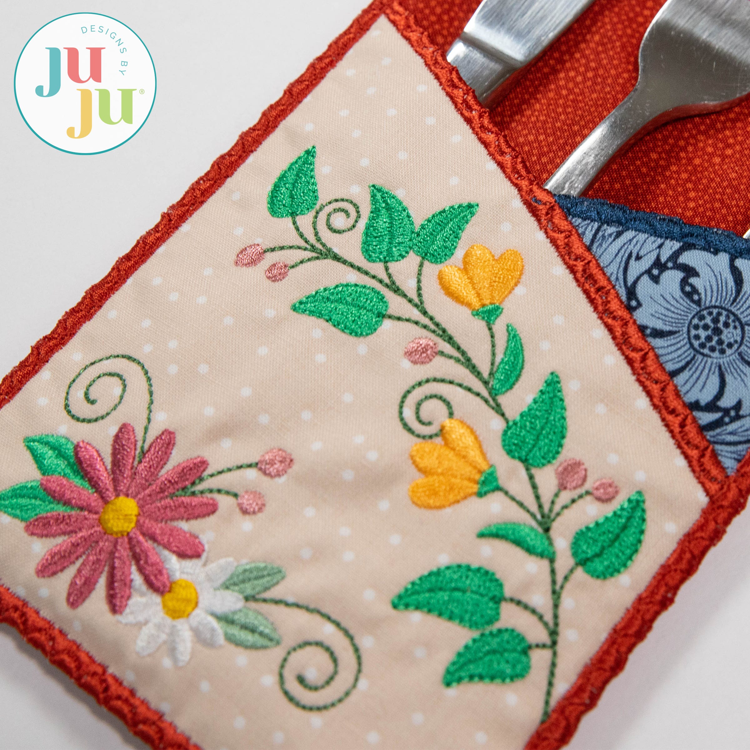 Keep your dining table elegant and silverware organized with a beautifully embroidered utensil holder! Featuring intricate stitched details, it adds both charm and functionality to your table setting. Our Spring Flowers Utensil Holder is designed to coordinate with our Modular Flower Pot in-the-hoop project series.