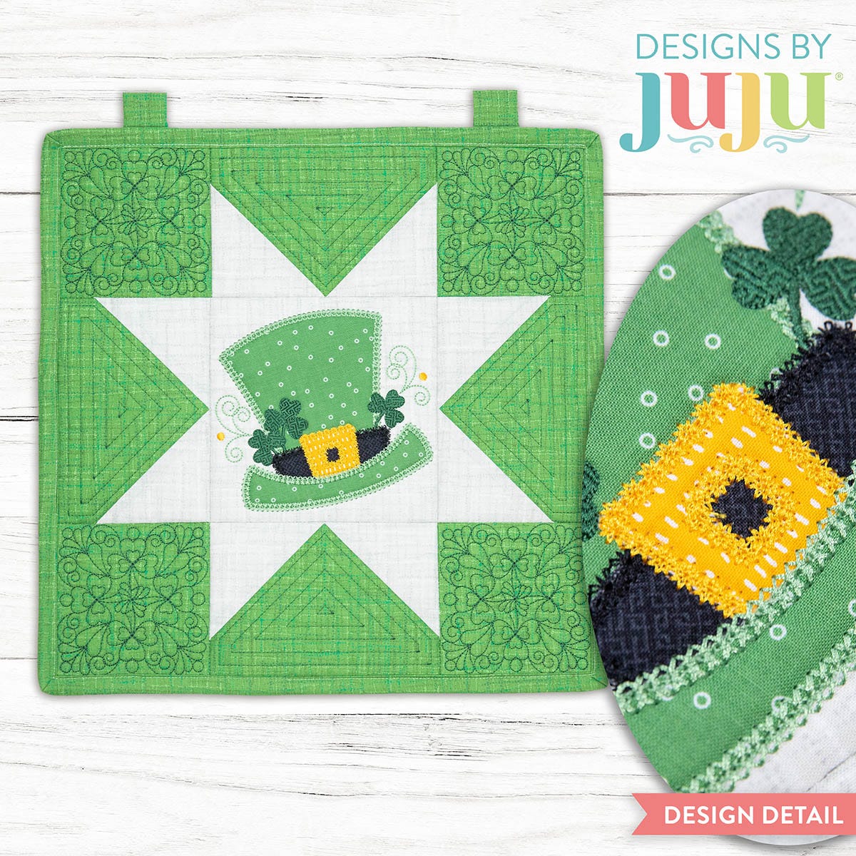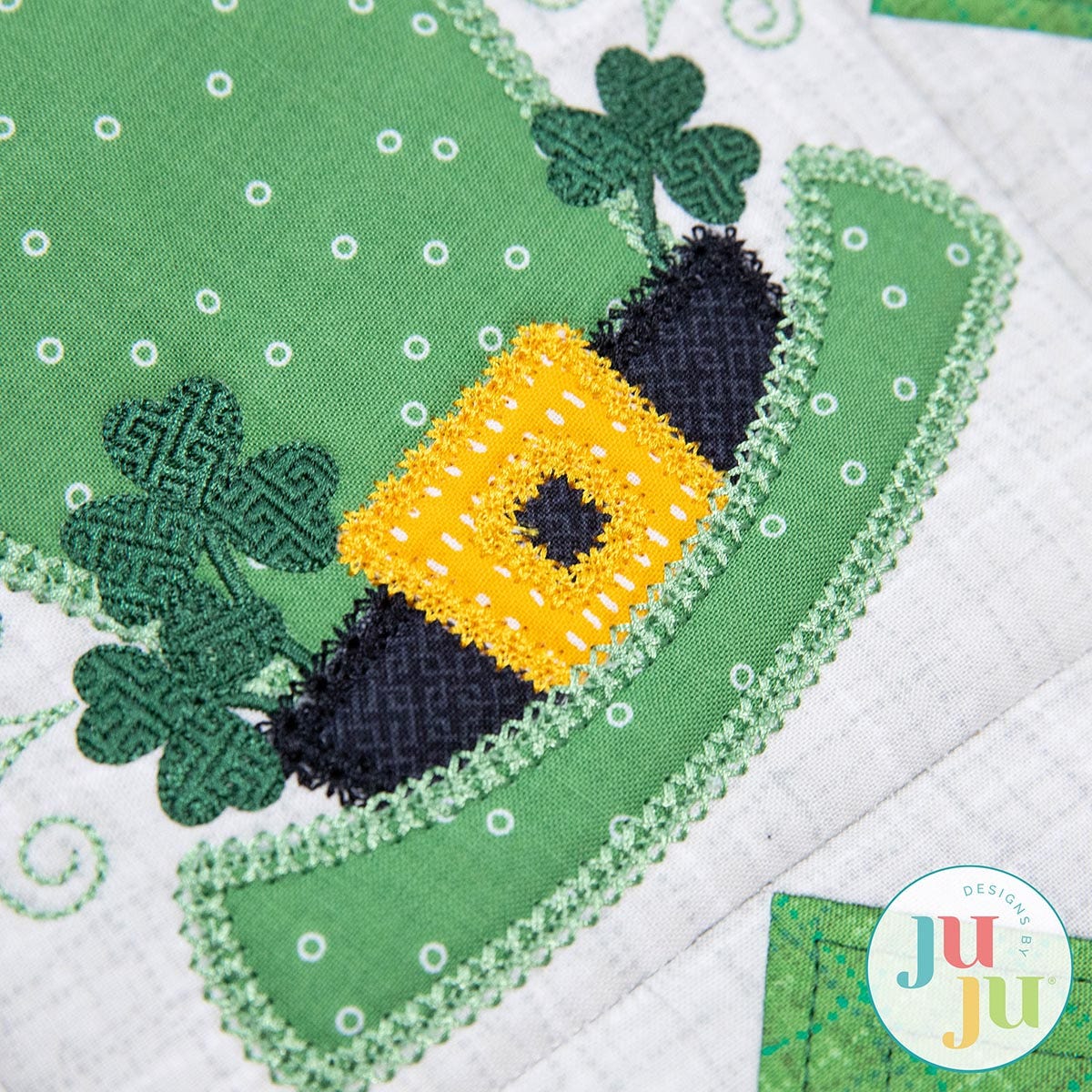 Decorate for St. Patrick's Day with our new mini quilt! This project is similar to a large sawtooth star quilt block. The center features an applique leprechaun hat with shamrocks. It's the perfect size for a little table decoration. Add tabs for a wall hanging, or make it a pillow!
