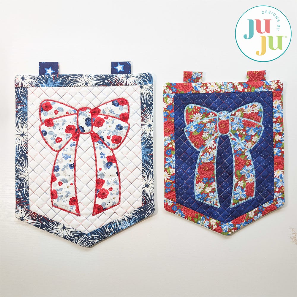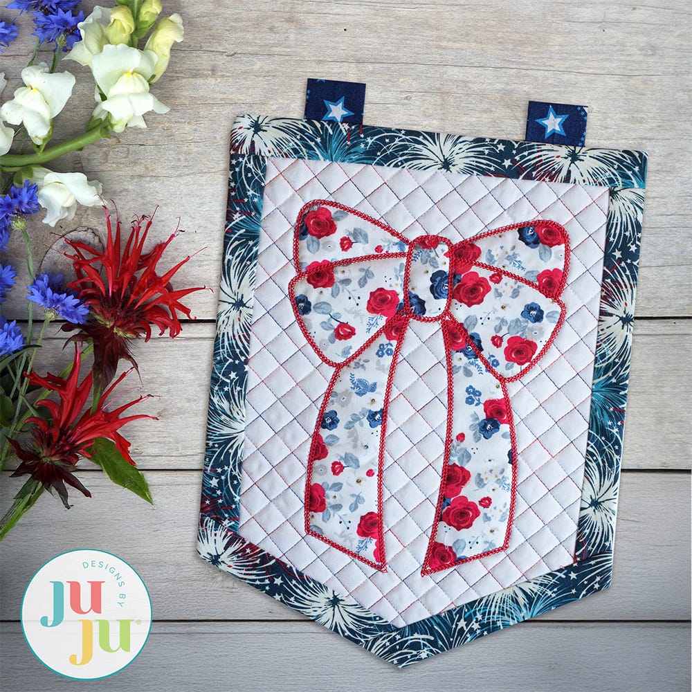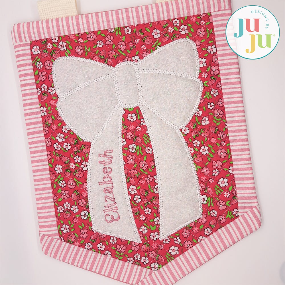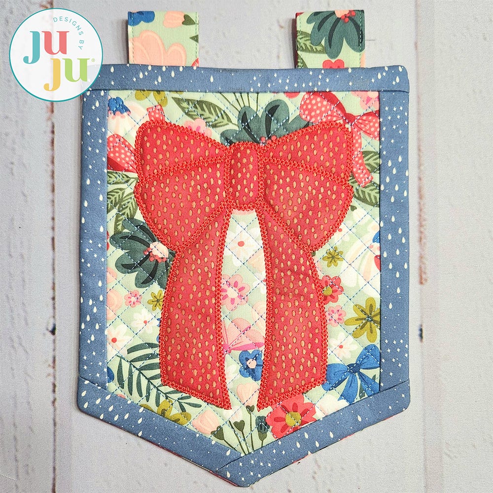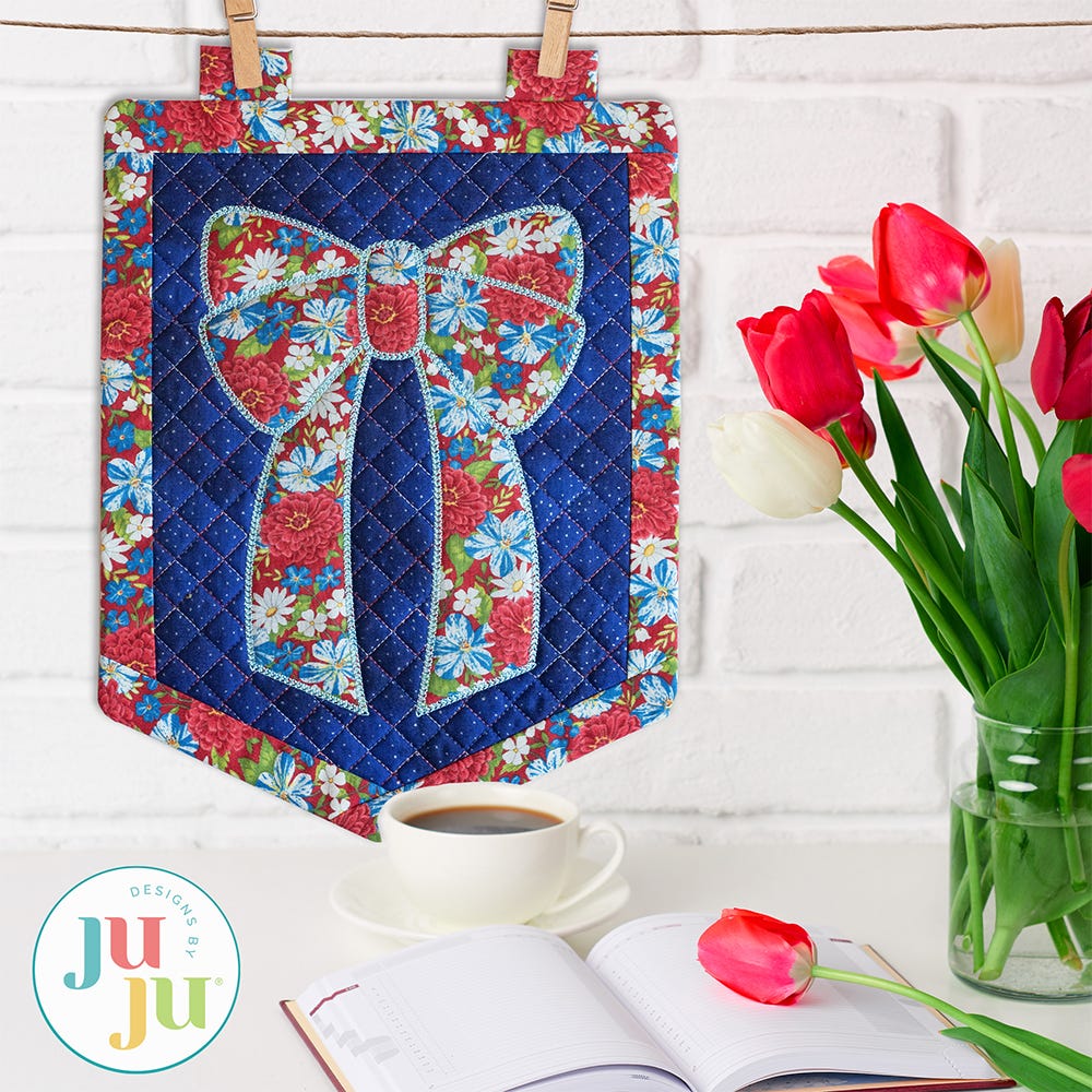Add a sweet and stylish accent to your space with this delightful mini wall hanging, adorned with an sweet applique bow. The pennant shape has narrow fabric borders around the applique bow, which is finished with a lovely chainstitch.