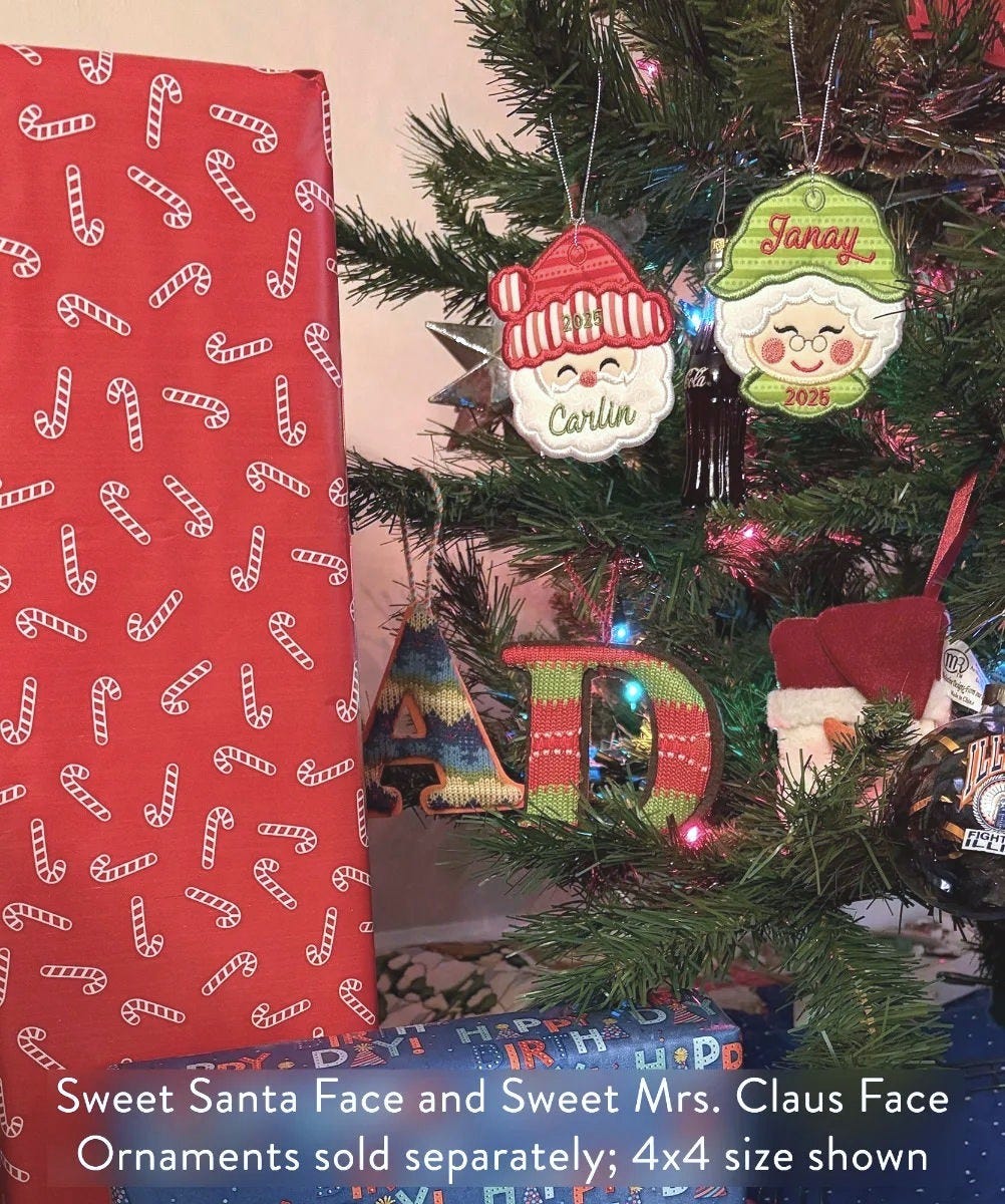 -The red "Carlin" 4x4 ornament uses the 0.5" size of our Requited Script for the name and the 0.25" size of our Ladybug Love font for the date. (The Sweet Mrs. Claus face ornament is sold separately.)