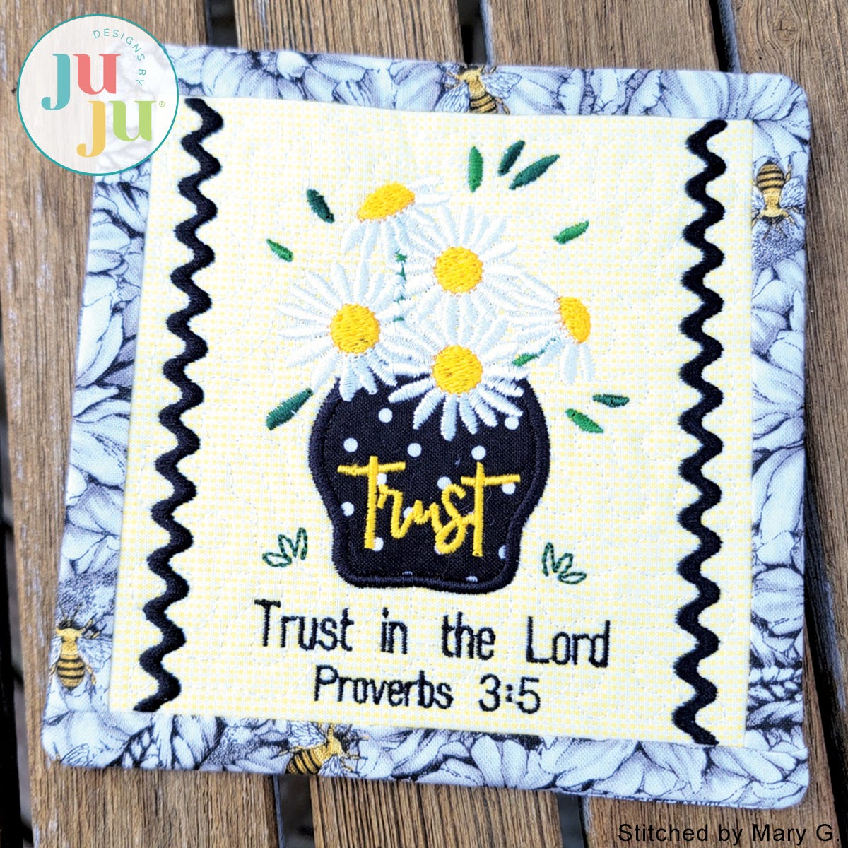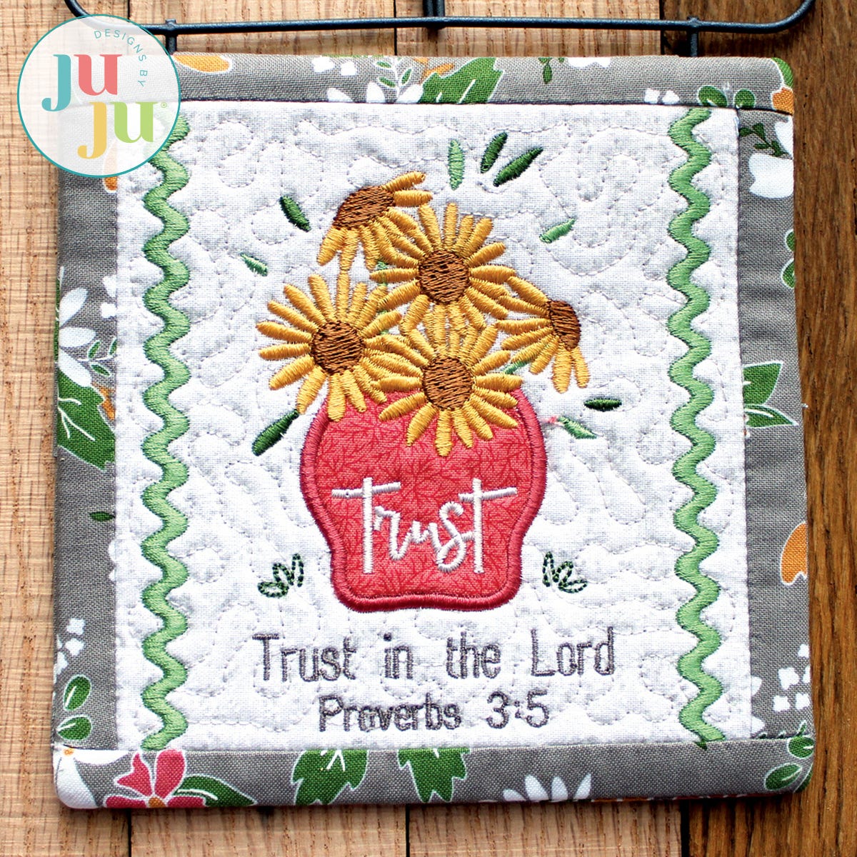 This tiny quilt is entirely stitched in the hoop. No additional hand or sewing machine stitching is required. The center background is quilted; the vase is appliqued. Thorough and detailed instructions as well as many photos are part of your purchase. Tiny quilts make beautiful home accents. They don't take up much room, yet add a special touch to your home decorating. The tiny quilt can be displayed on a small stand or hung from a 4" to 5" wall hanger. Tiny quilts also make a great gift.