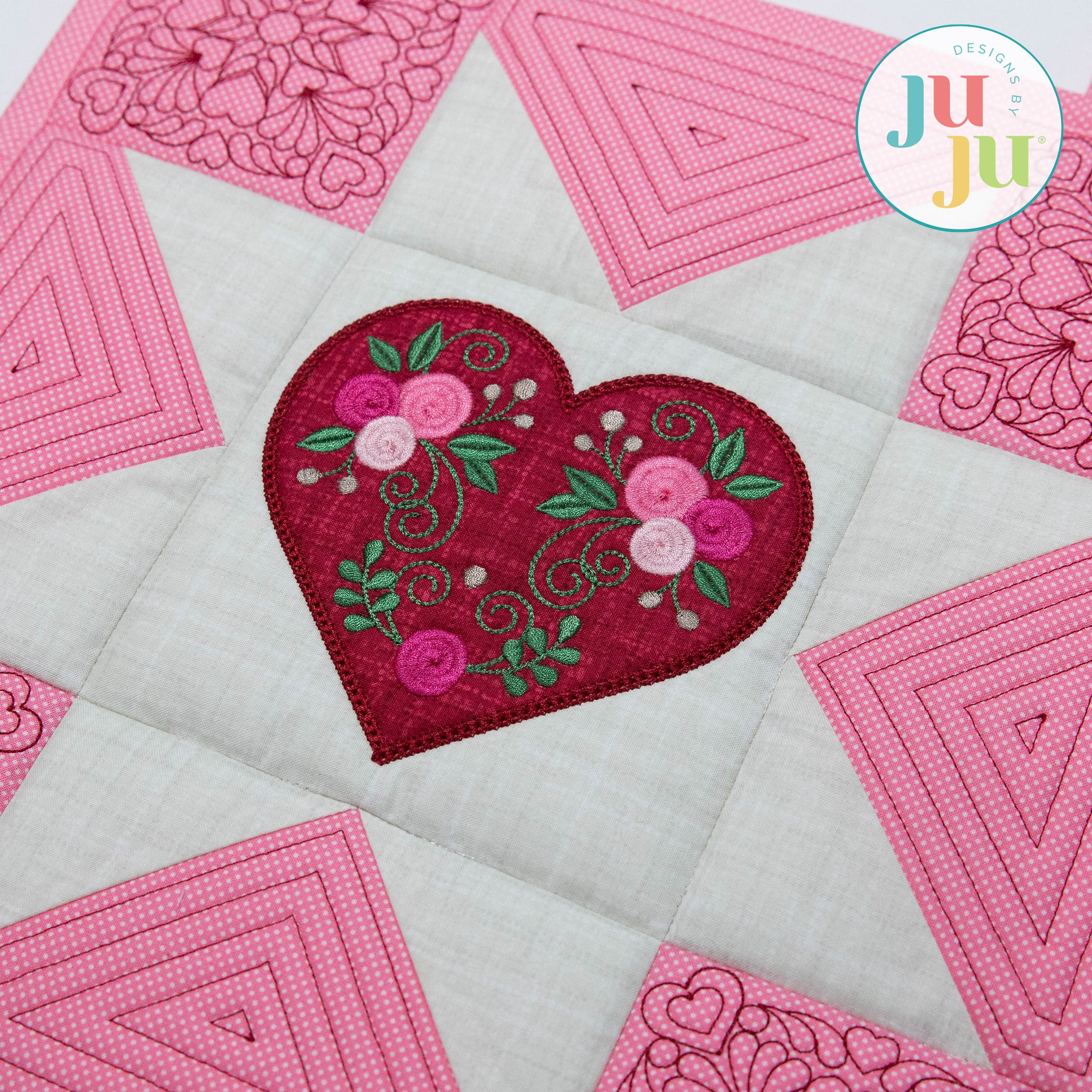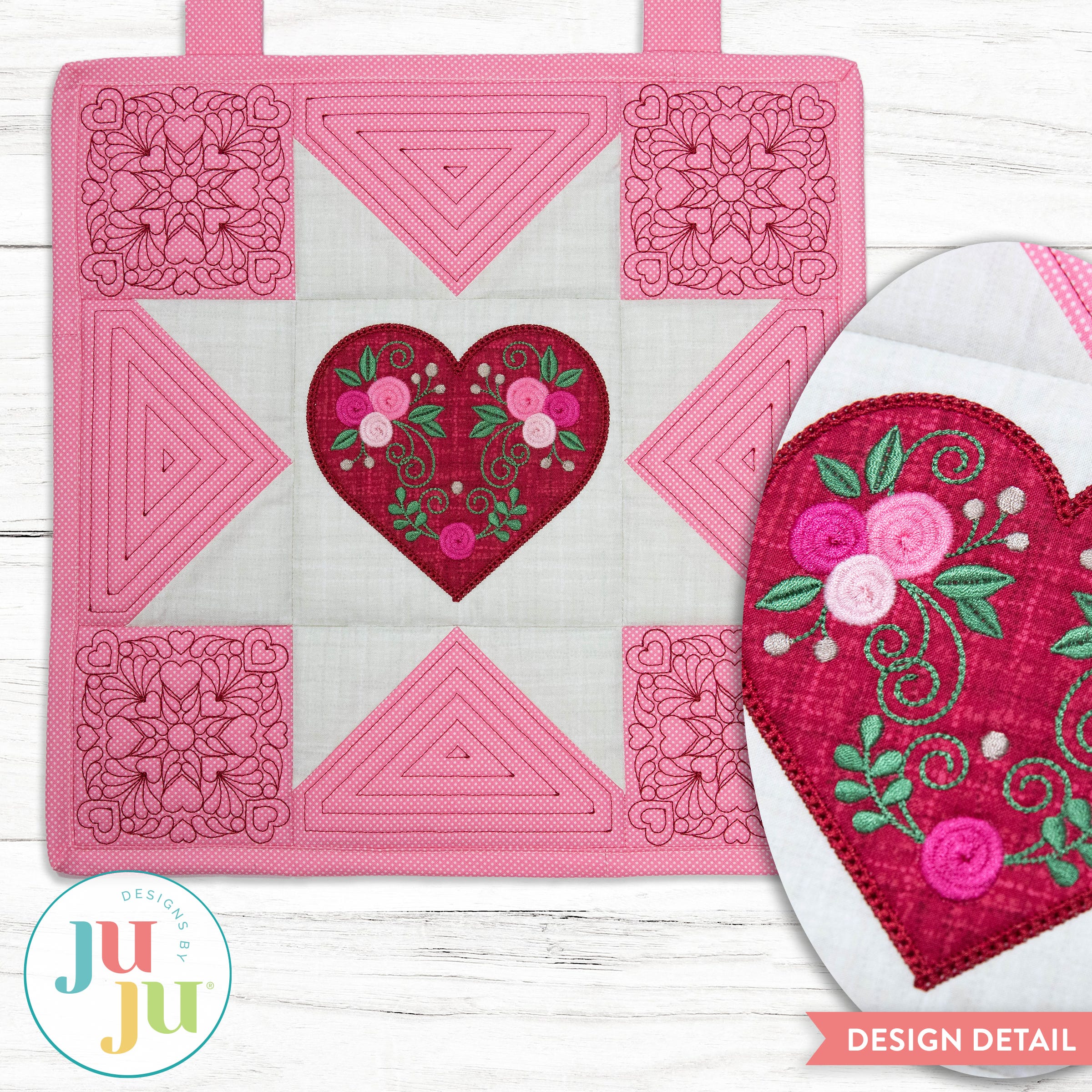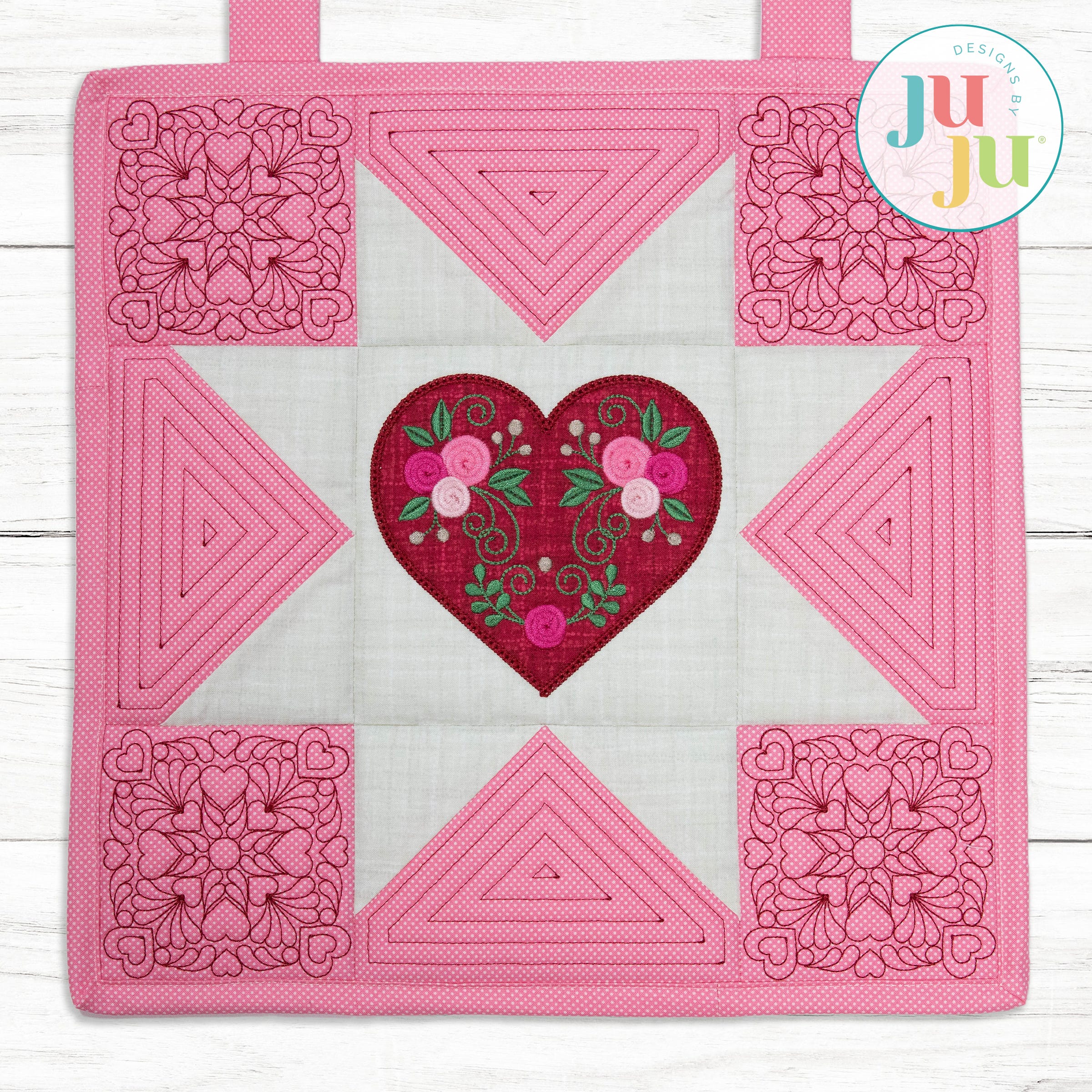 Decorate for Valentine's Day with our new mini quilt! This project is similar to a large sawtooth star quilt block. The center features an applique heart with lovely satin stitch roses. It's the perfect size for a little table decoration. Add tabs for a wall hanging, or make it a pillow!