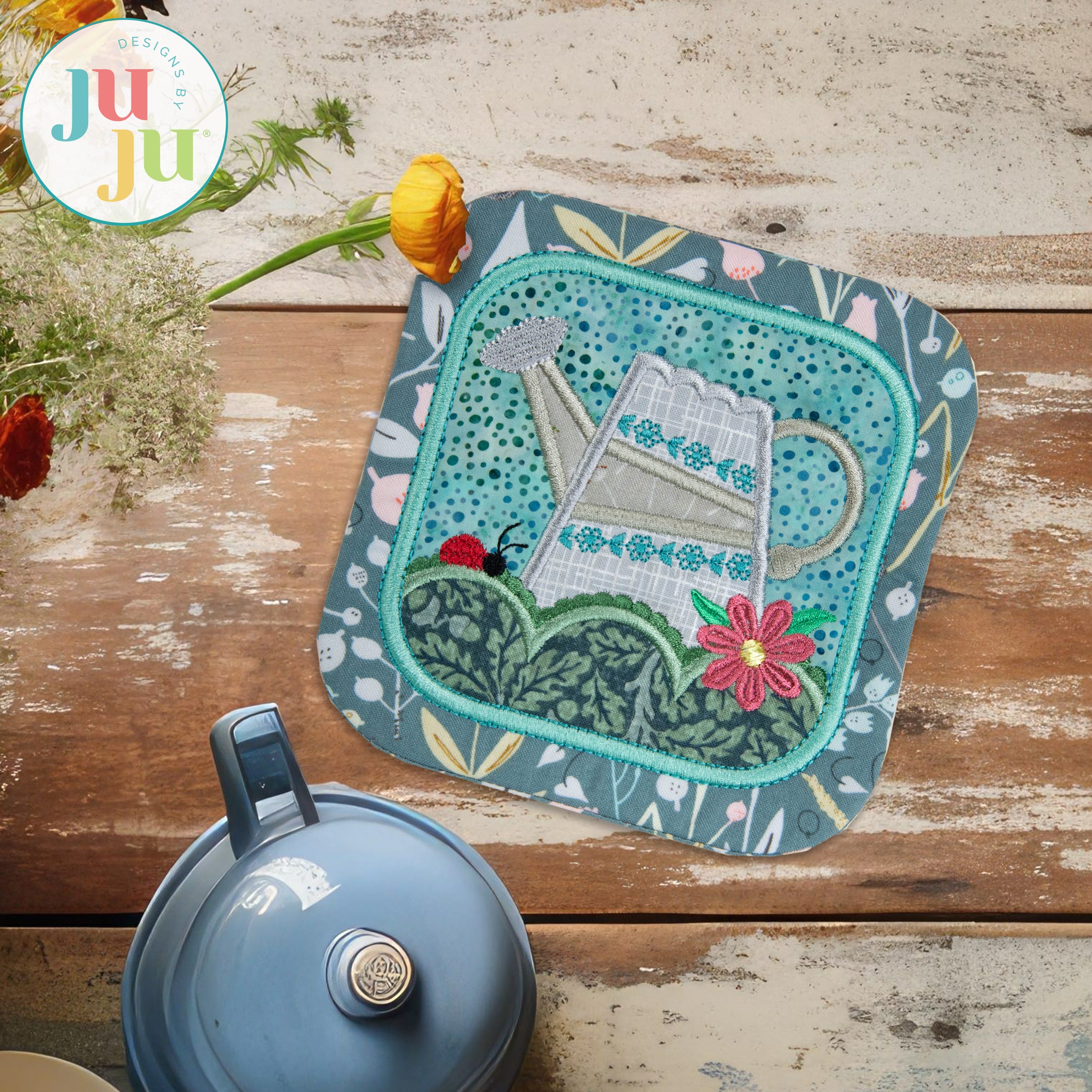 Designed to coordinate with our Modular Watering Can in-the-hoop project series! With a wide range of sizes, this Watering Can Coaster can be used as a mug rug, trivet, or candle mat.
