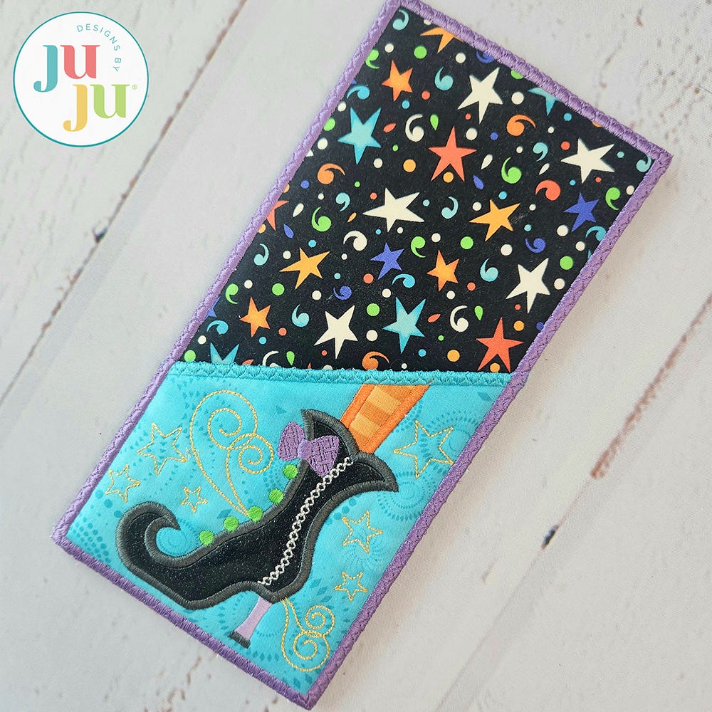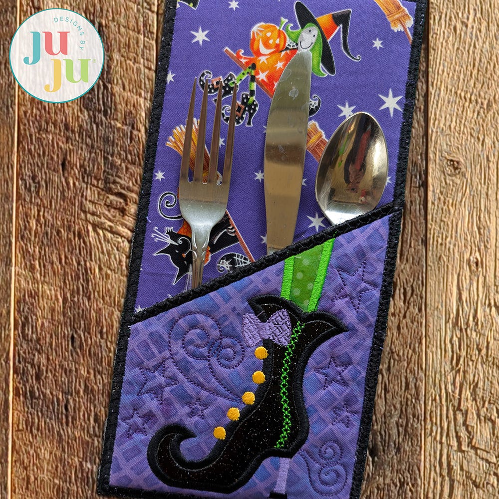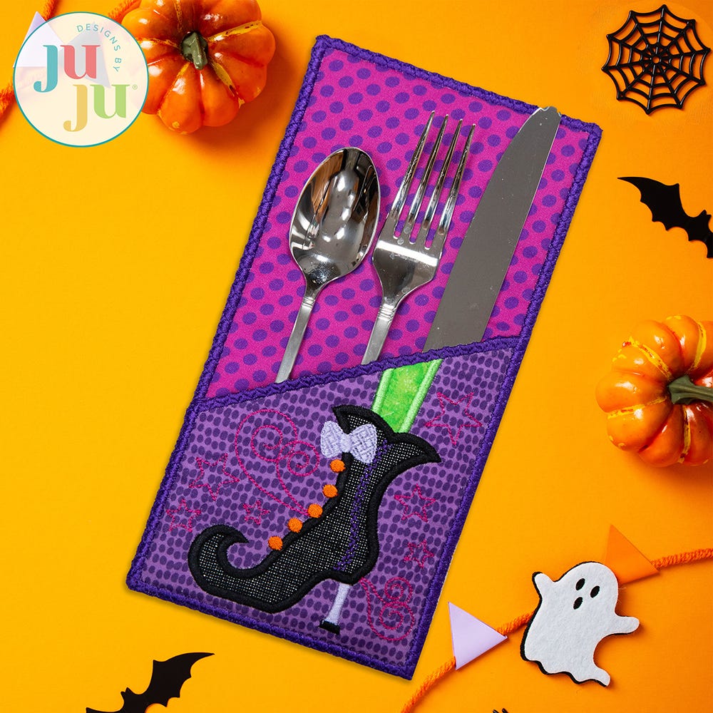 Add a touch of spooky style to your meals while keeping silverware neatly in place with this beautifully embroidered utensil holder! Featuring intricate stitched details, it adds both charm and functionality to your table setting. Our Witch Feet Utensil Holder is designed to coordinate with our Modular Witch Feet in-the-hoop project series.