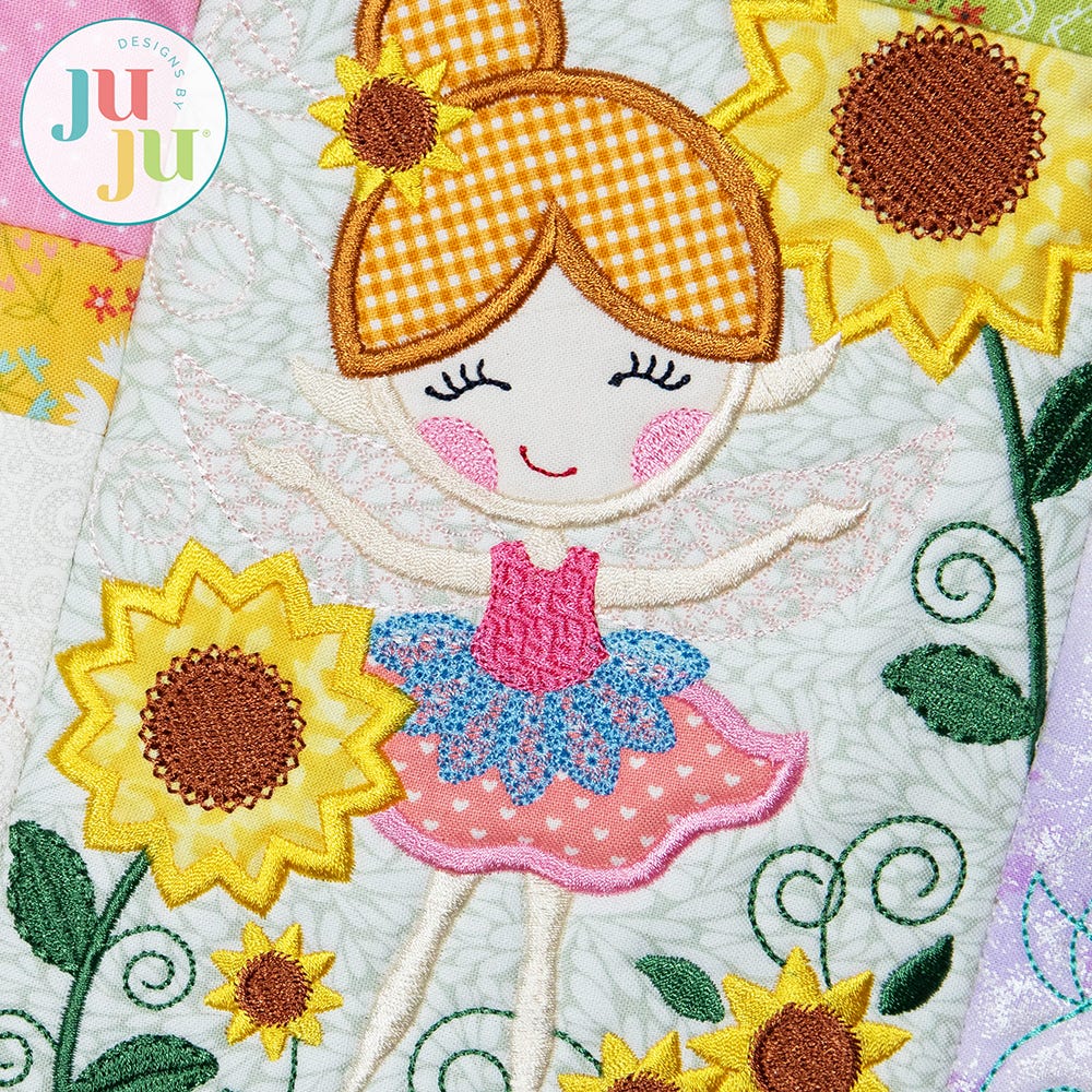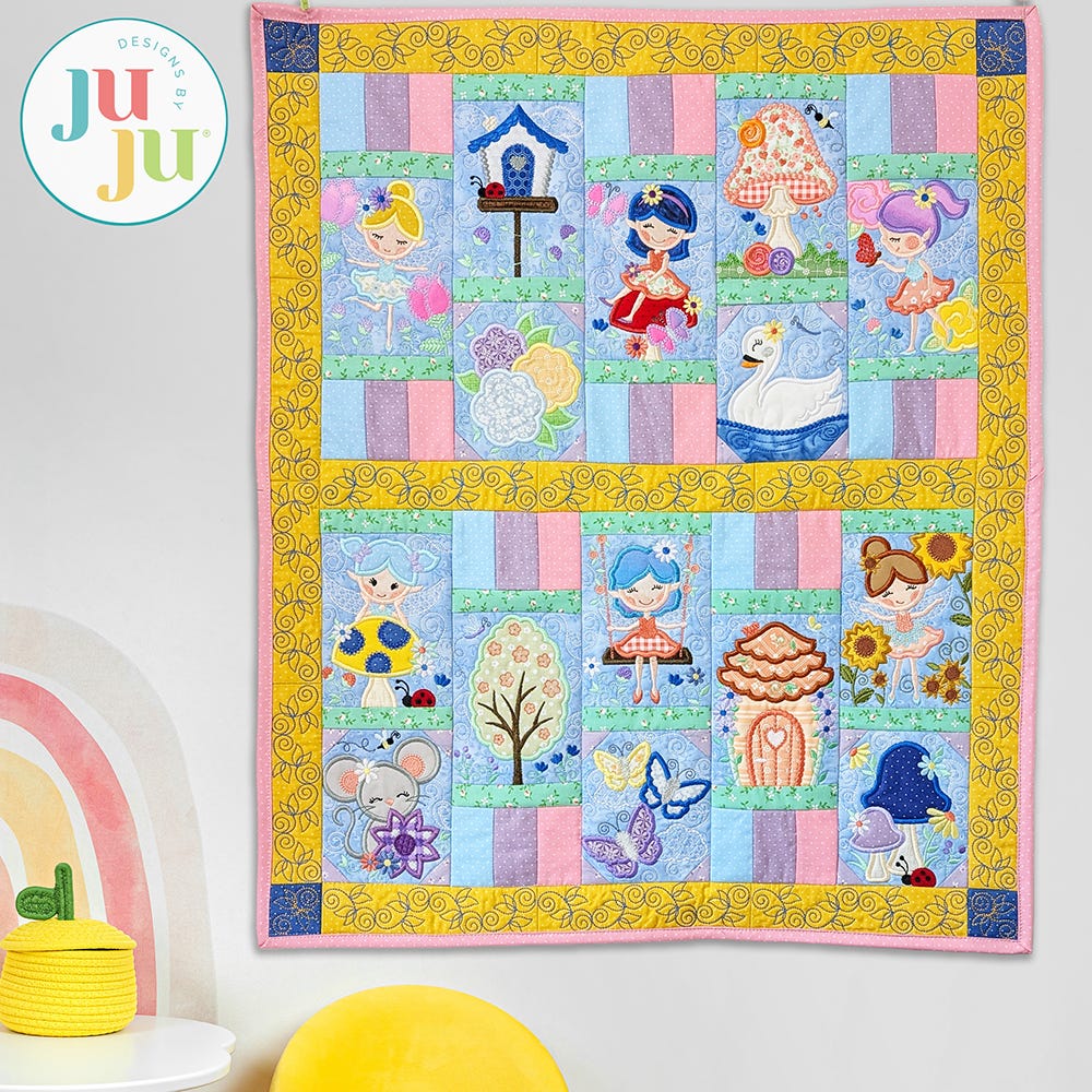 Cuteness overload! This sweet baby quilt is perfect for a girly woodland fairy nursery! The main applique blocks feature dainty fairies, flowers, mushrooms, butterflies and more, finished off with stitch-and-flip edges or corners. The border blocks have a floral vine quilting pattern.